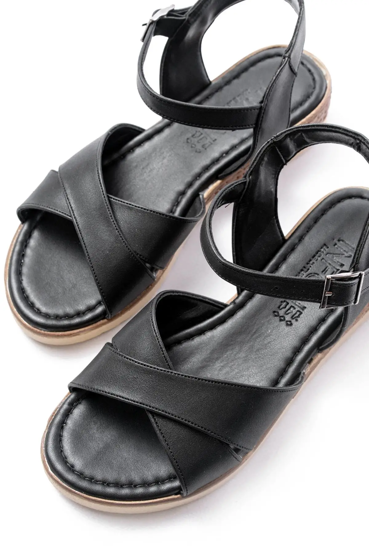 692-564 Siyah Ortopedik Taban Çapraz Tokalı Kadın Sandalet