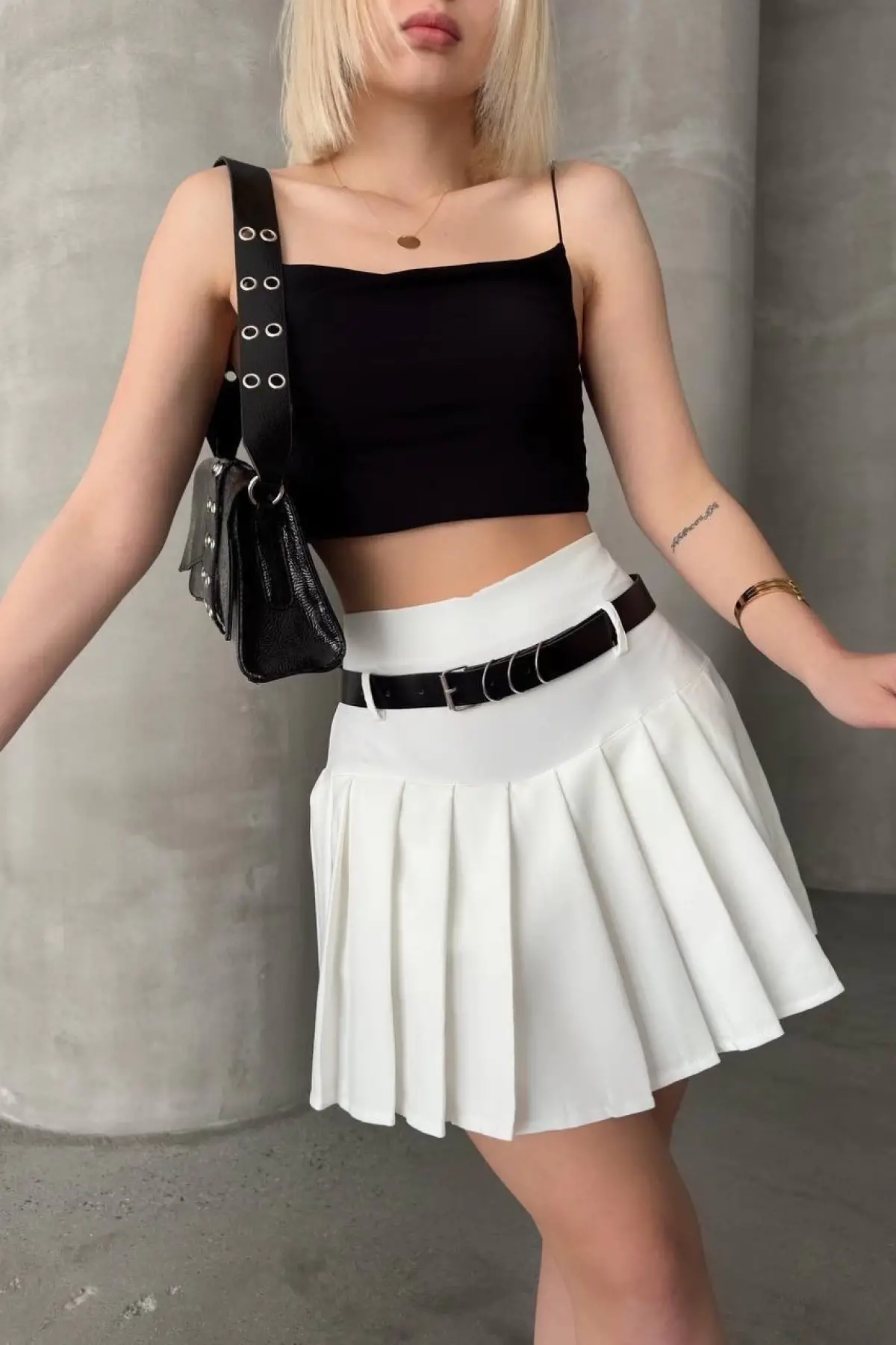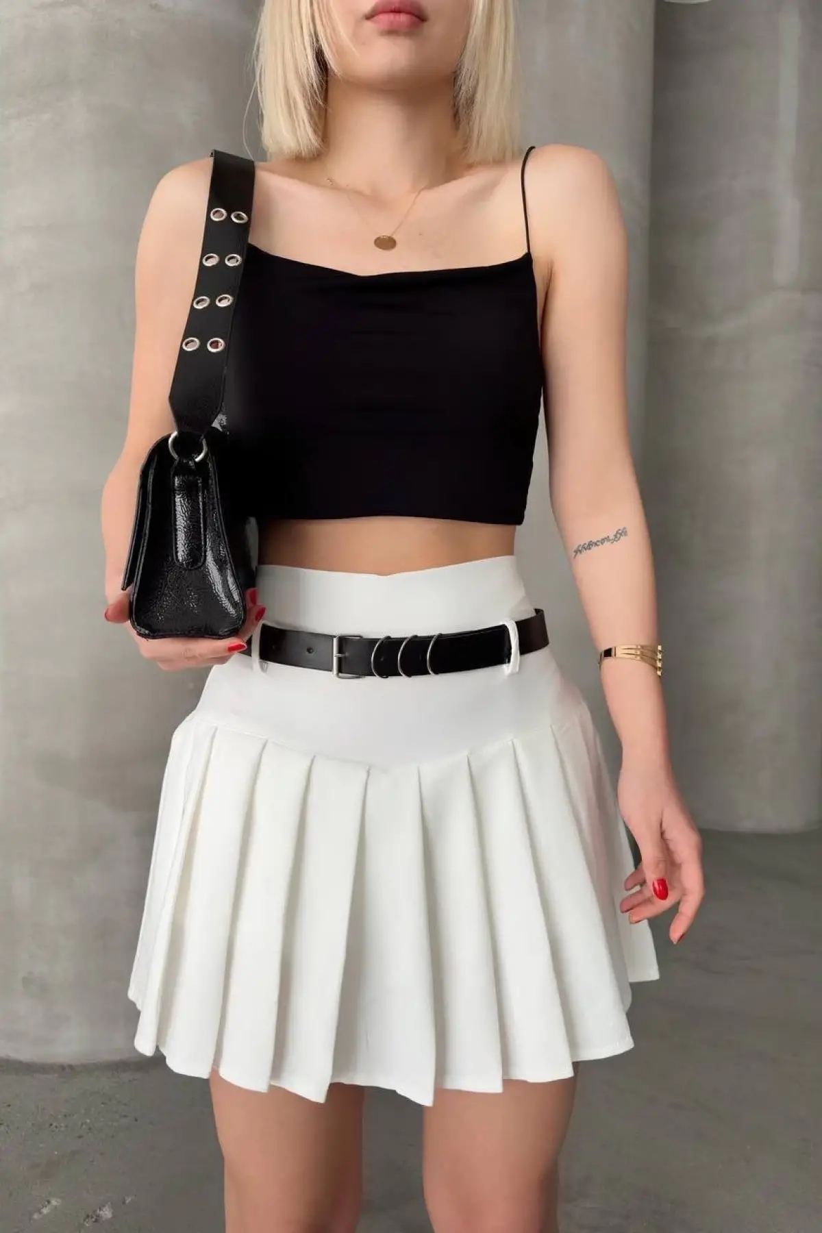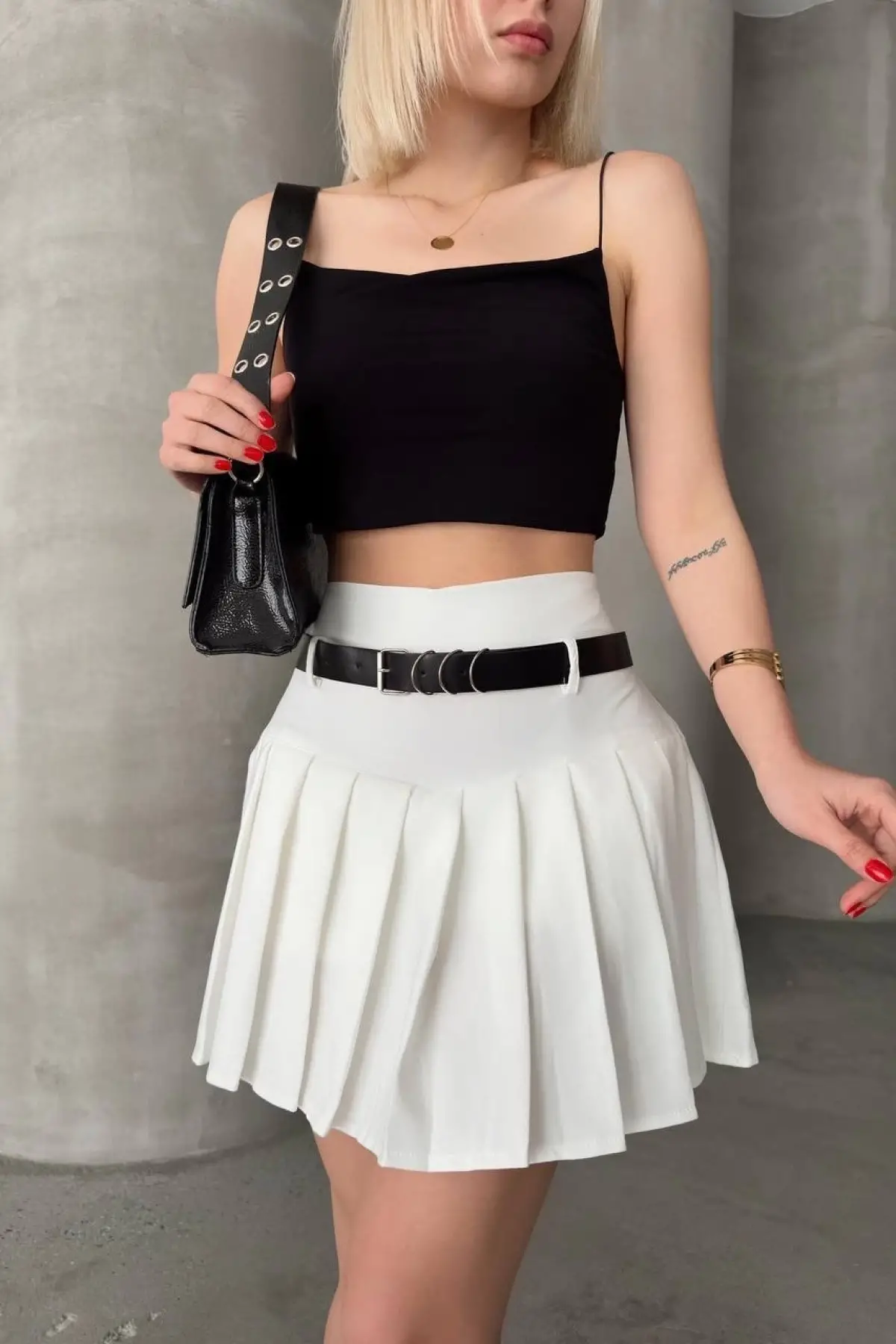 Kemerli Piliseli Şort Etek Beyaz S25305