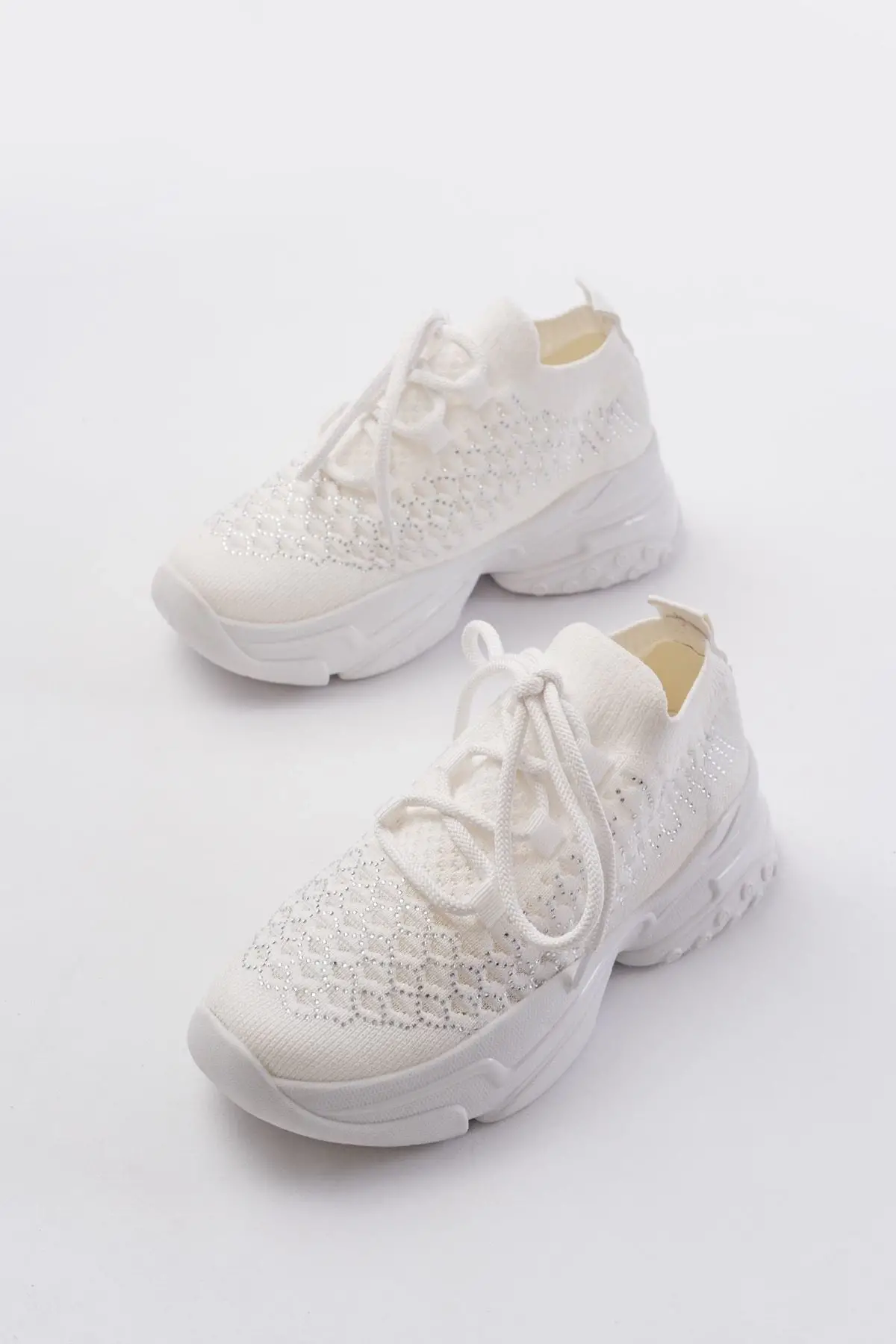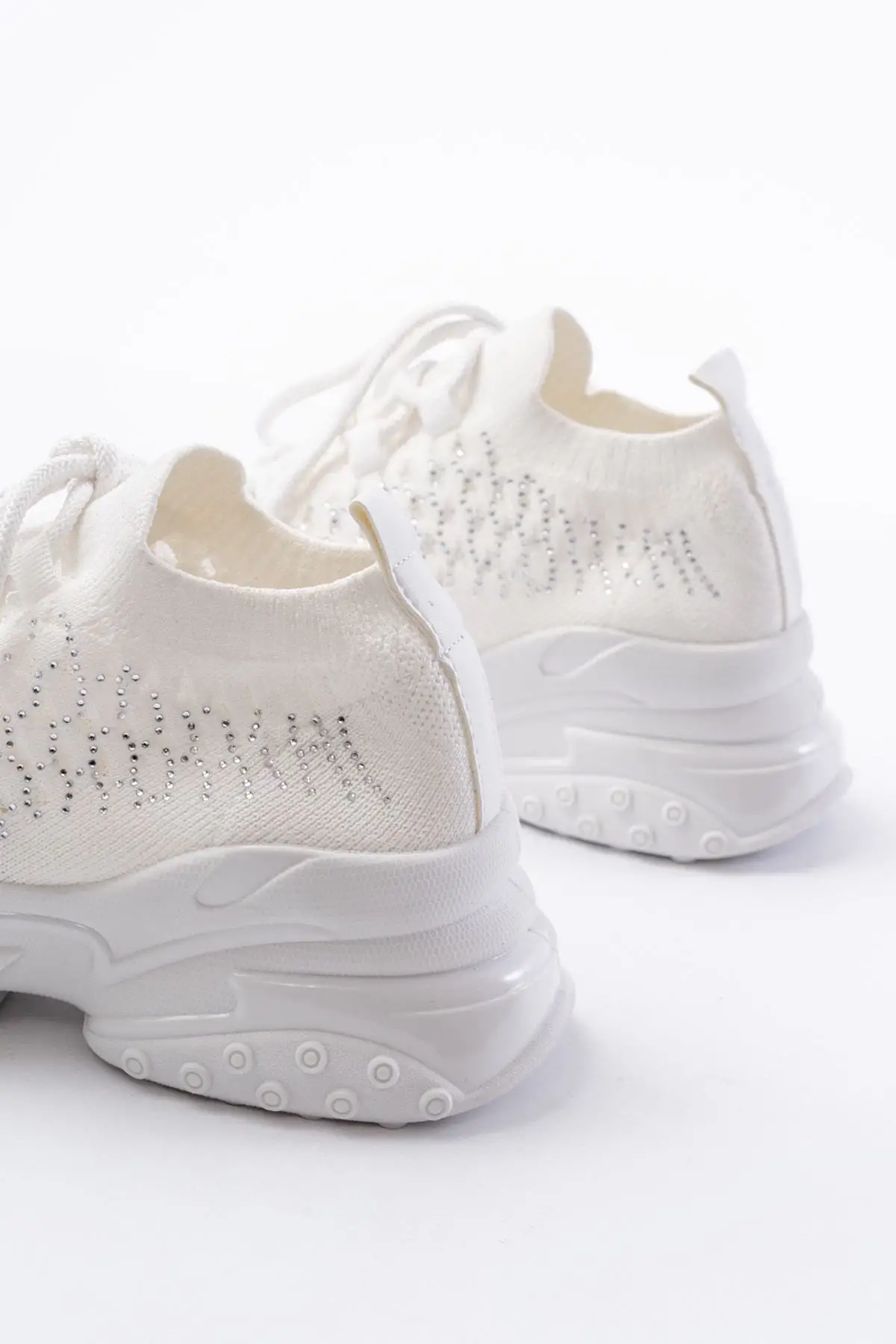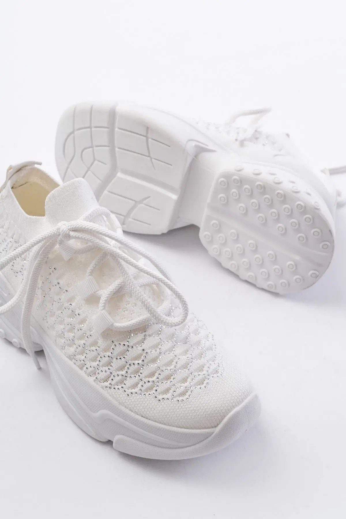 Sp-2024 Beyaz Günlük Bağcıklı Fileli Taş Aksesuarlı Kadın Spor Ayakkabı