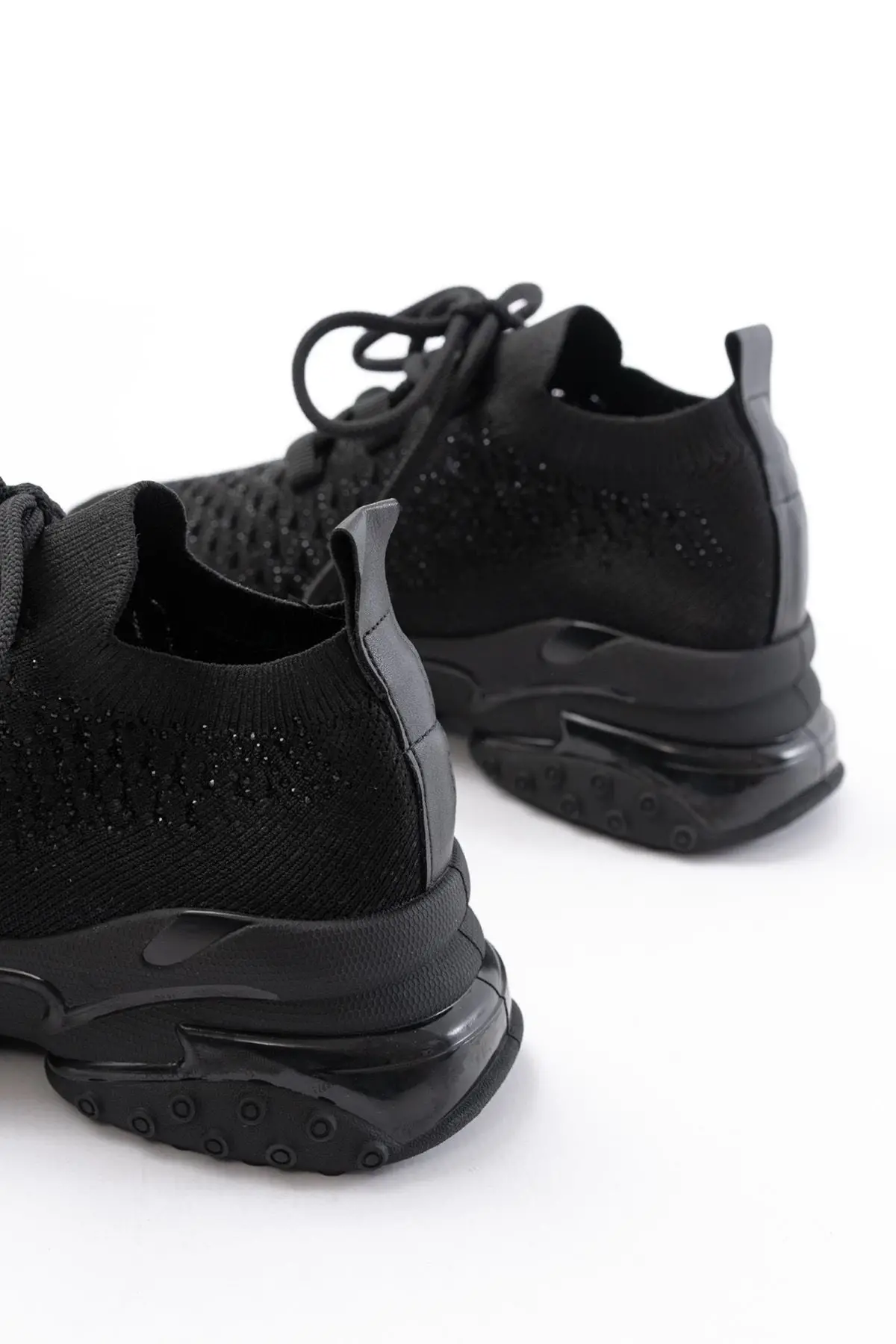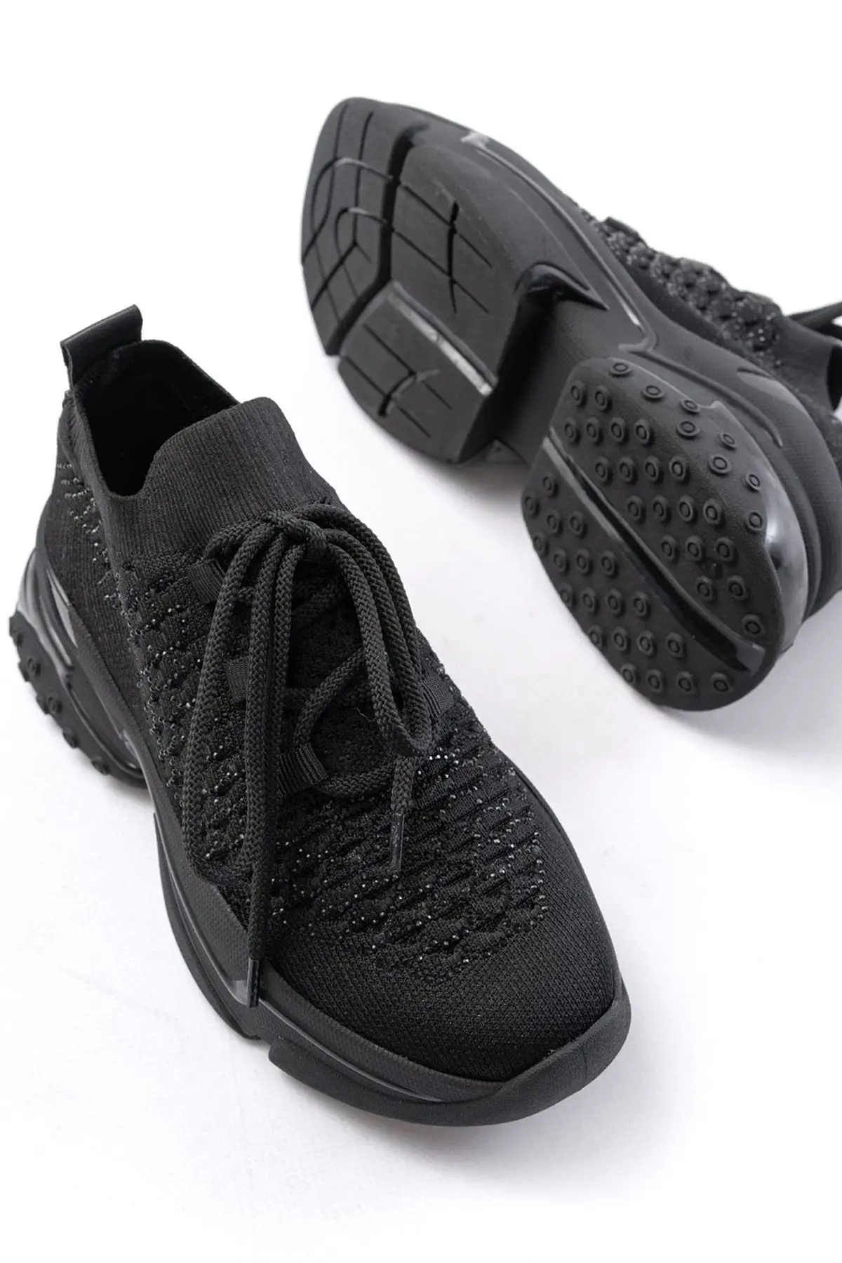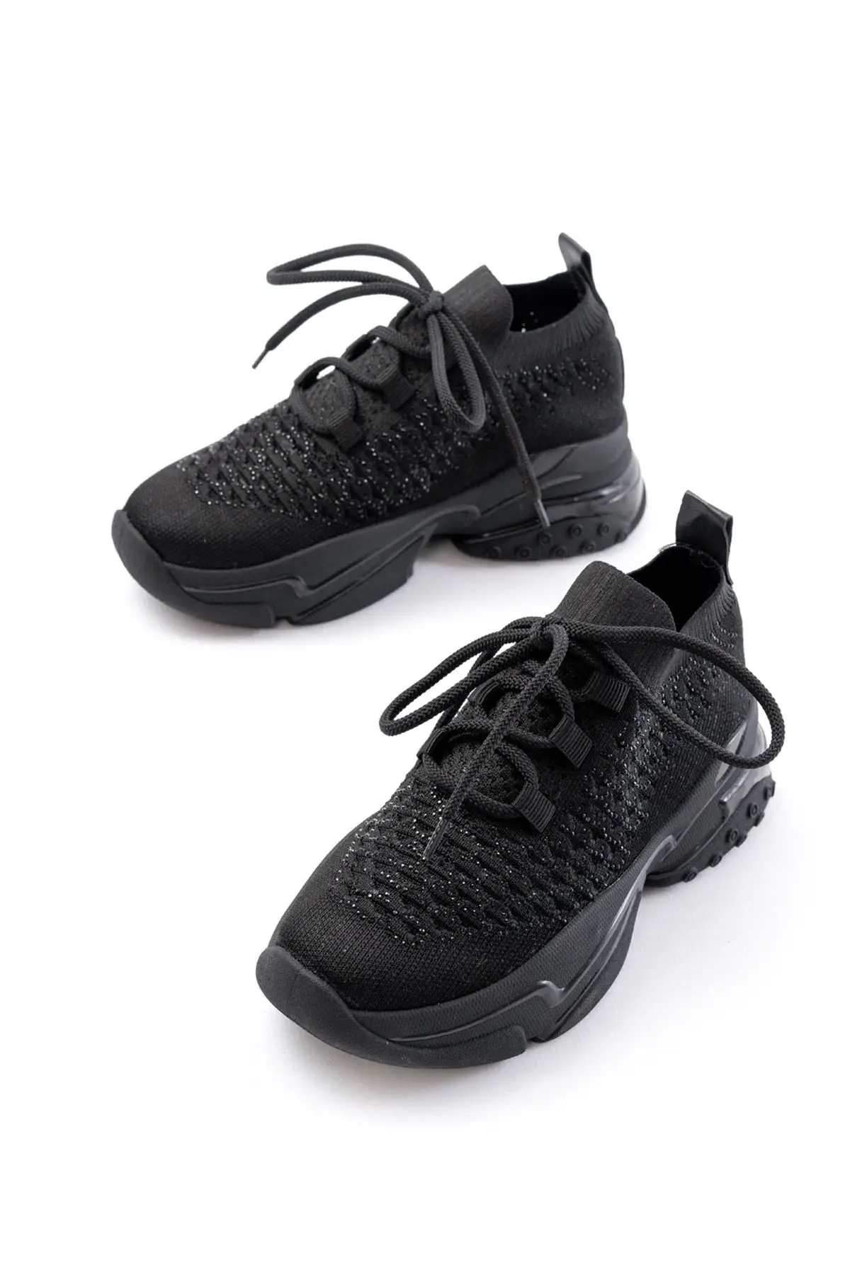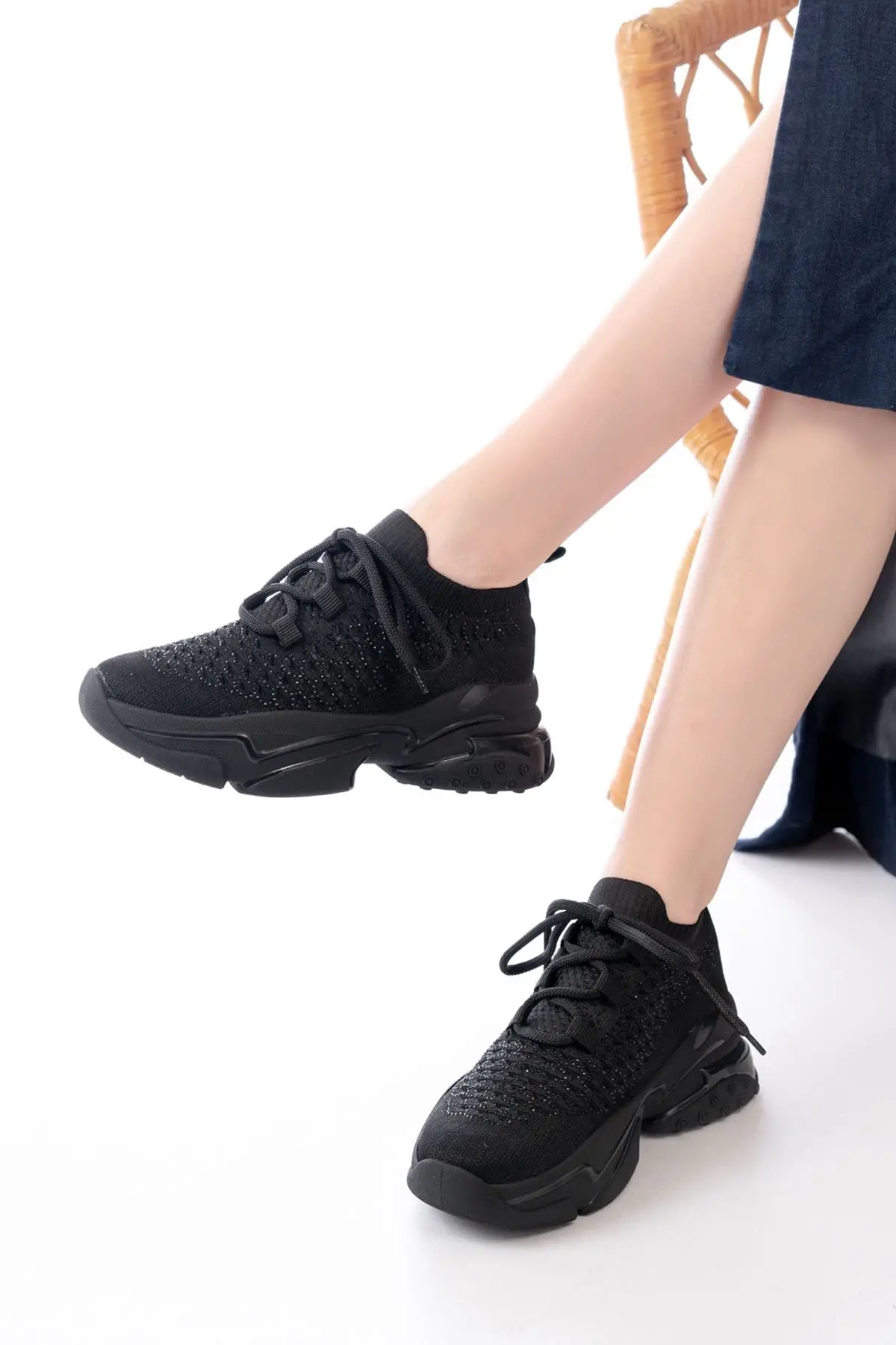 Sp-2024 Siyah Günlük Bağcıklı Fileli Taş Aksesuarlı Kadın Spor Ayakkabı