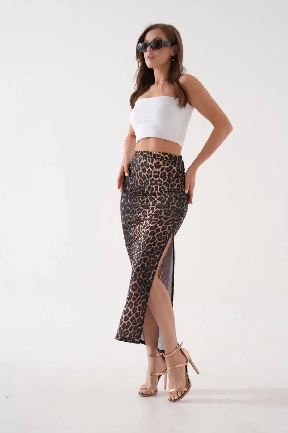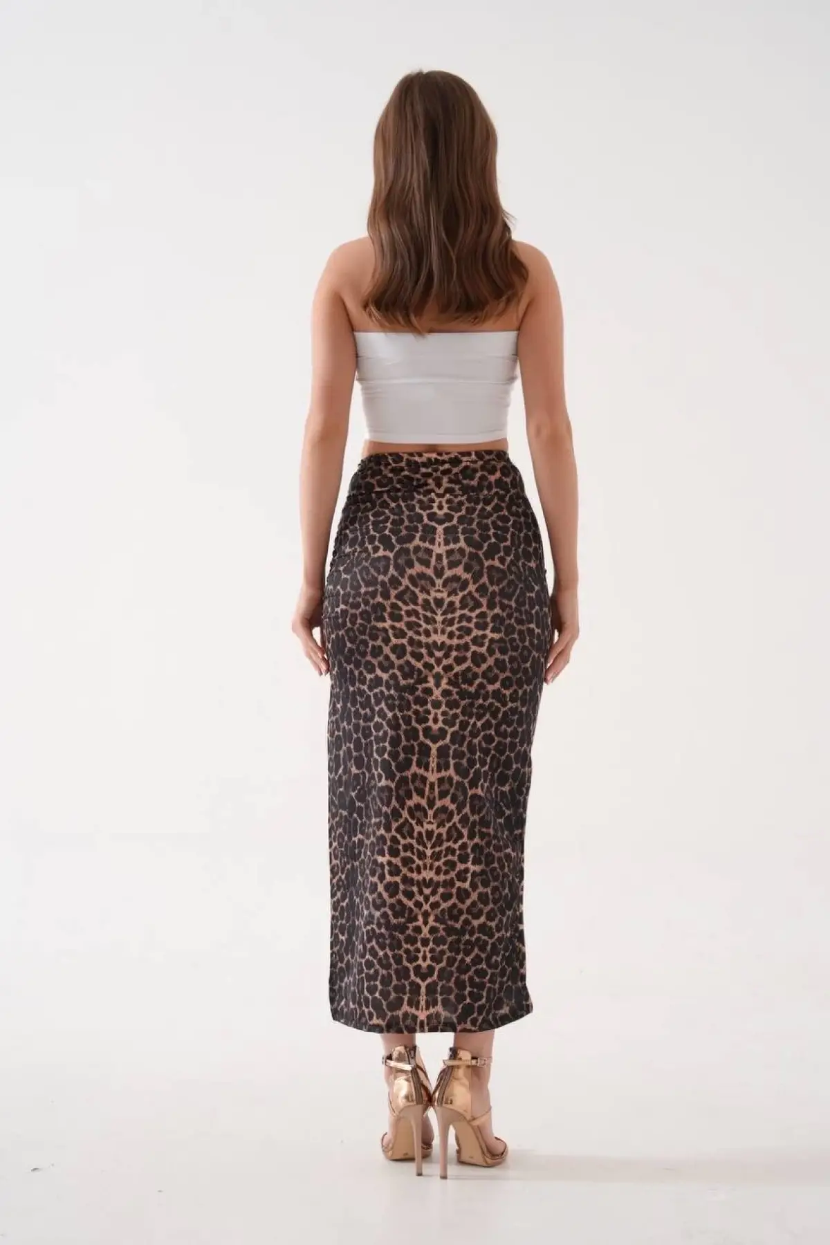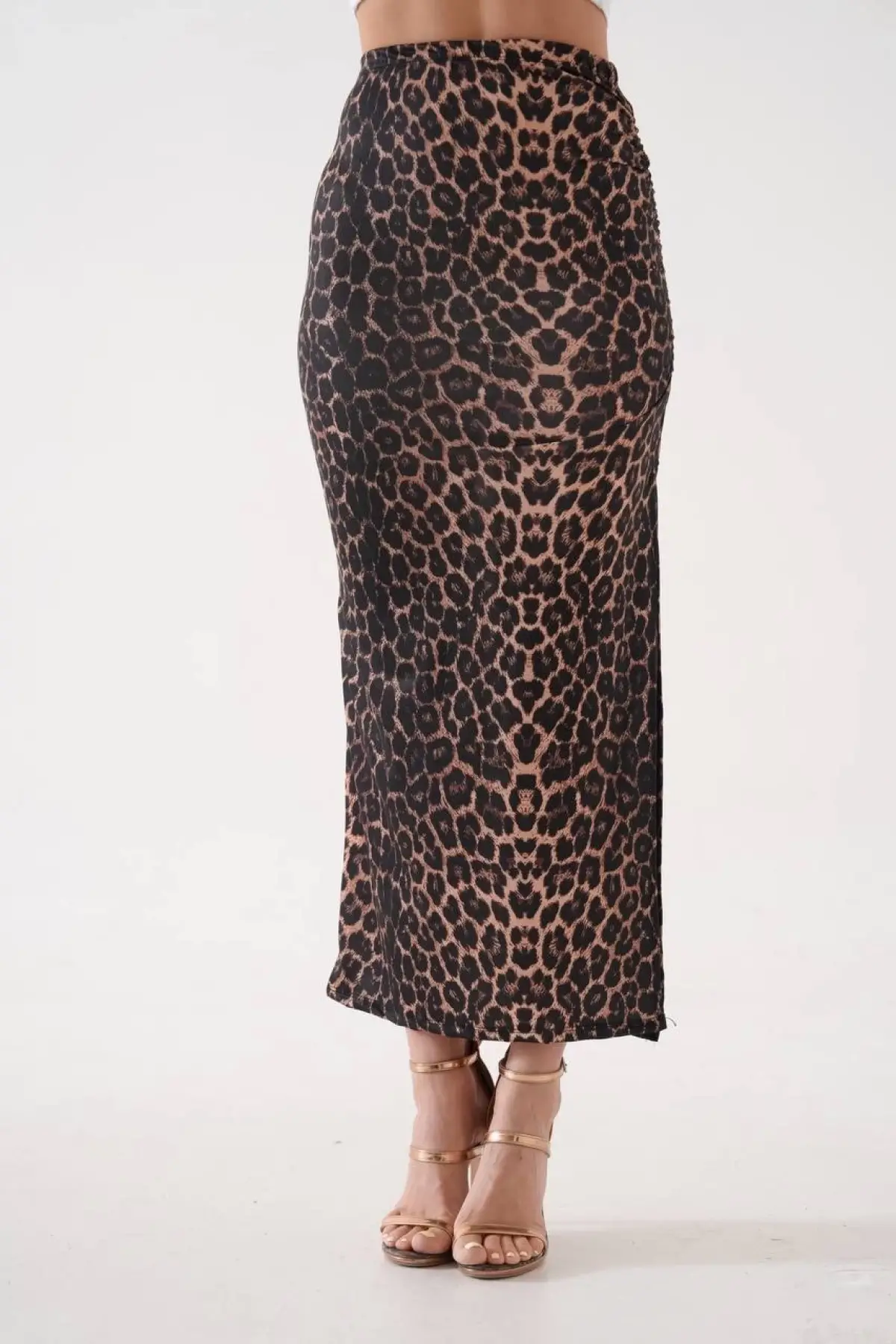 Uzun Yırtmaçlı İnce Kumaş Etek Leopar