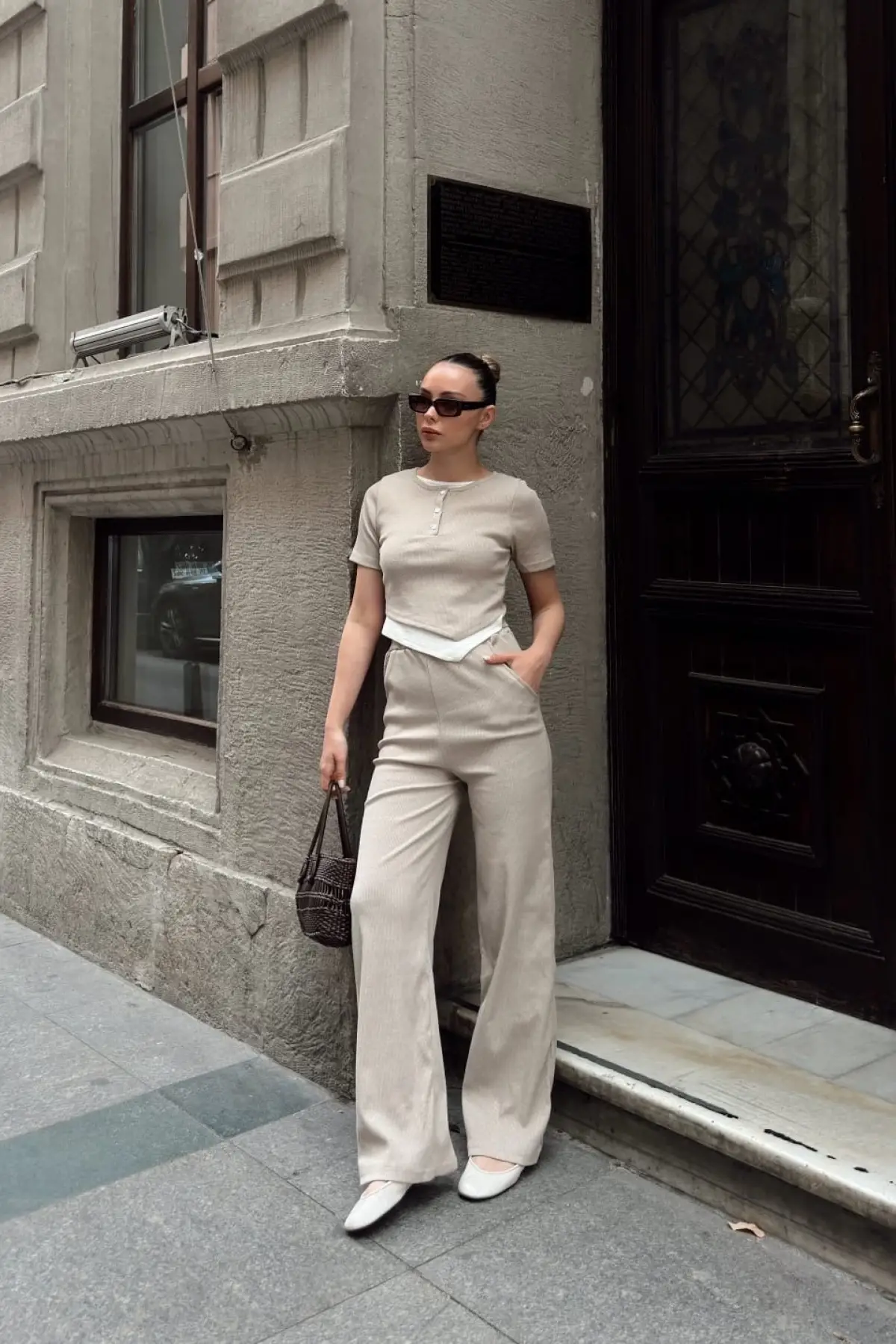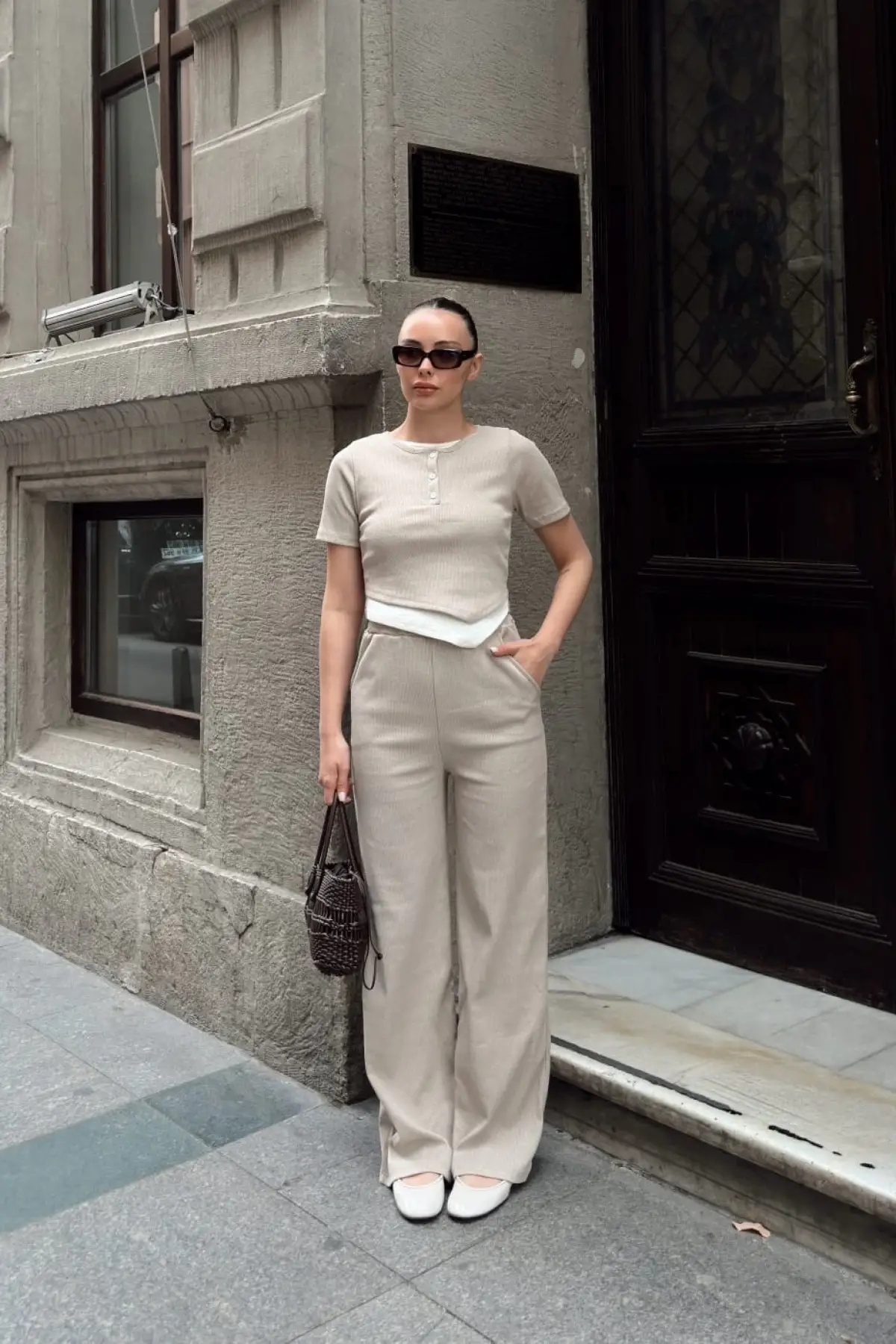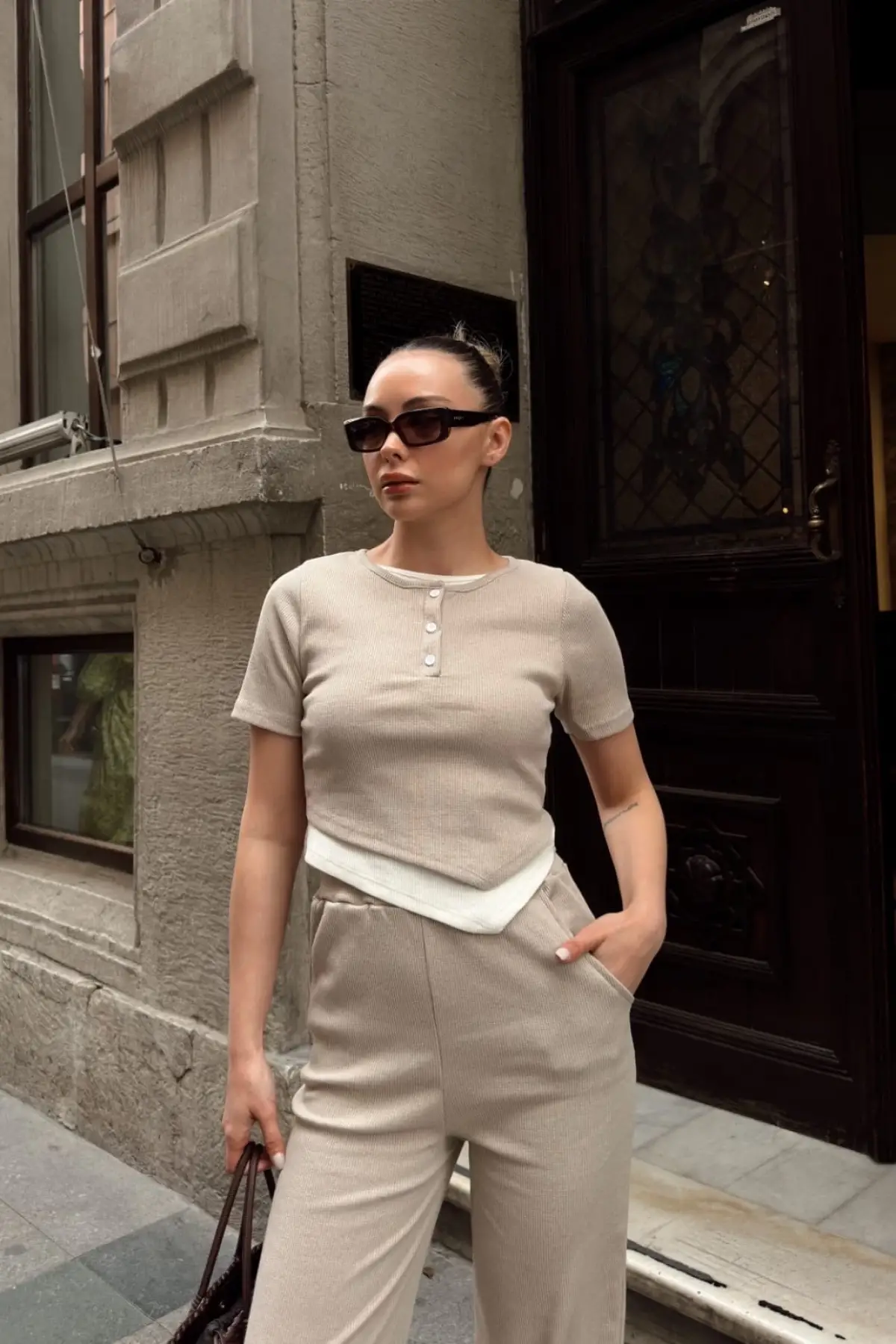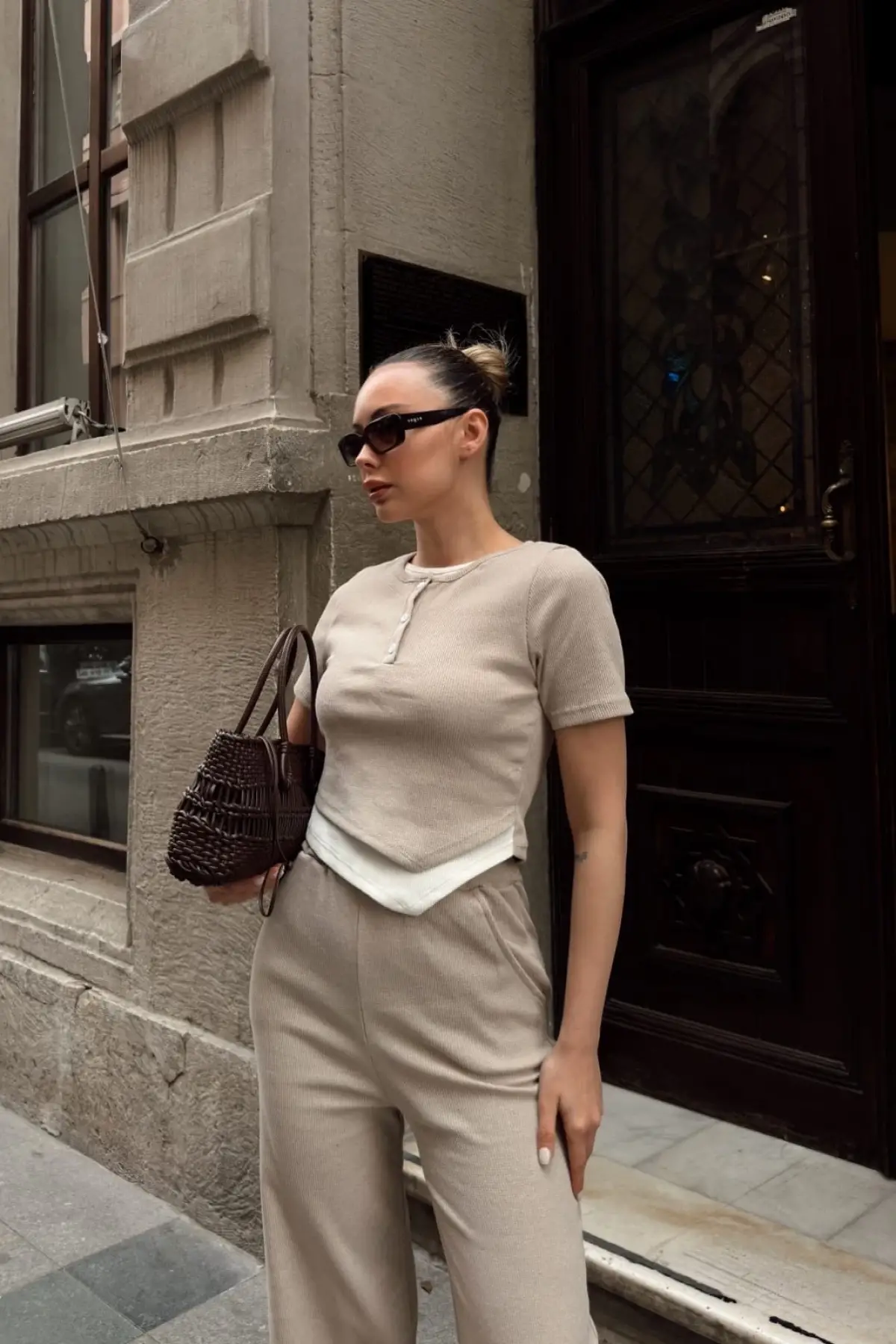 Düğme Yakalı Bej Alt Üst Takım S3943