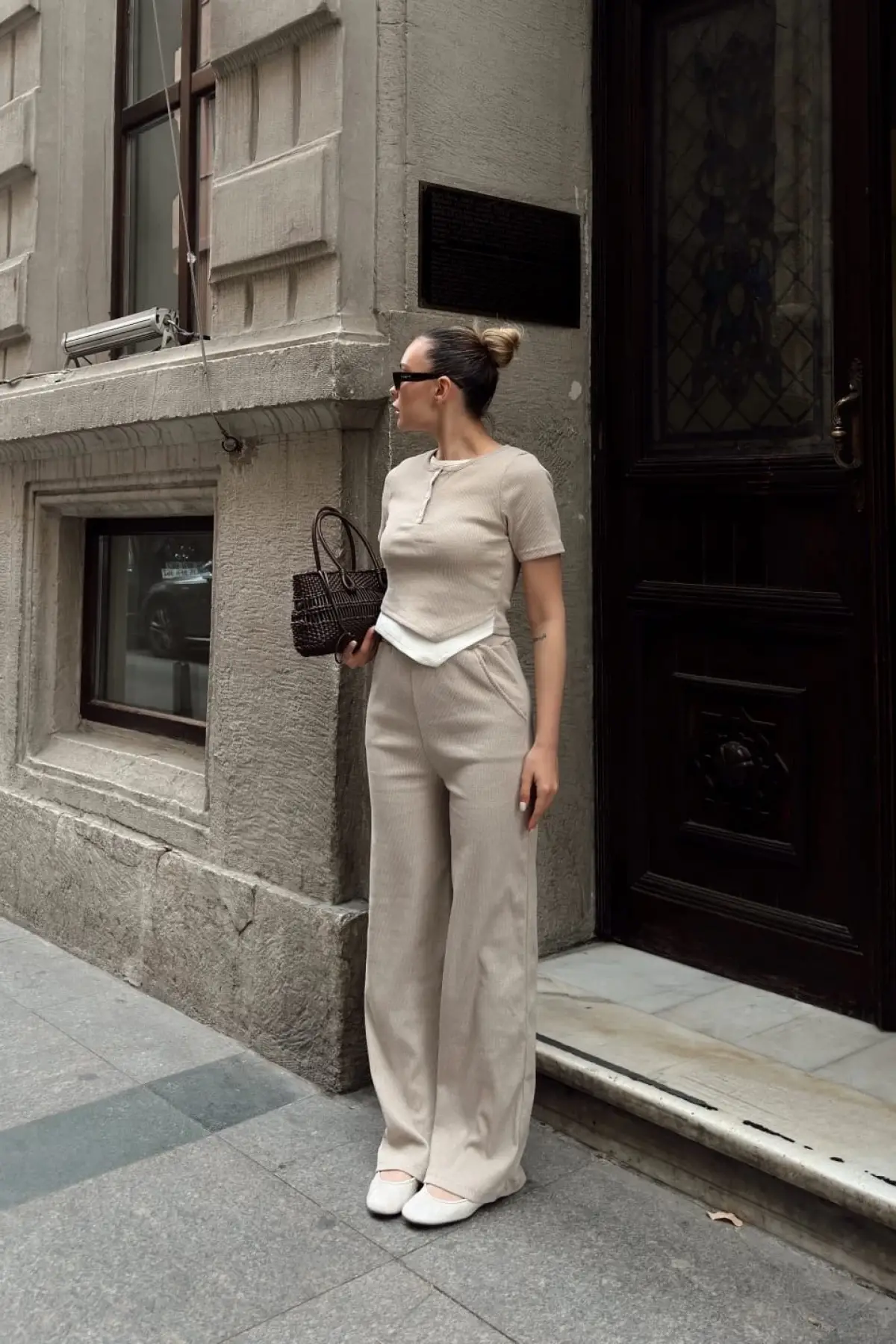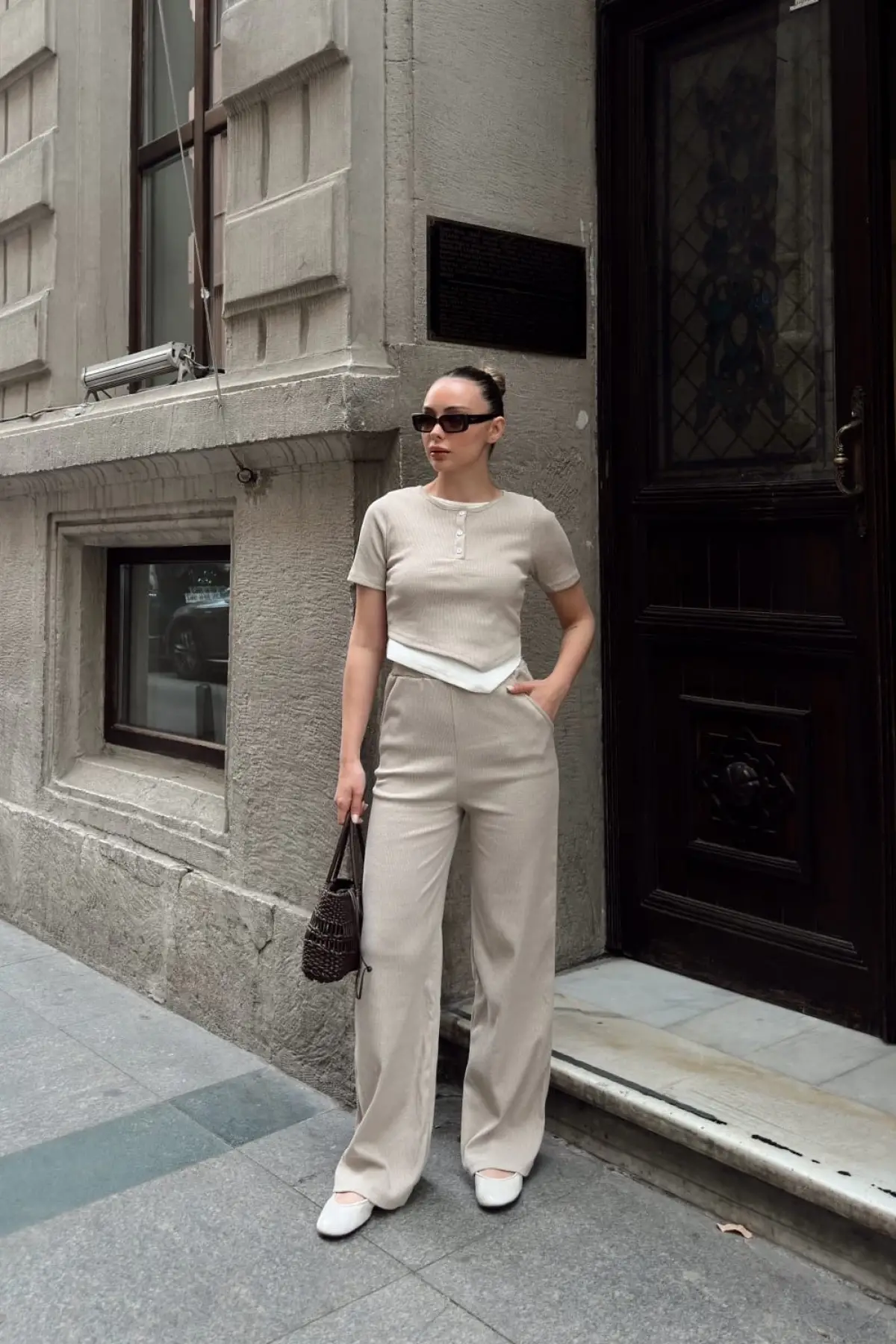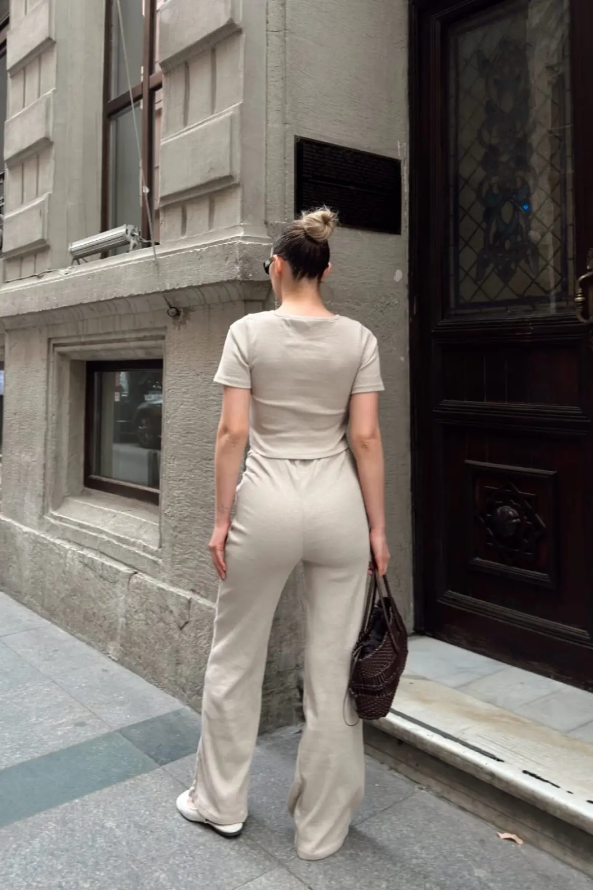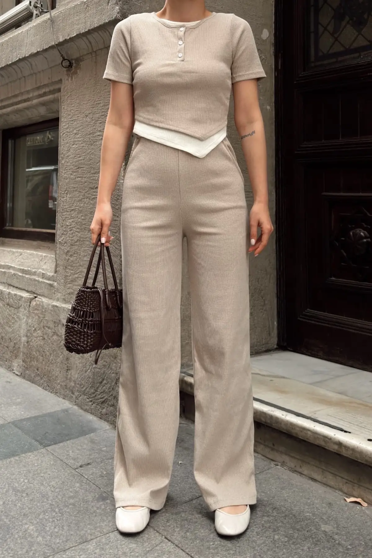 Düğme Yakalı Bej Alt Üst Takım S3943