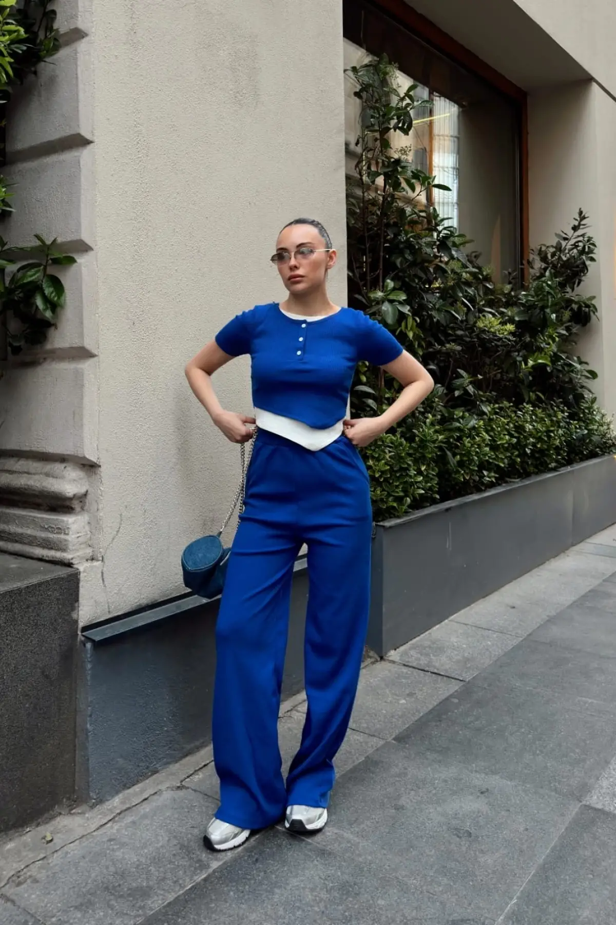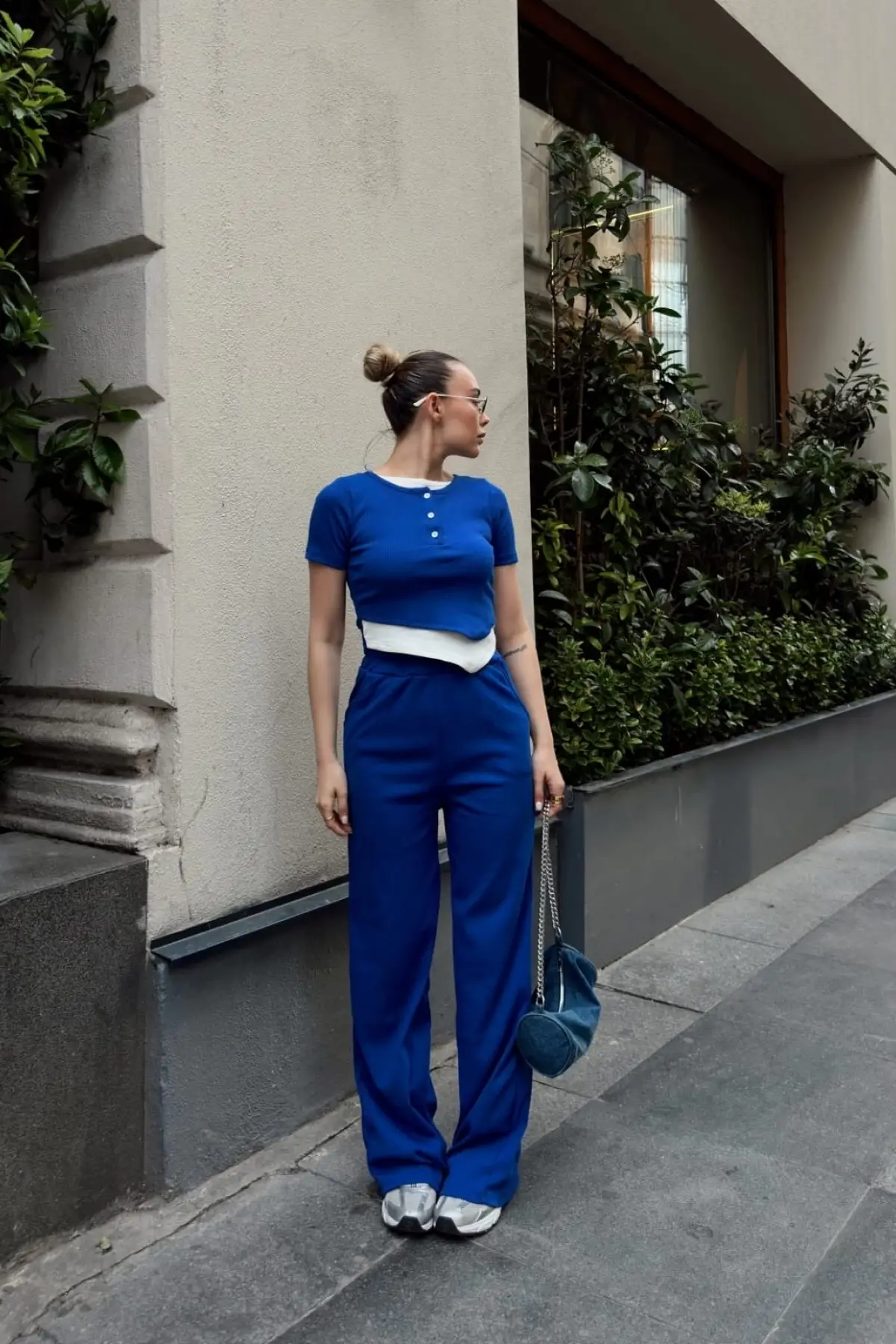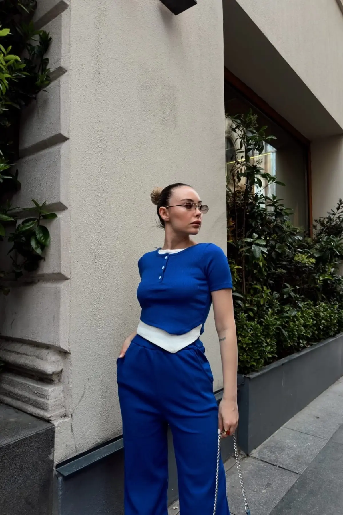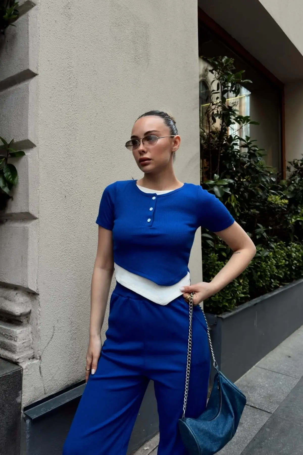 Düğme Yakalı Saks Alt Üst Takım S3943