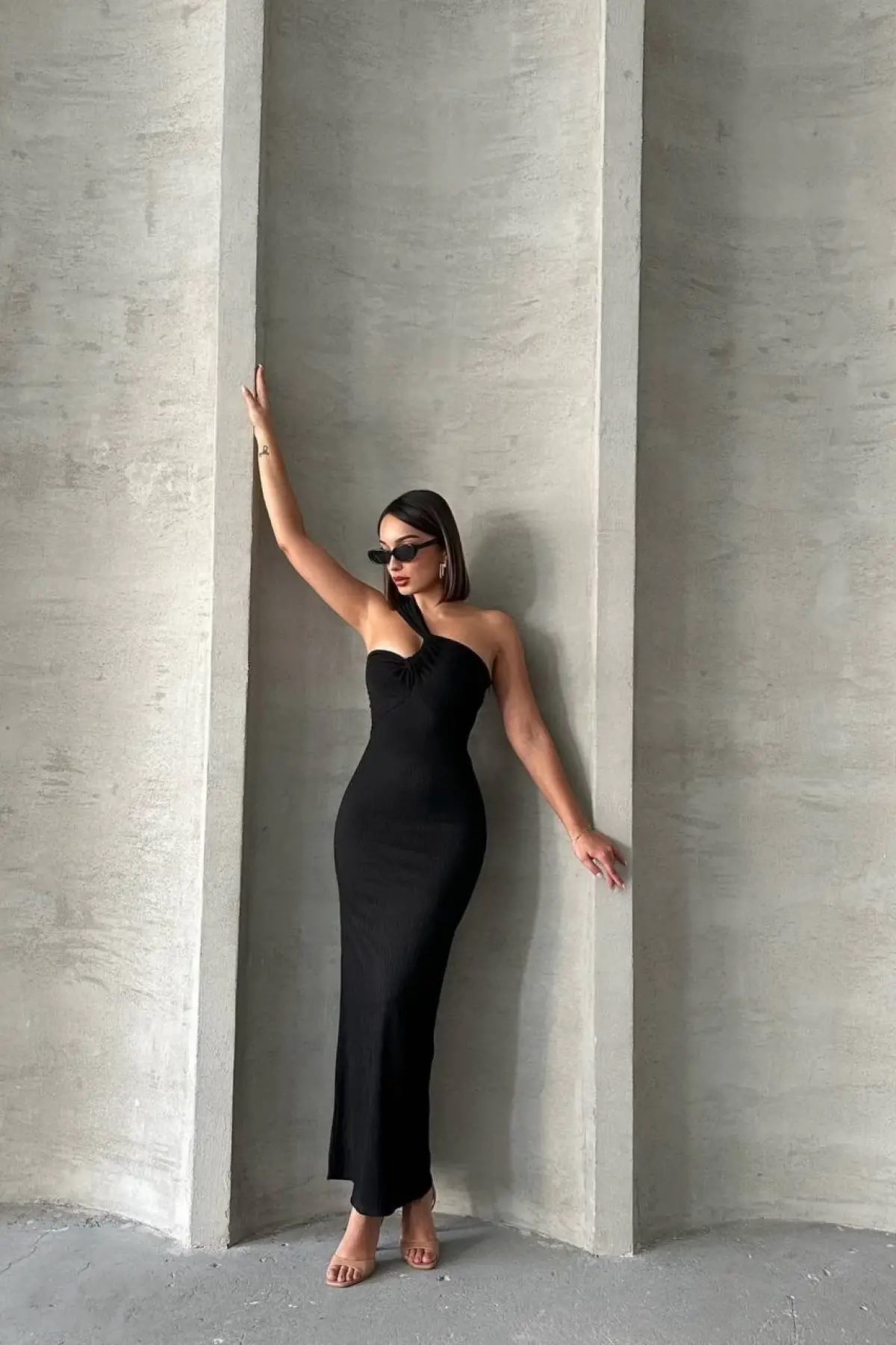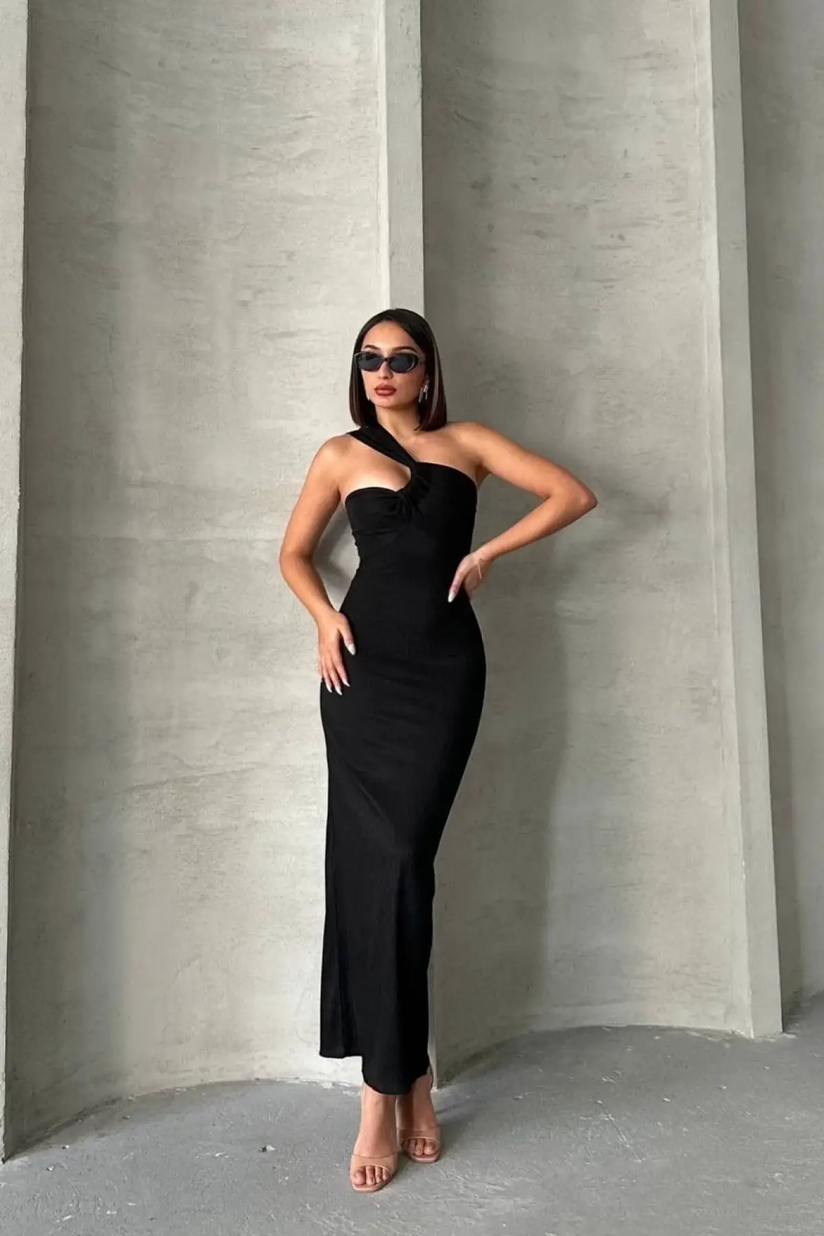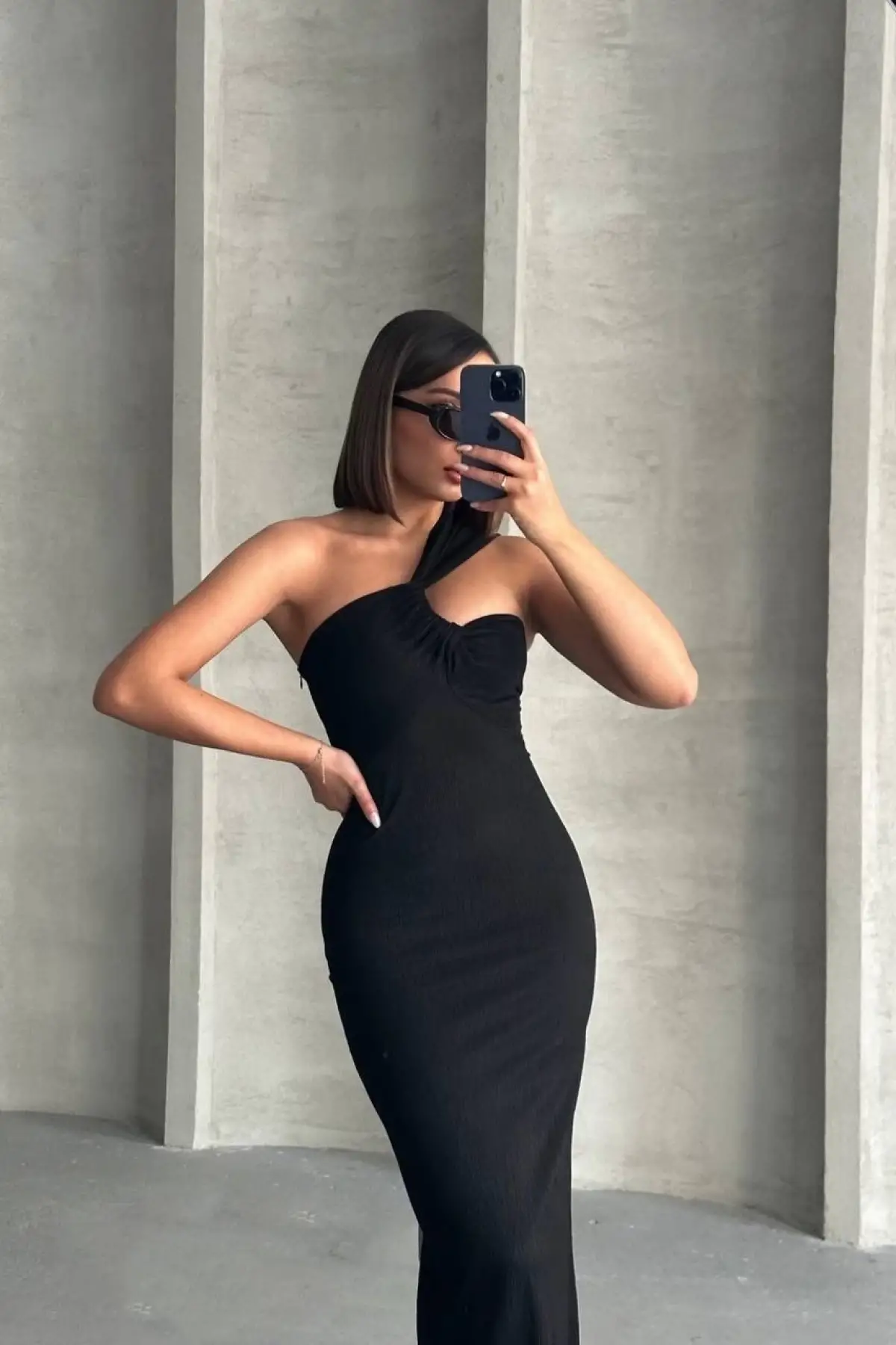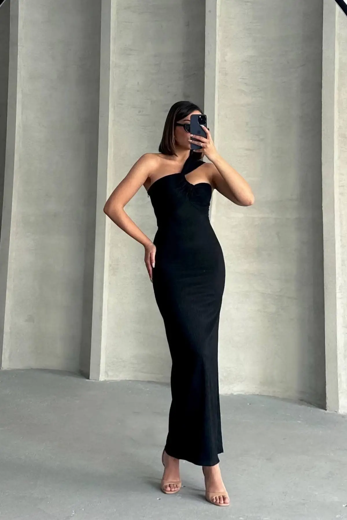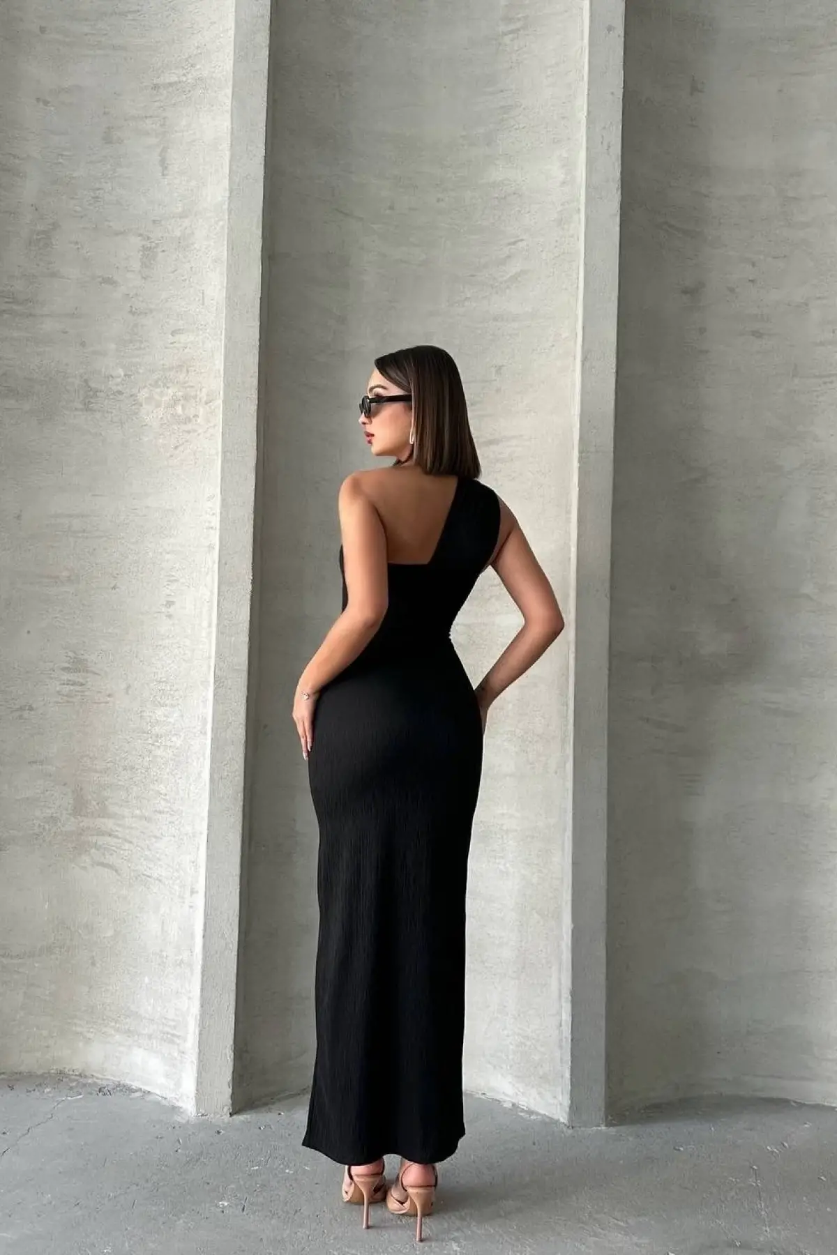 Krinkıl Tek Omuz Uzun Elbise Siyah S25455