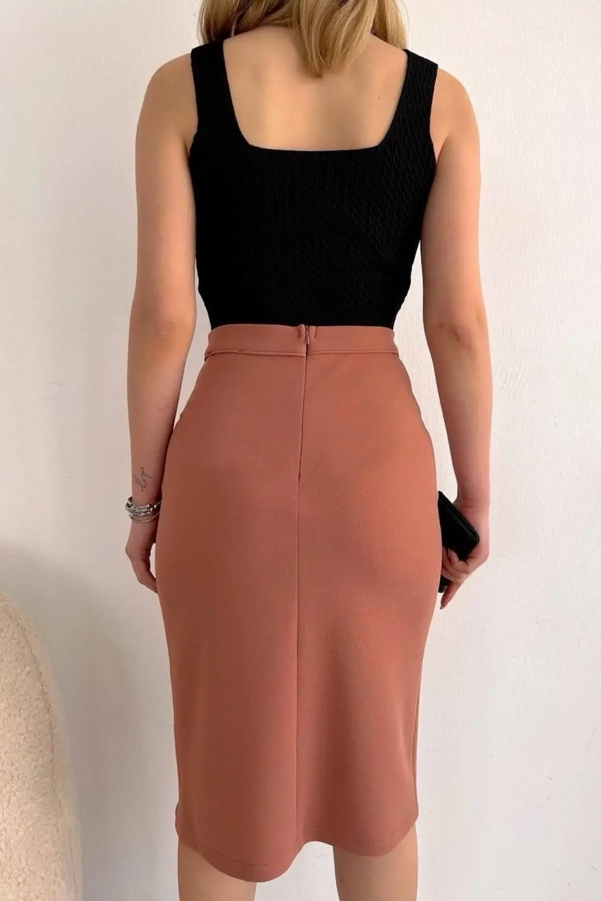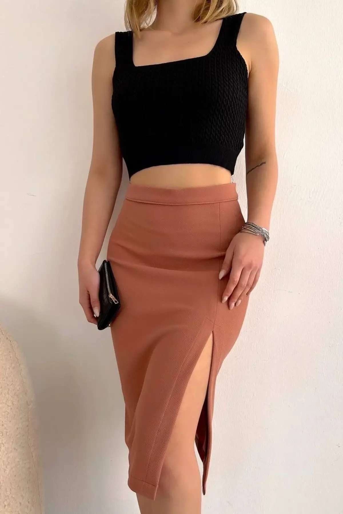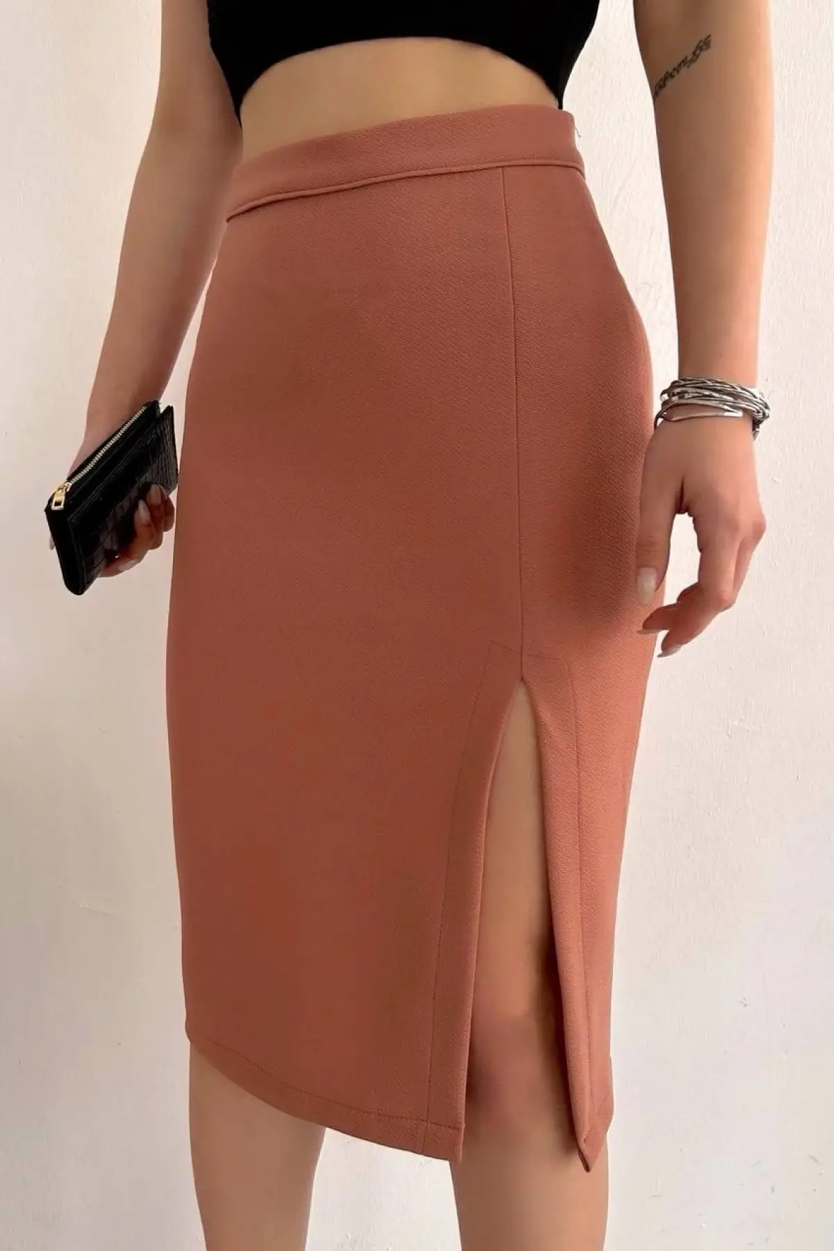 Uzun Midi Boy Yırtmaçlı Etek Somon S24907