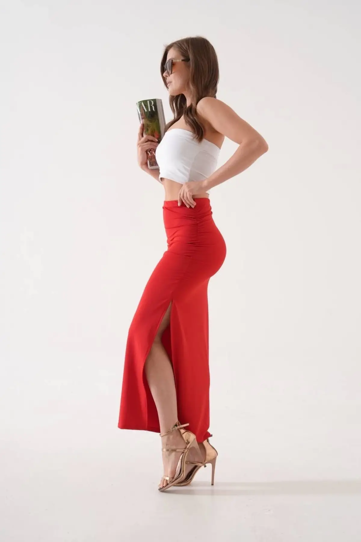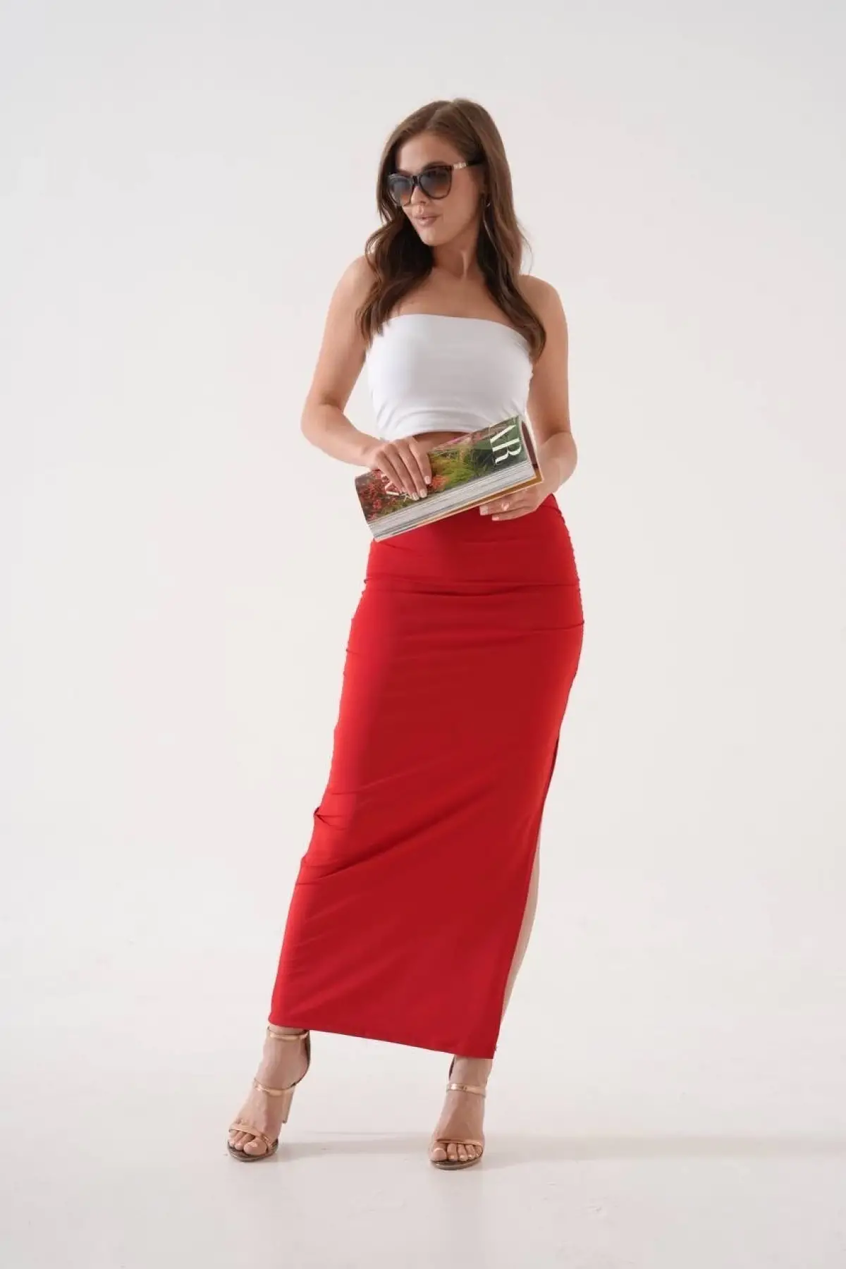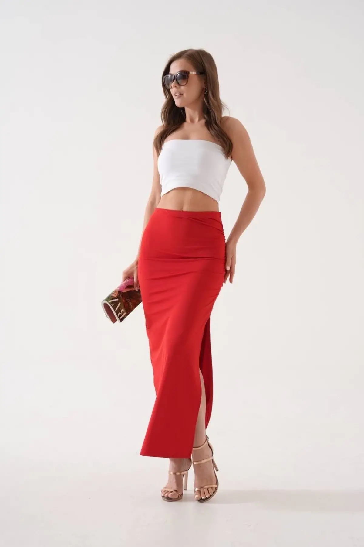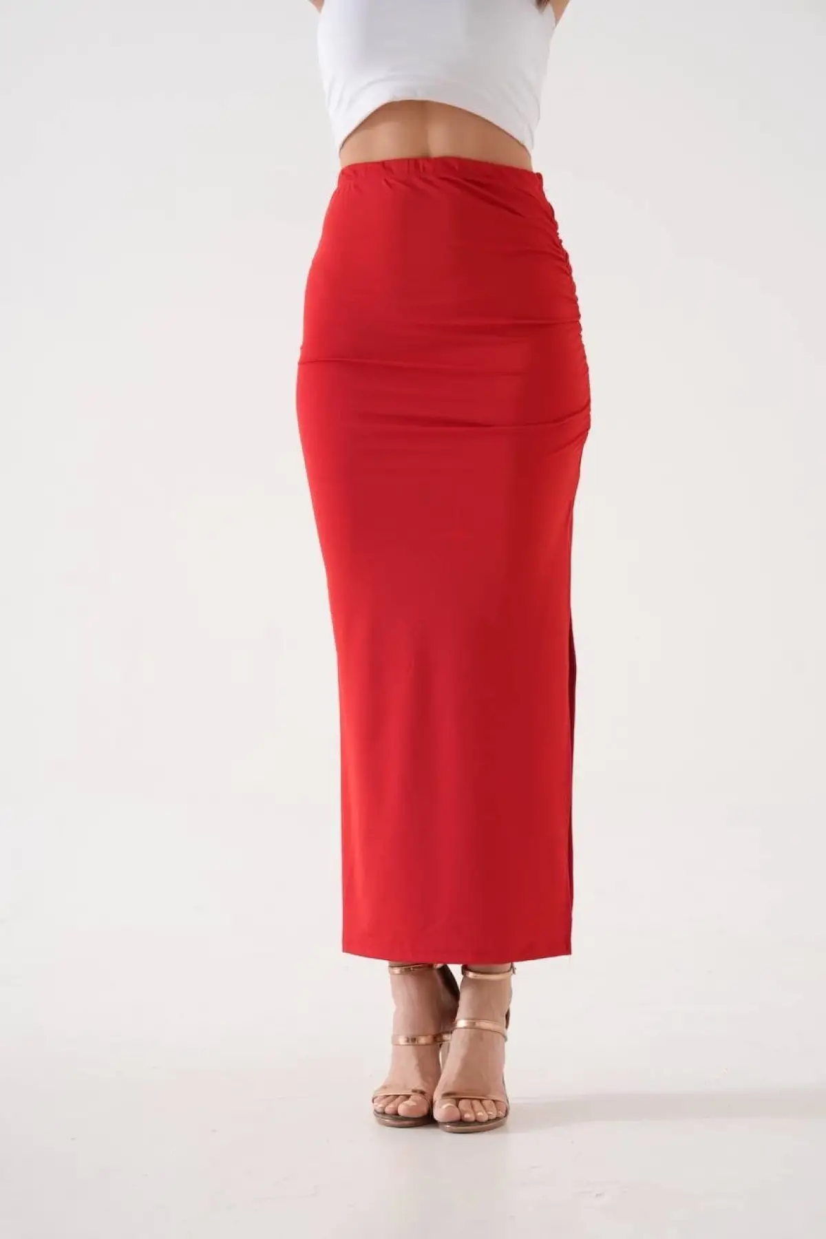 Uzun Yırtmaçlı İnce Kumaş Etek Kırmızı