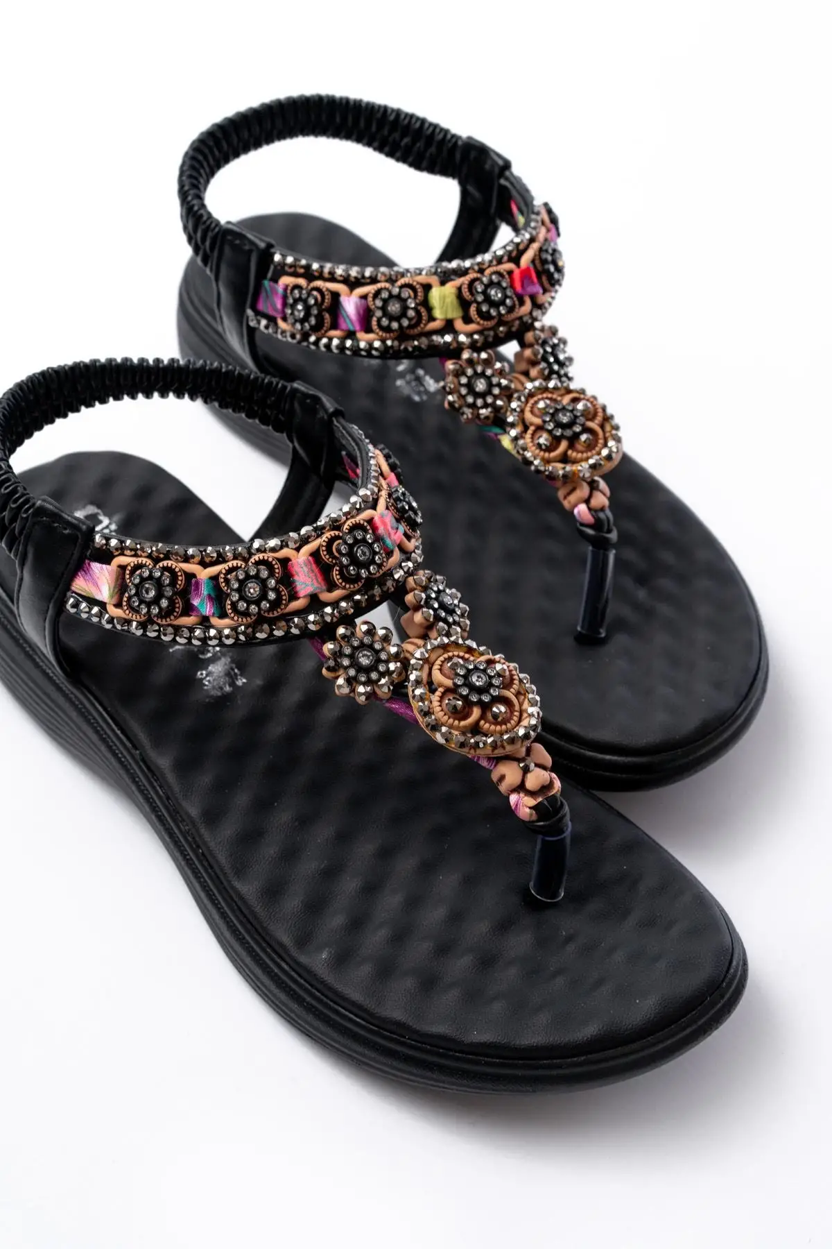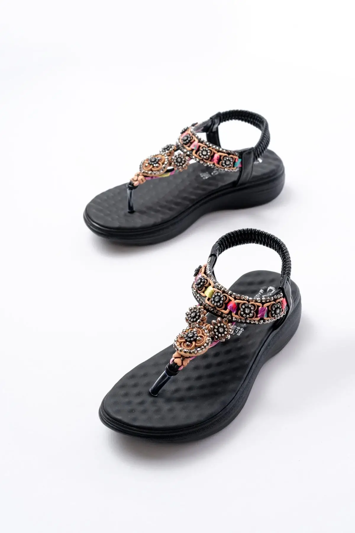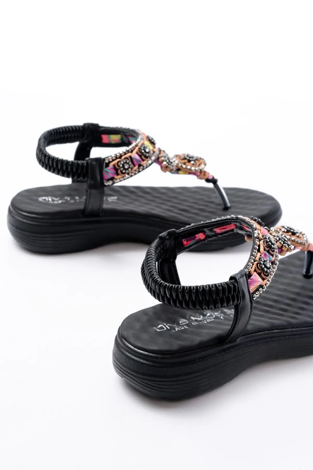 Dm-609 Siyah Taşlı Arka Lastikli Parmak Arası Kadın Sandalet