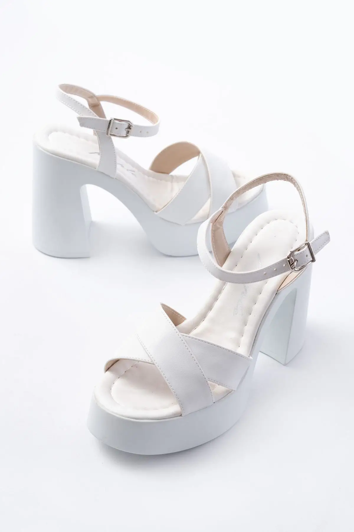 P-105 Beyaz Çapraz Kalın Topuklu Kadın Sandalet