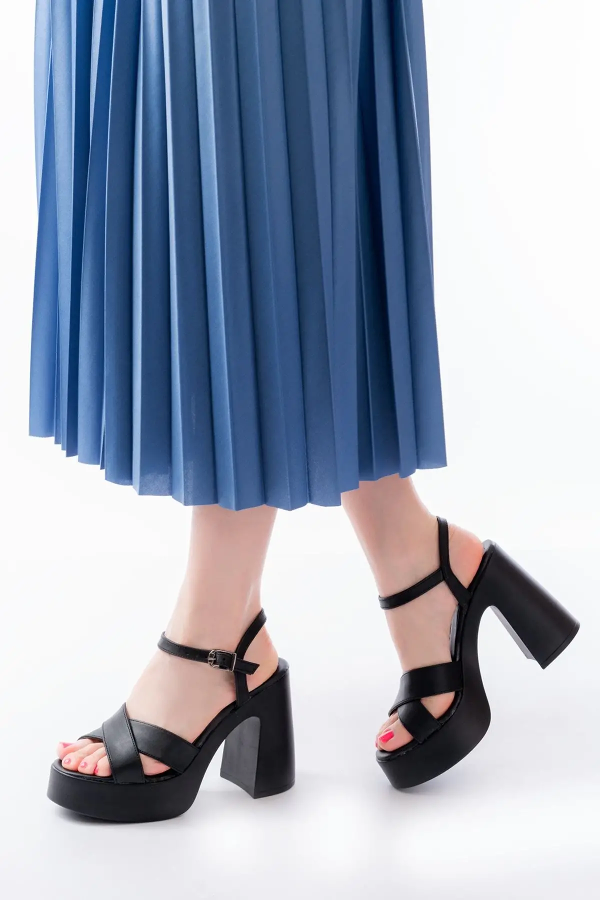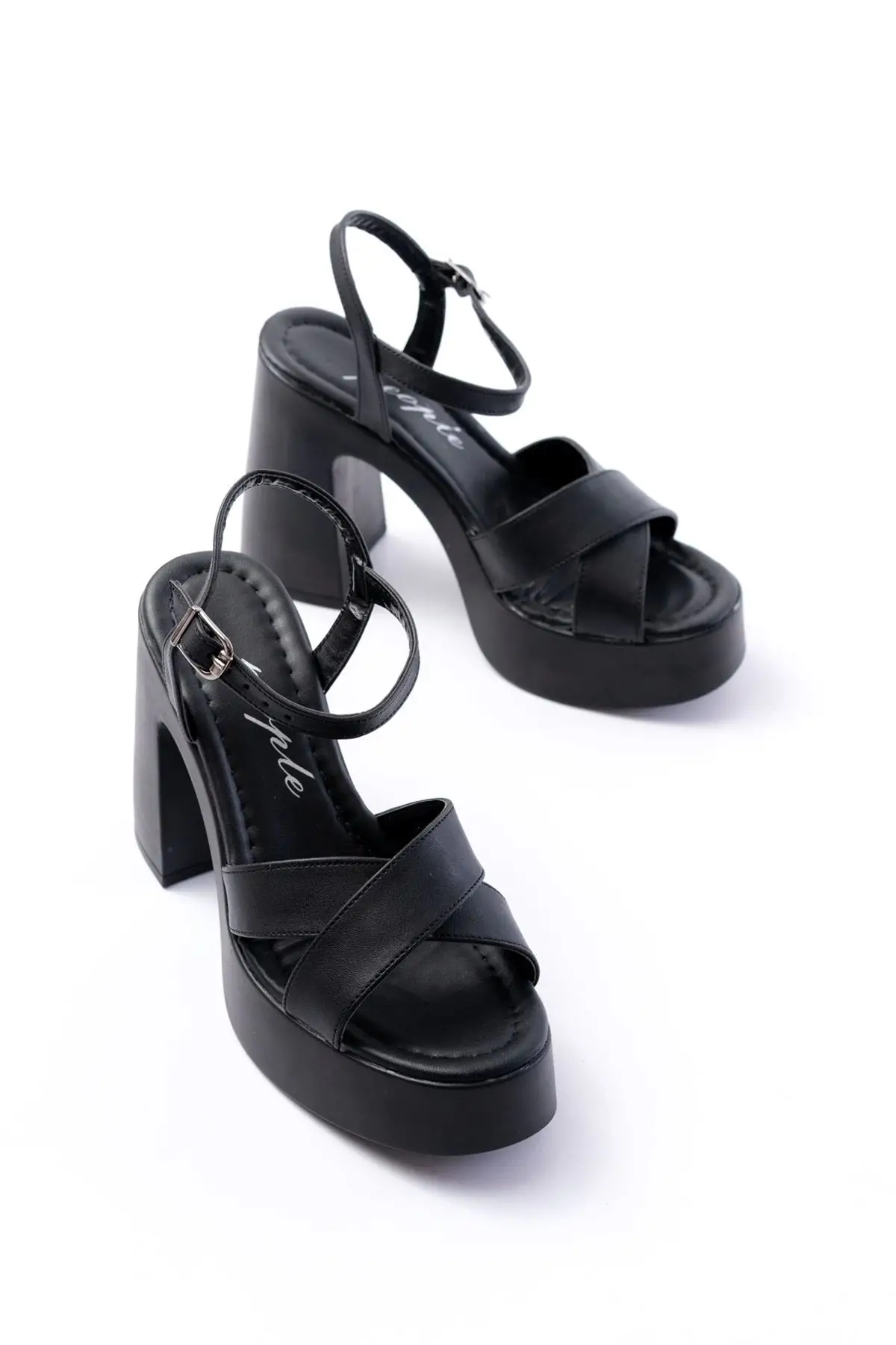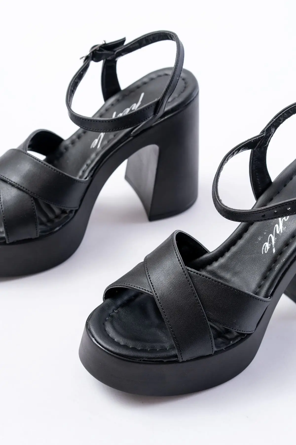 P-105 Siyah Çapraz Kalın Topuklu Kadın Sandalet