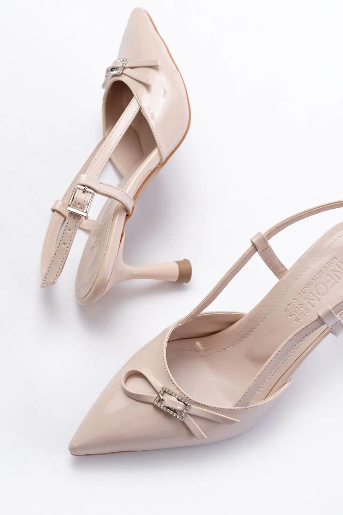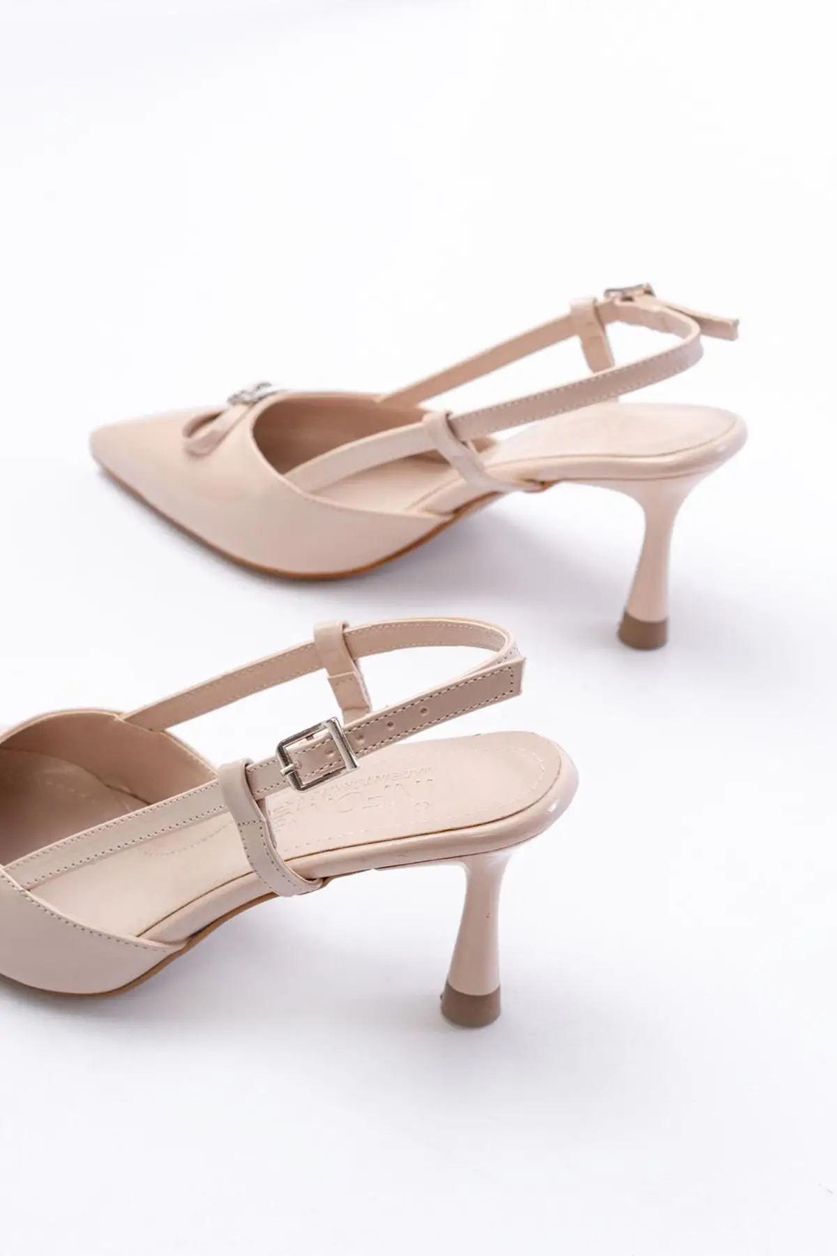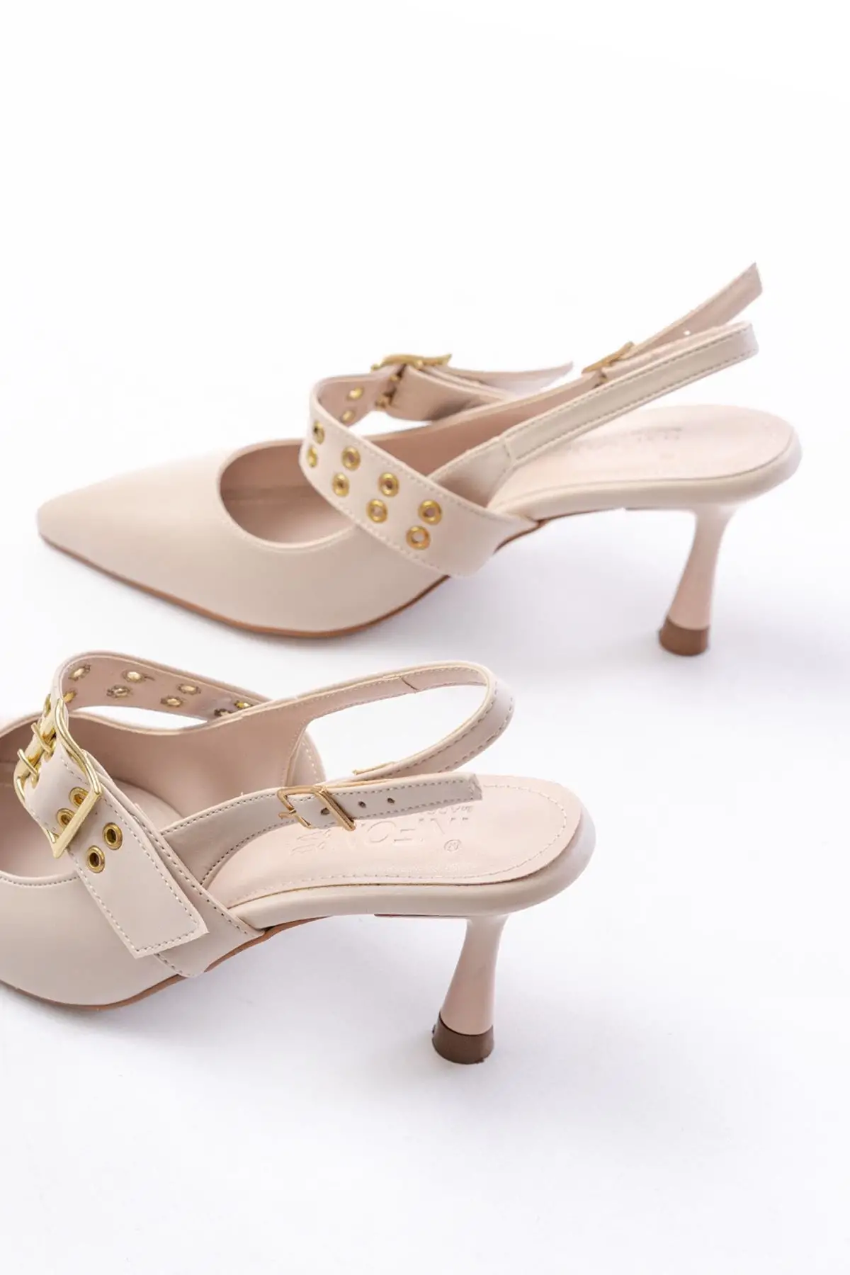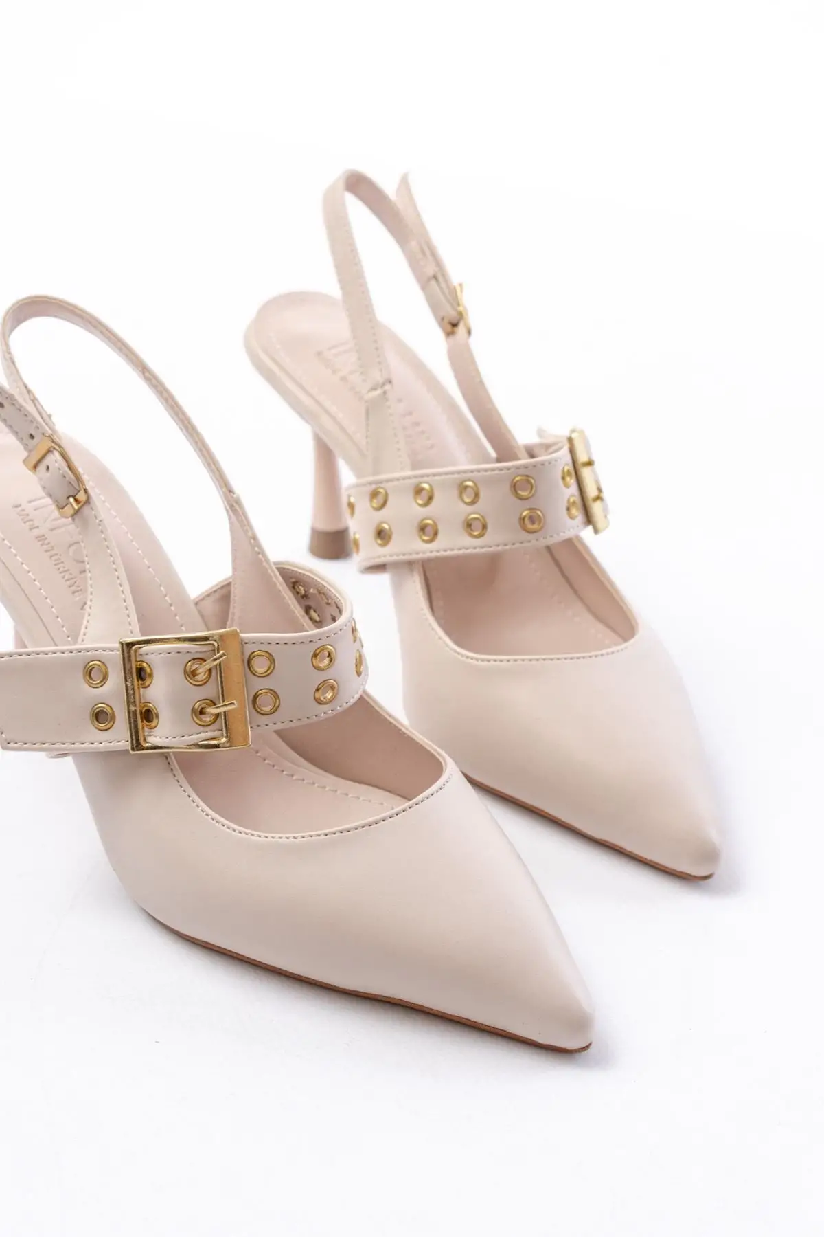 Bej Günlük Arkası Açık Baret Tokalı Topuklu Bayan Ayakkabı
