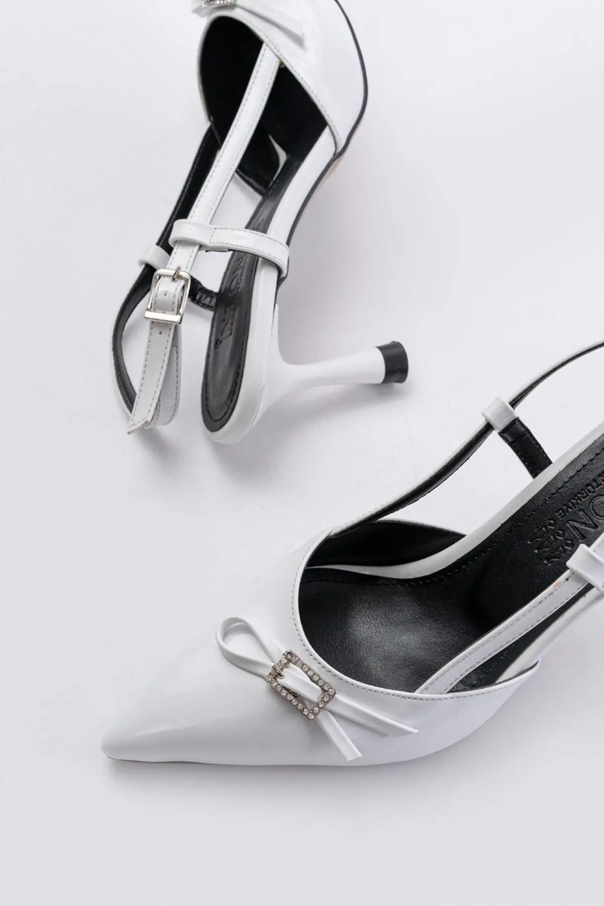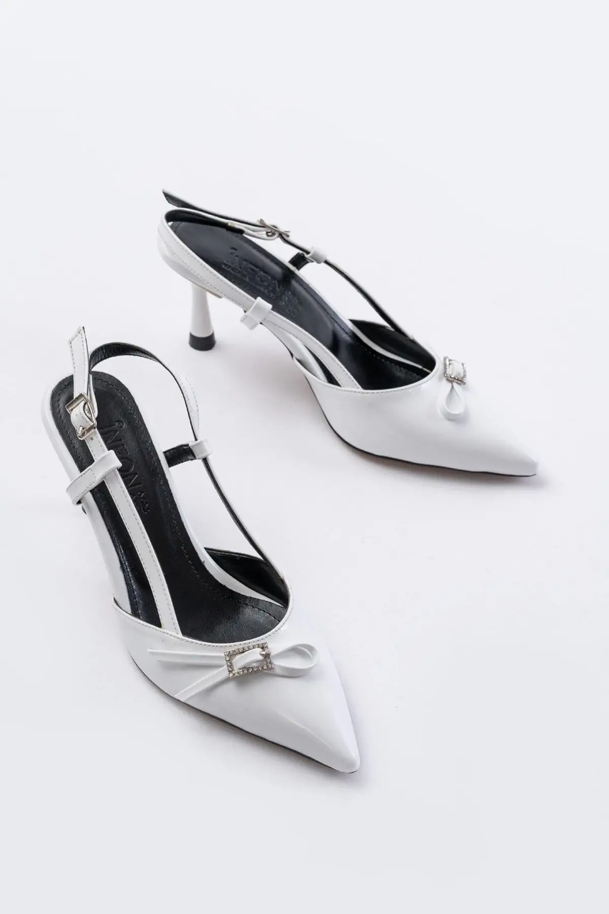 Beyaz Rugan Günlük Arkası Açık Fiyonklu Topuklu Bayan Ayakkabı