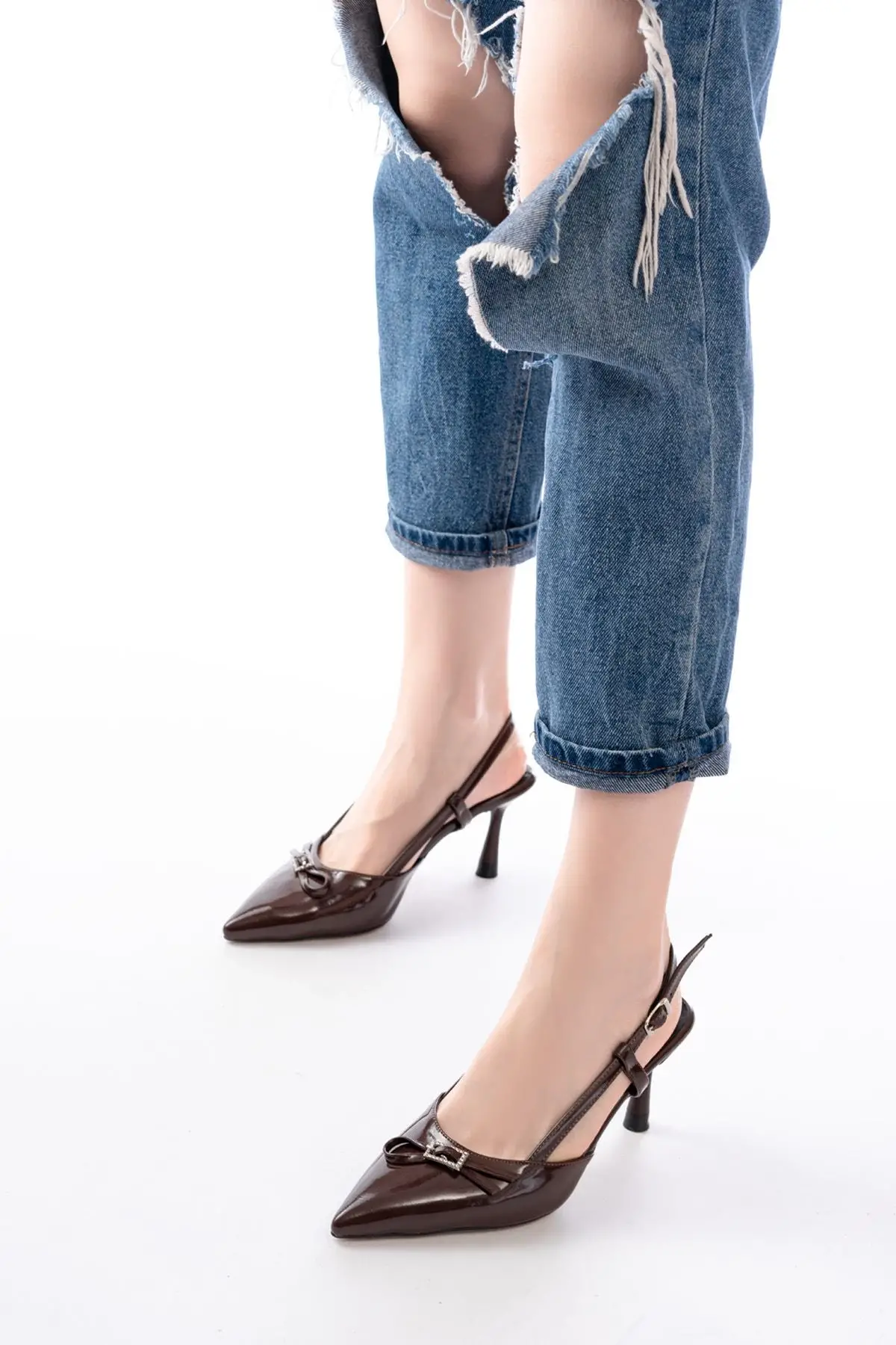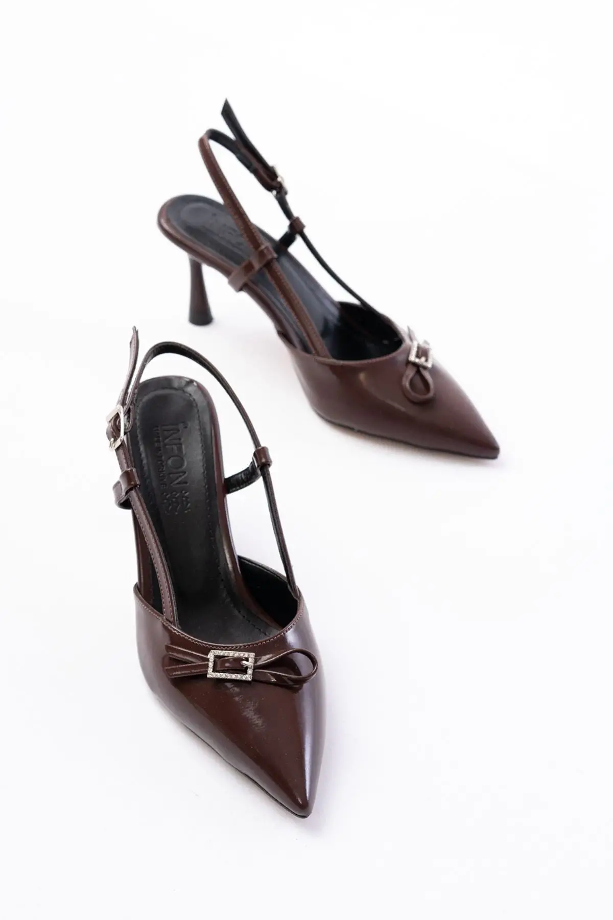 Kahve Rugan Günlük Arkası Açık Fiyonklu Topuklu Bayan Ayakkabı