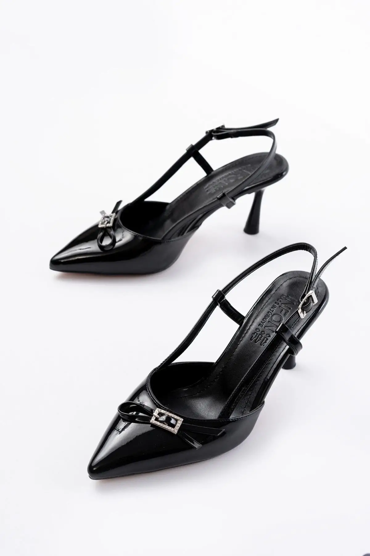 Siyah Rugan Günlük Arkası Açık Fiyonklu Topuklu Bayan Ayakkabı