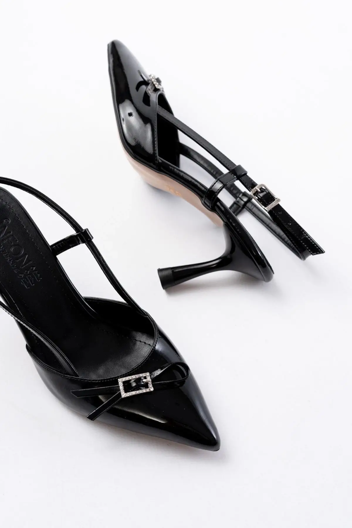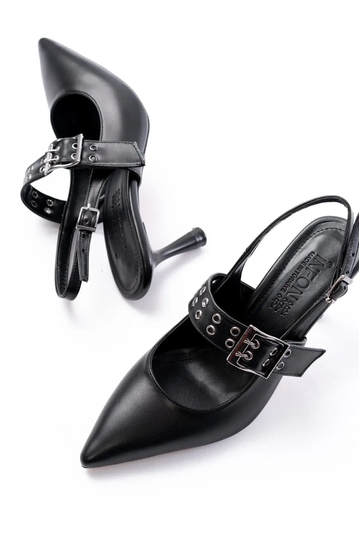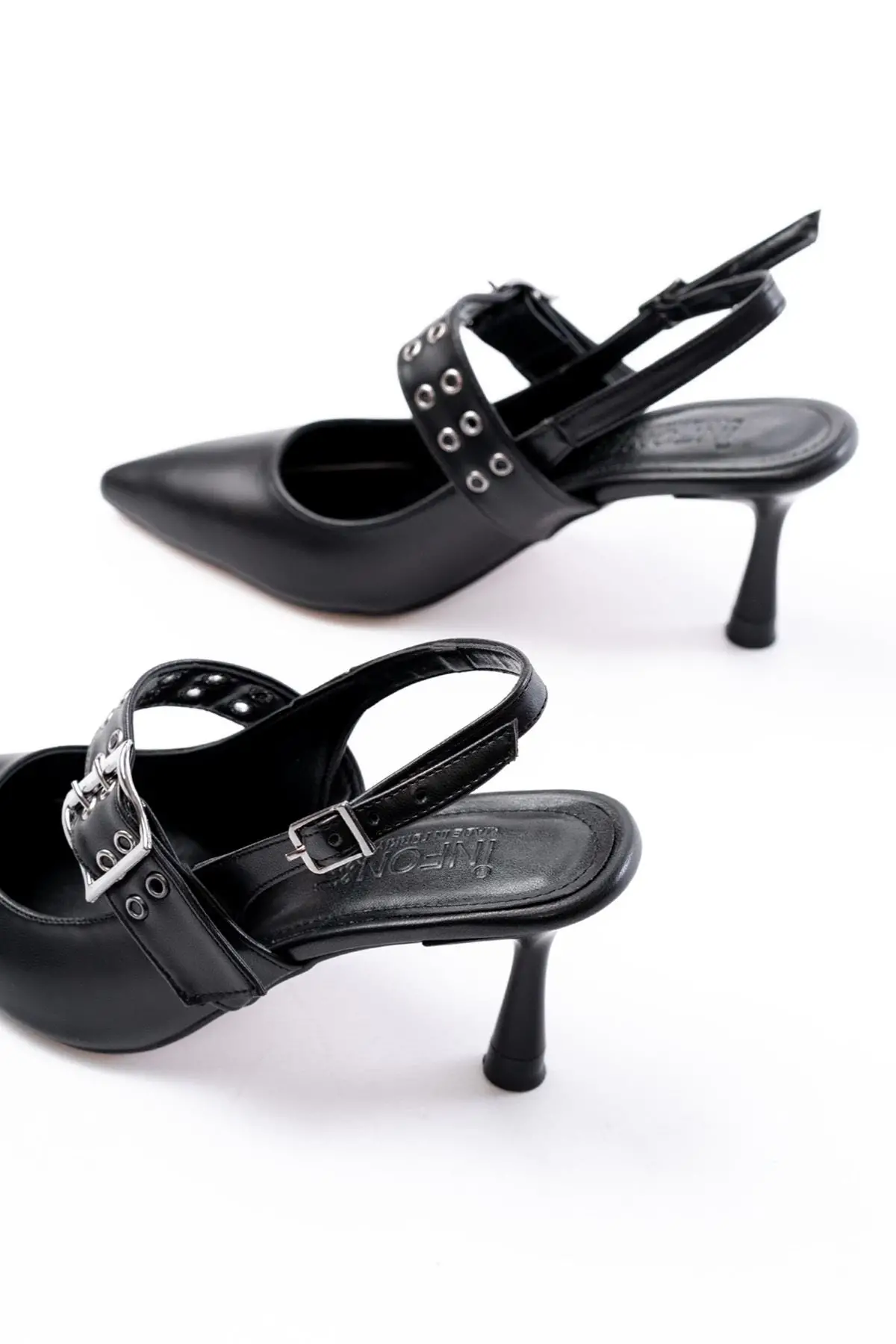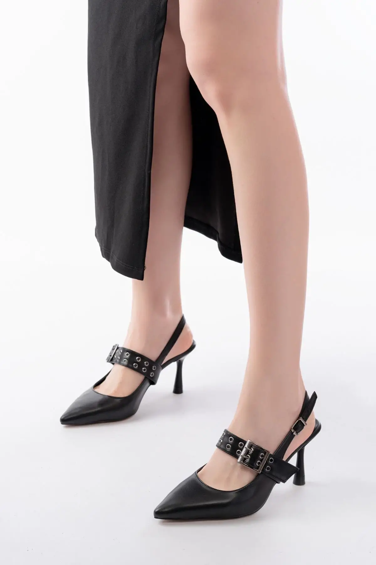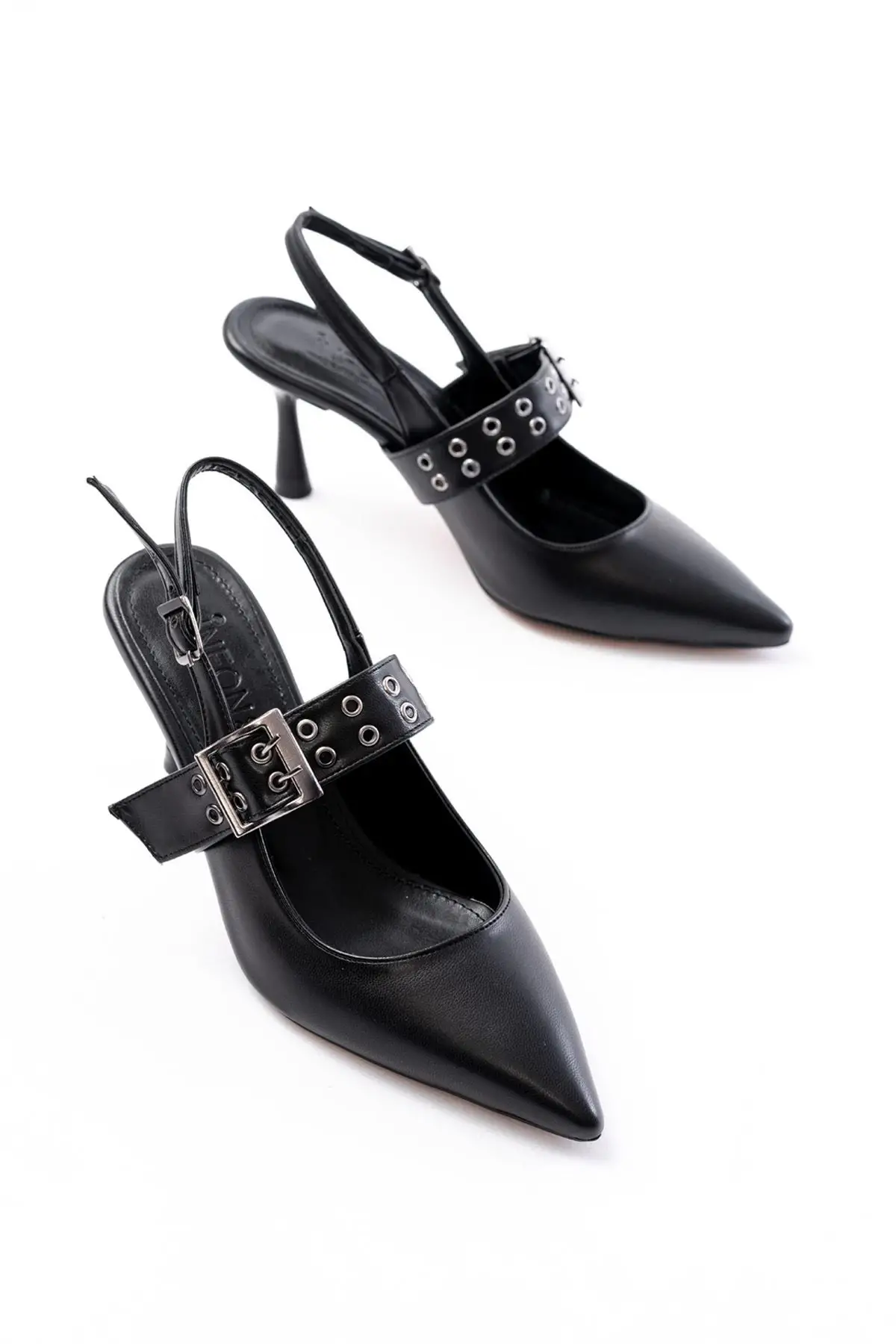 Siyah Günlük Arkası Açık Baret Tokalı Topuklu Bayan Ayakkabı