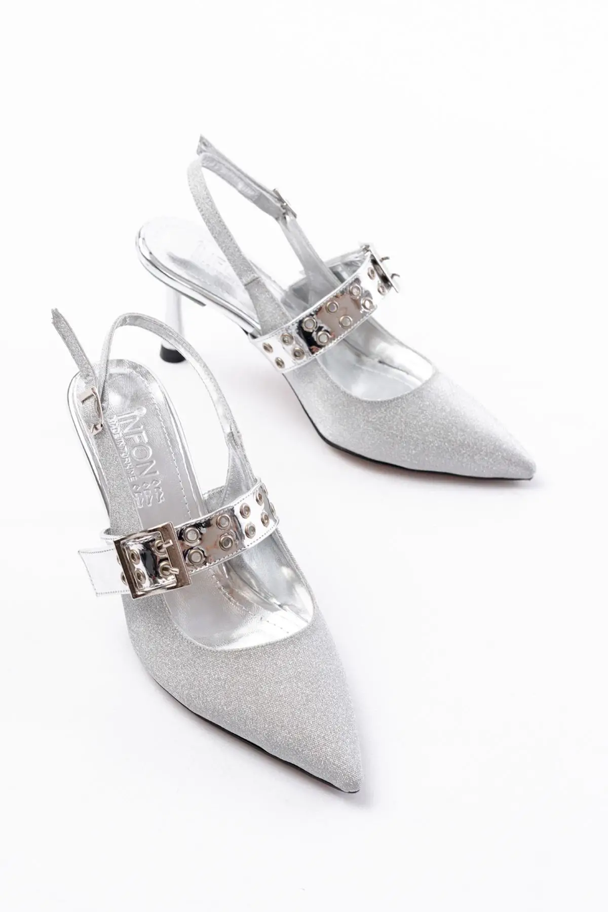 Gümüş Simli Günlük Arkası Açık Baret Tokalı Topuklu Bayan Ayakkabı