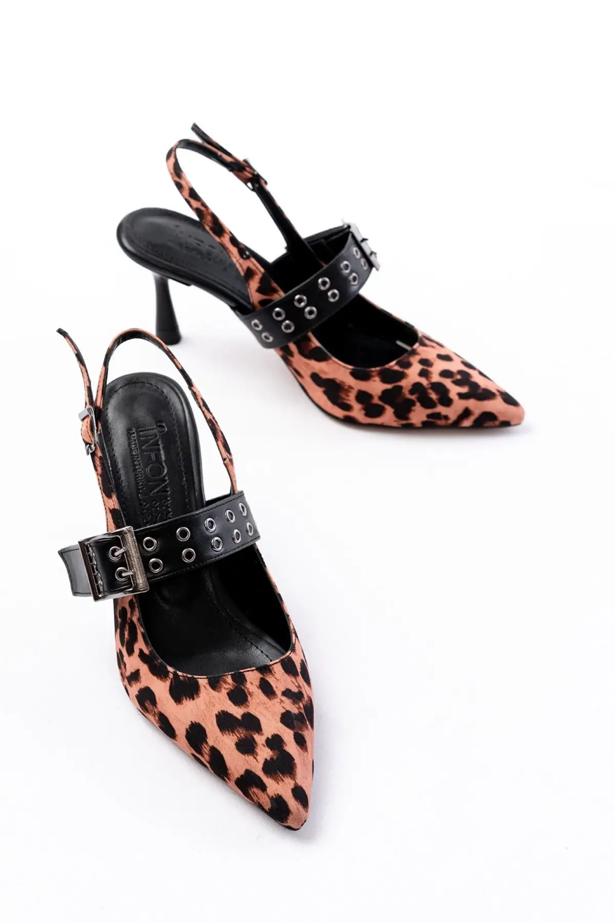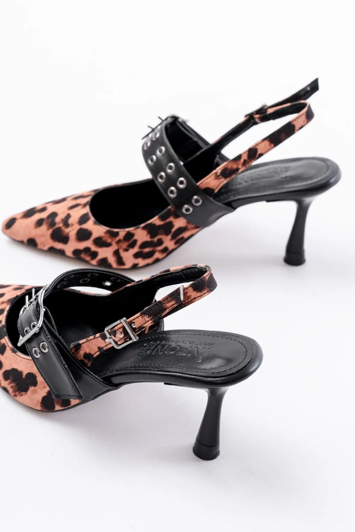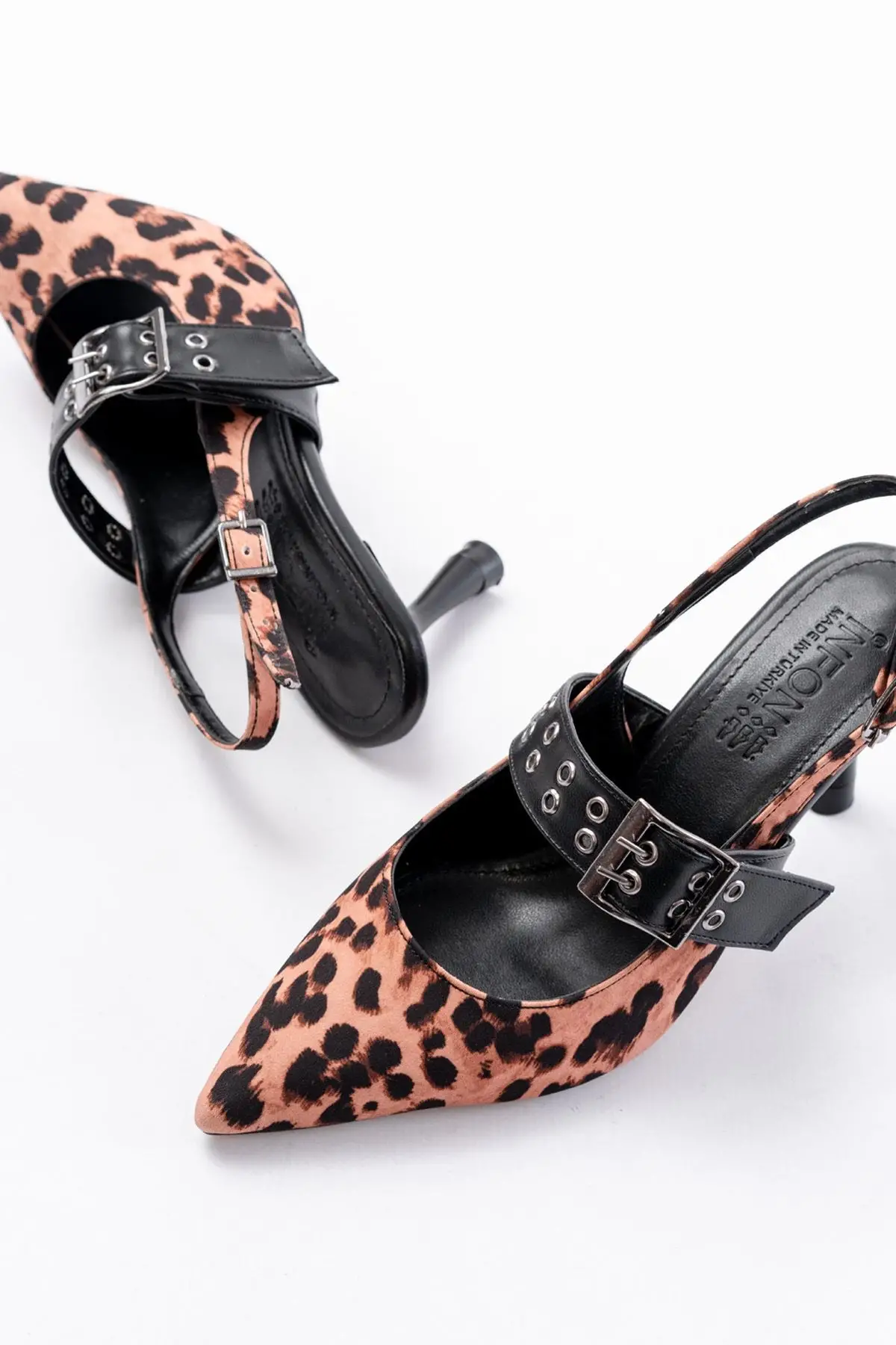 Siyah Leopar Günlük Arkası Açık Baret Tokalı Topuklu Bayan Ayakkabı