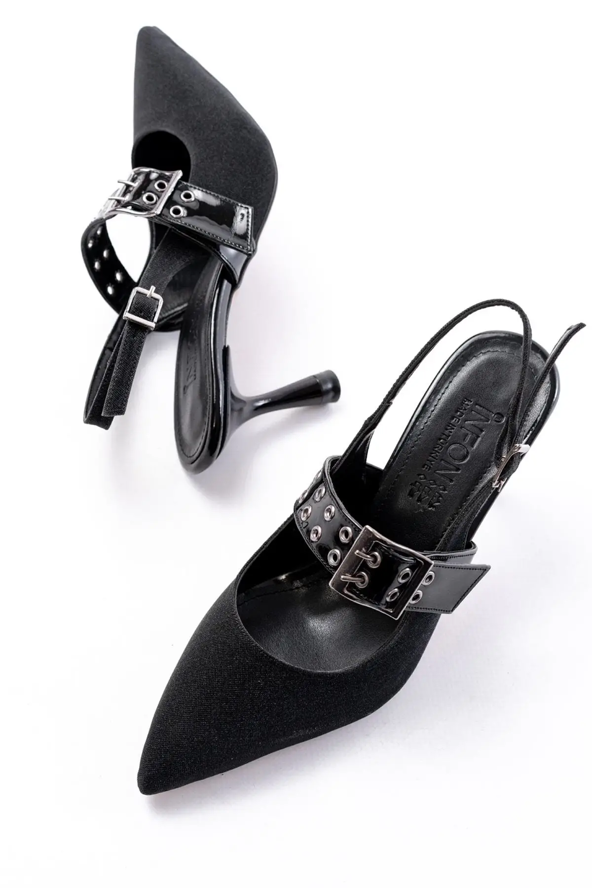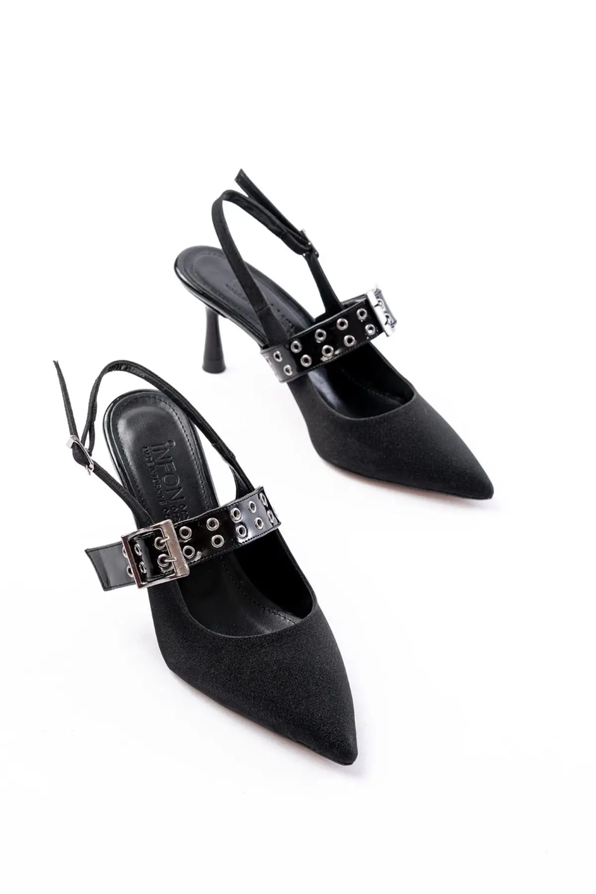 Siyah Simli Günlük Arkası Açık Baret Tokalı Topuklu Bayan Ayakkabı