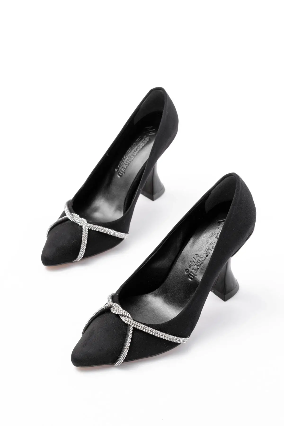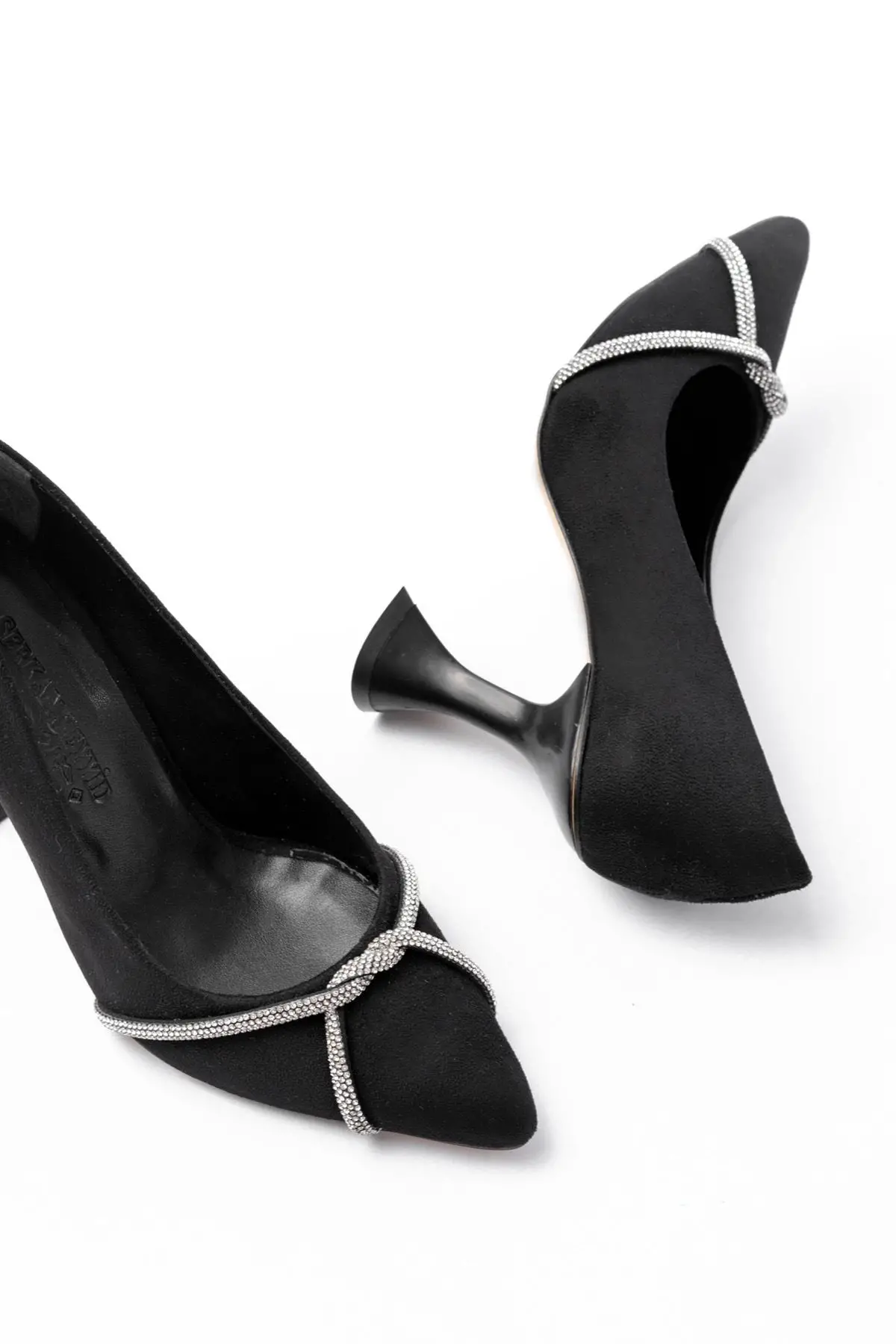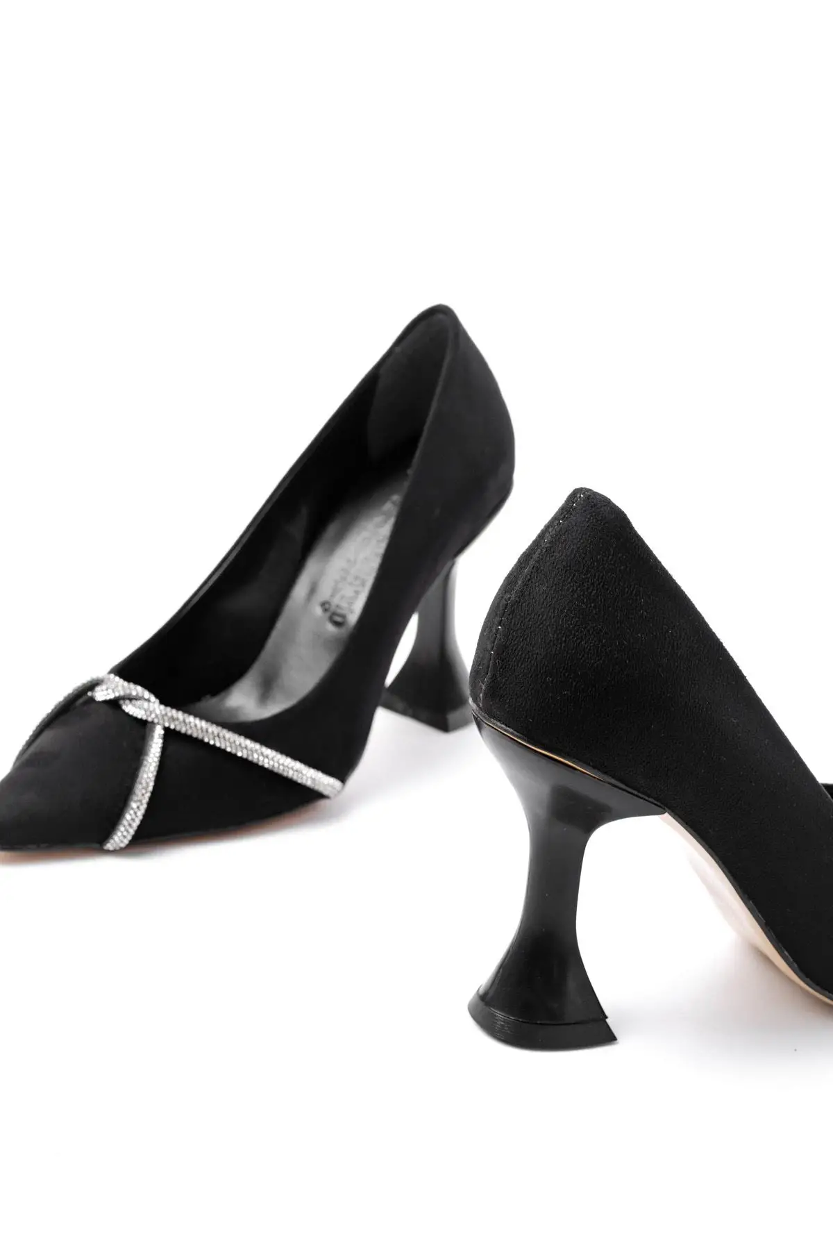 Siyah Süet Günlük Sarmal Taşlı Topuklu Kadın Ayakkabı