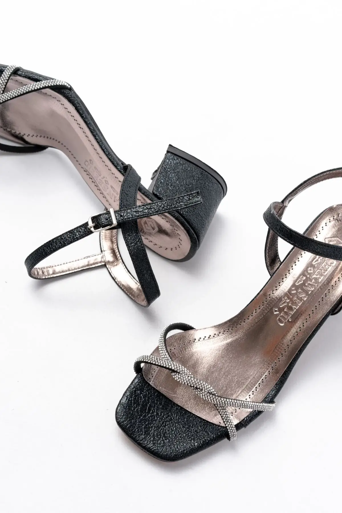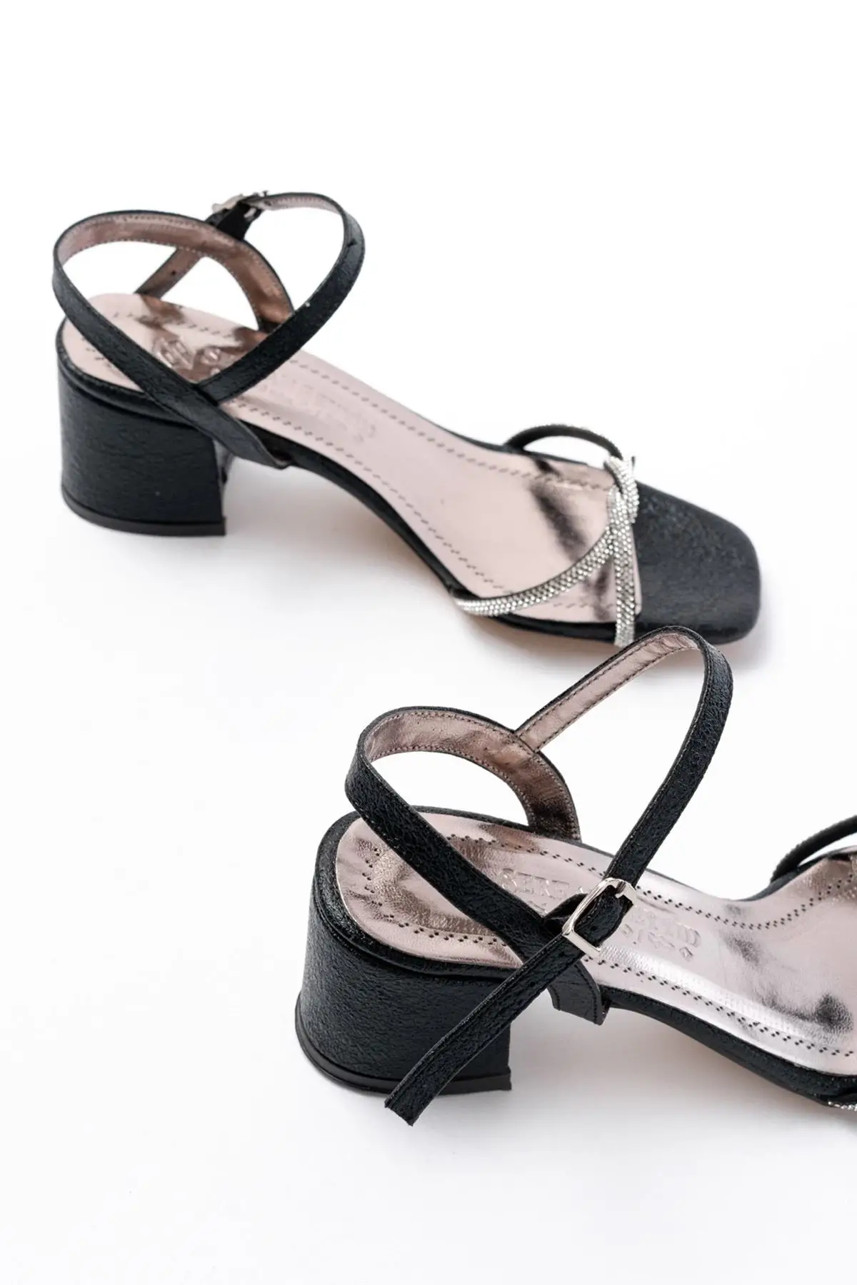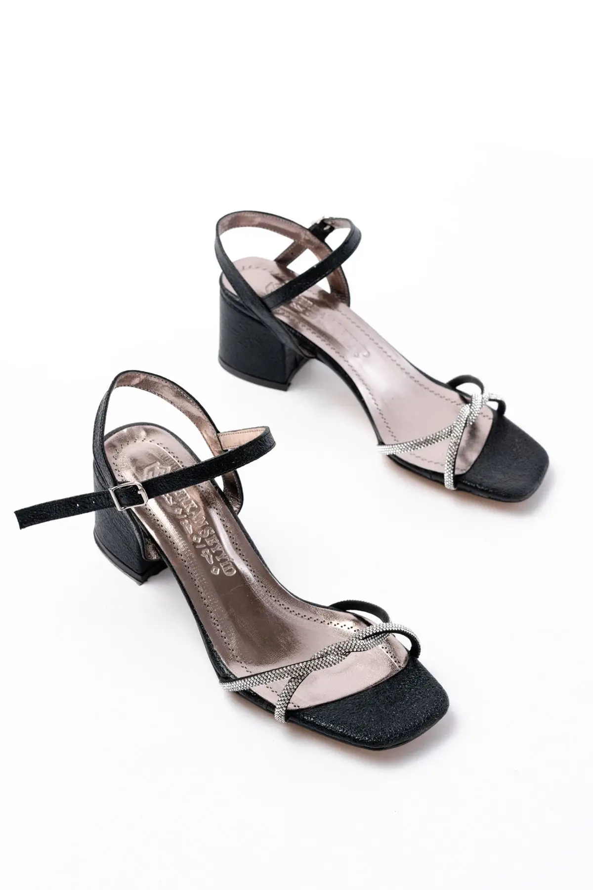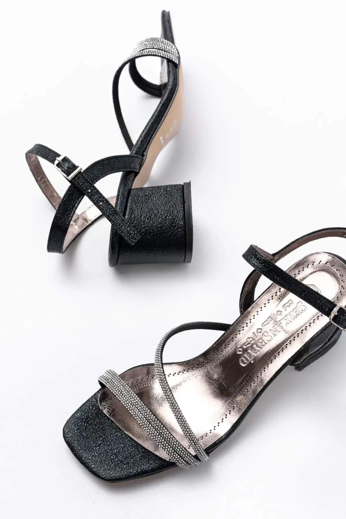 Siyah Çift Bantlı Taşlı Kalın Topuklu Kadın Ayakkabı