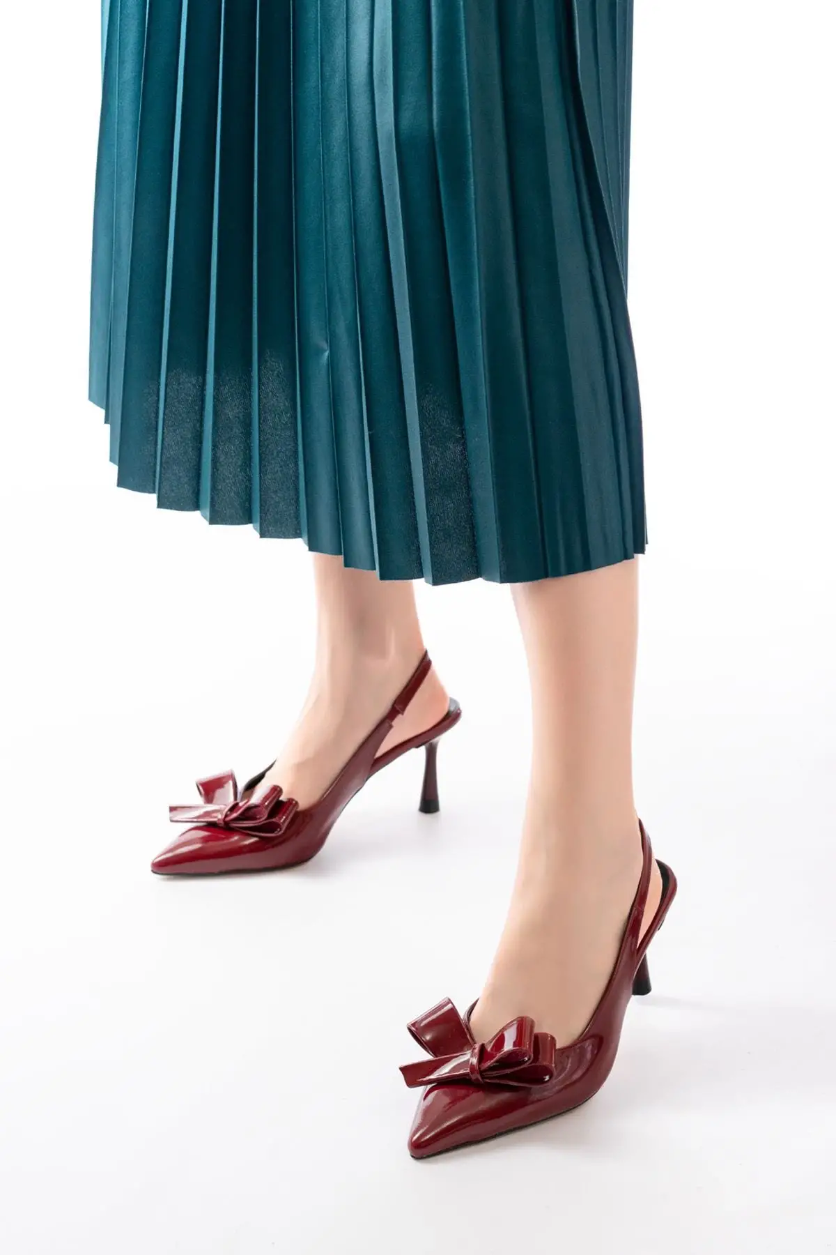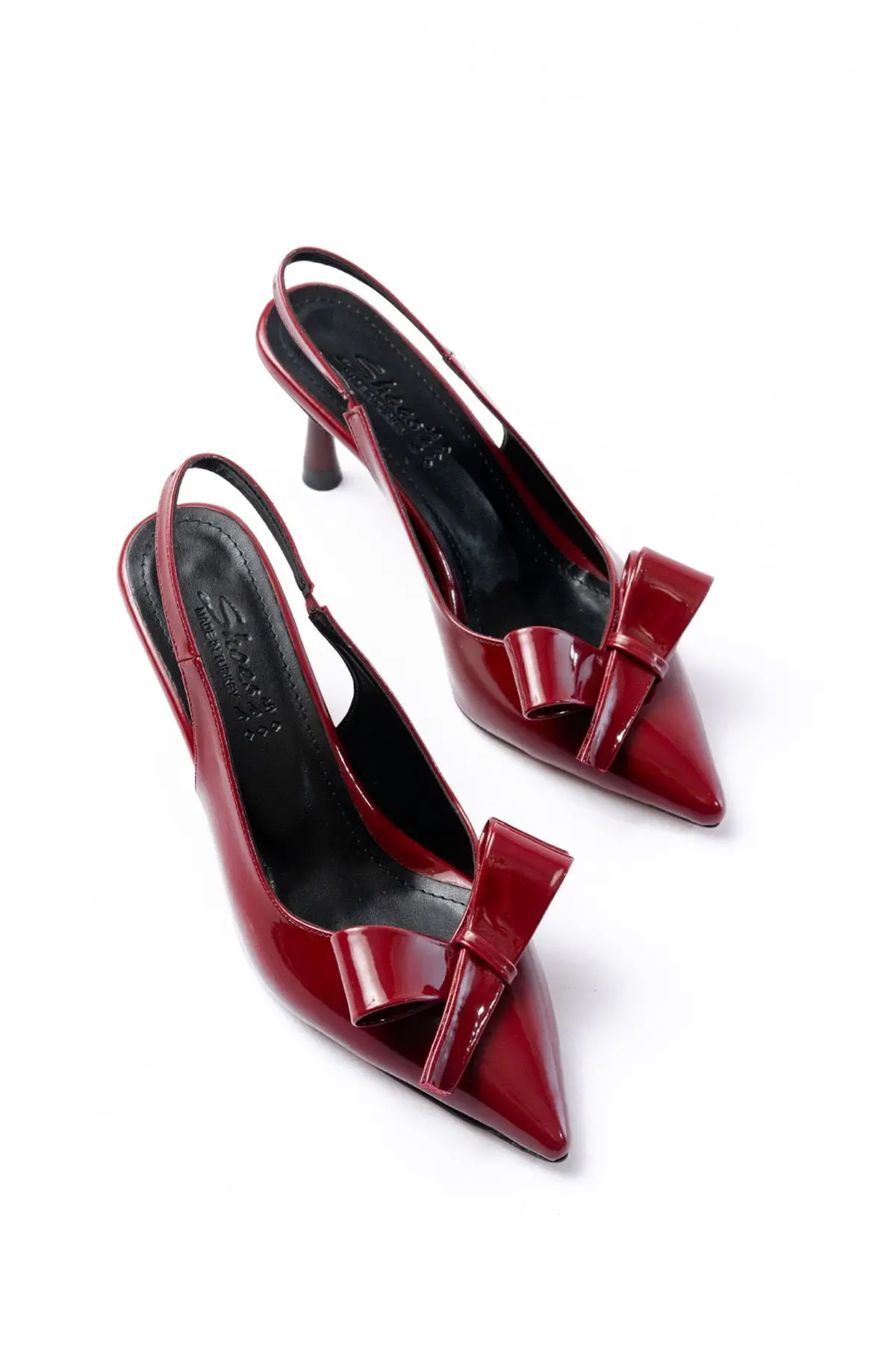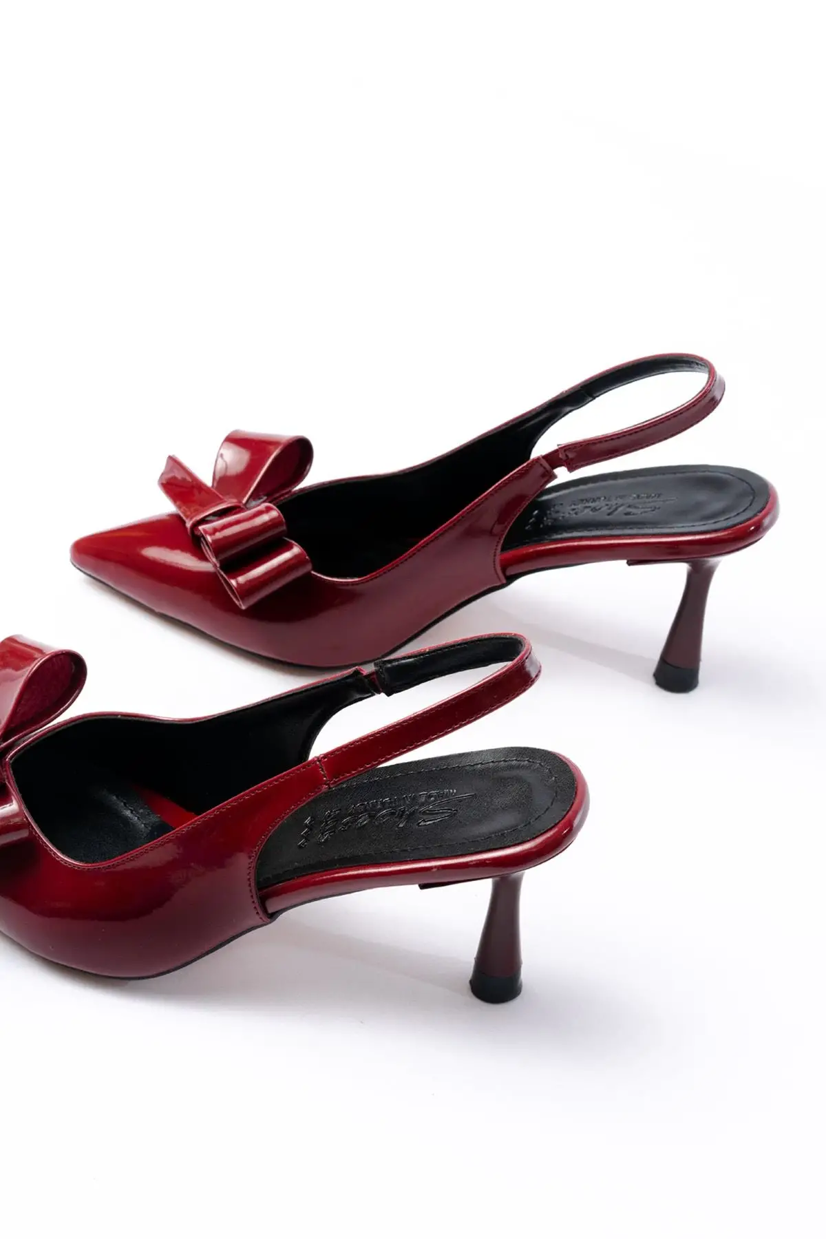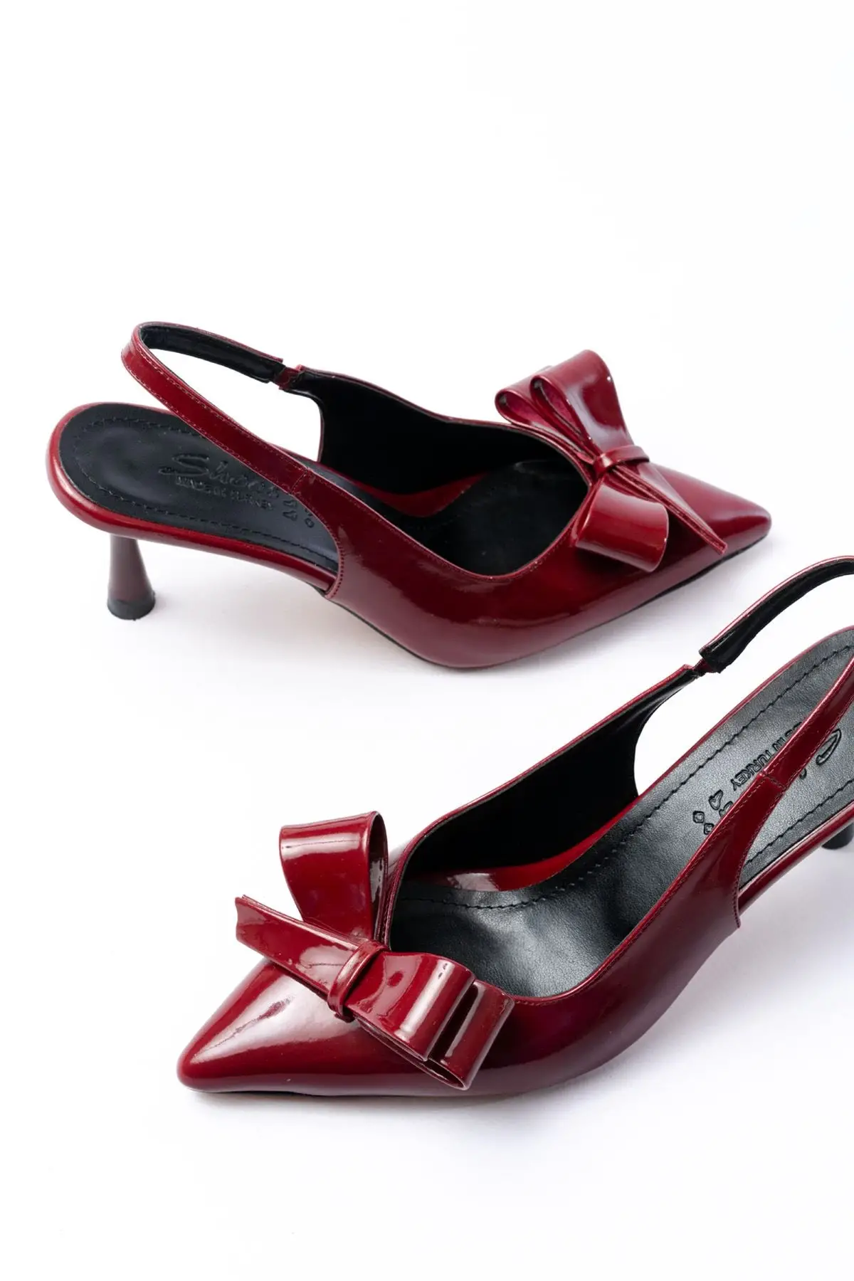 İNF-4501 Bordo Rugan Günlük Arkası Açık Fiyonklu Topuklu Bayan Ayakkabı