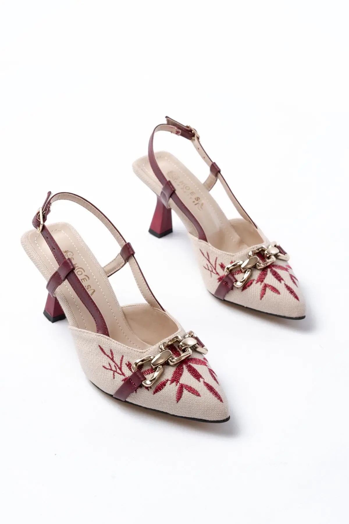 K-250 Bordo Keten Günlük Arkası Açık Tokalı Topuklu Kadın Ayakkabı