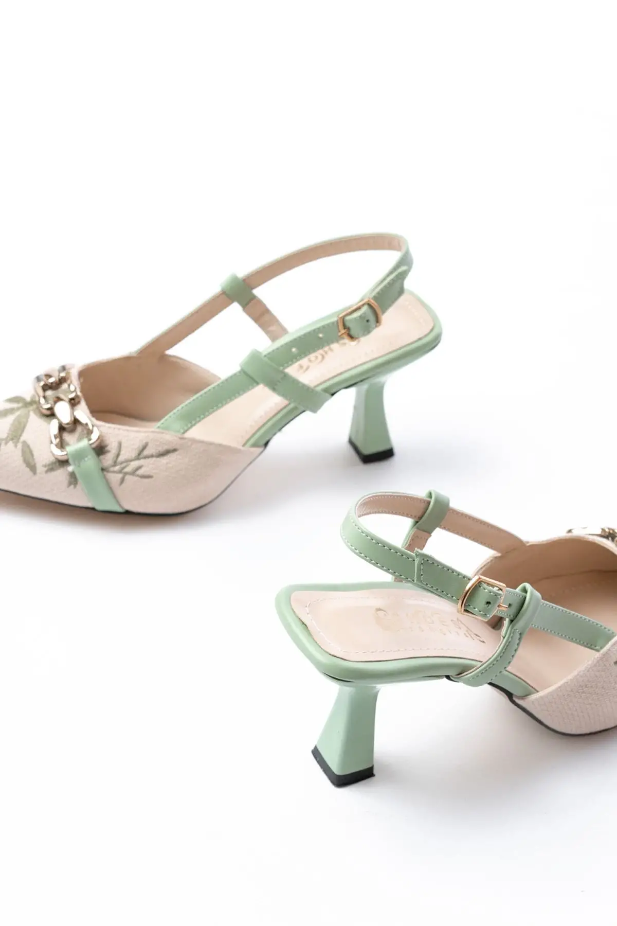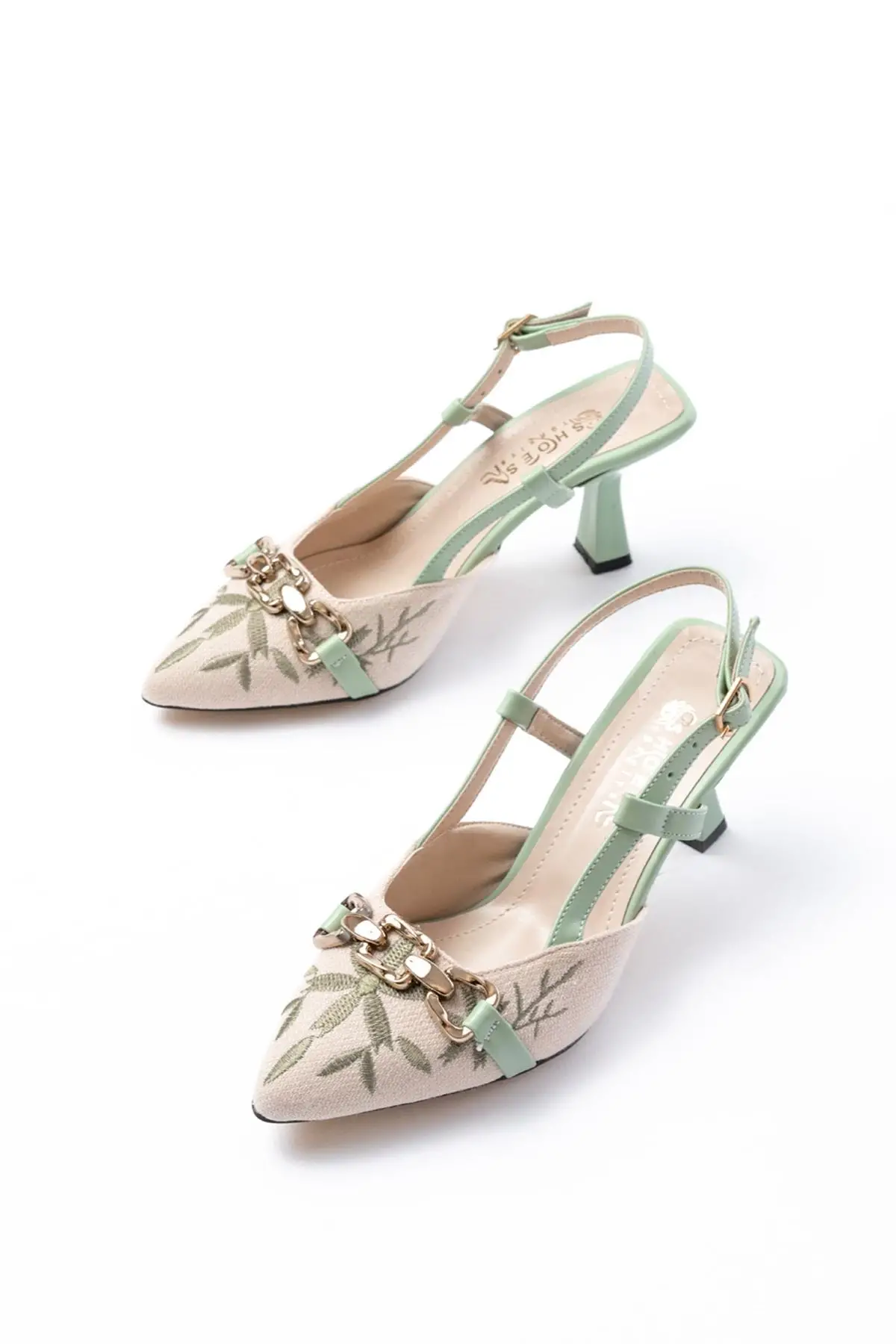 K-250 Fıstık Yeşili Keten Günlük Arkası Açık Tokalı Topuklu Kadın Ayakkabı