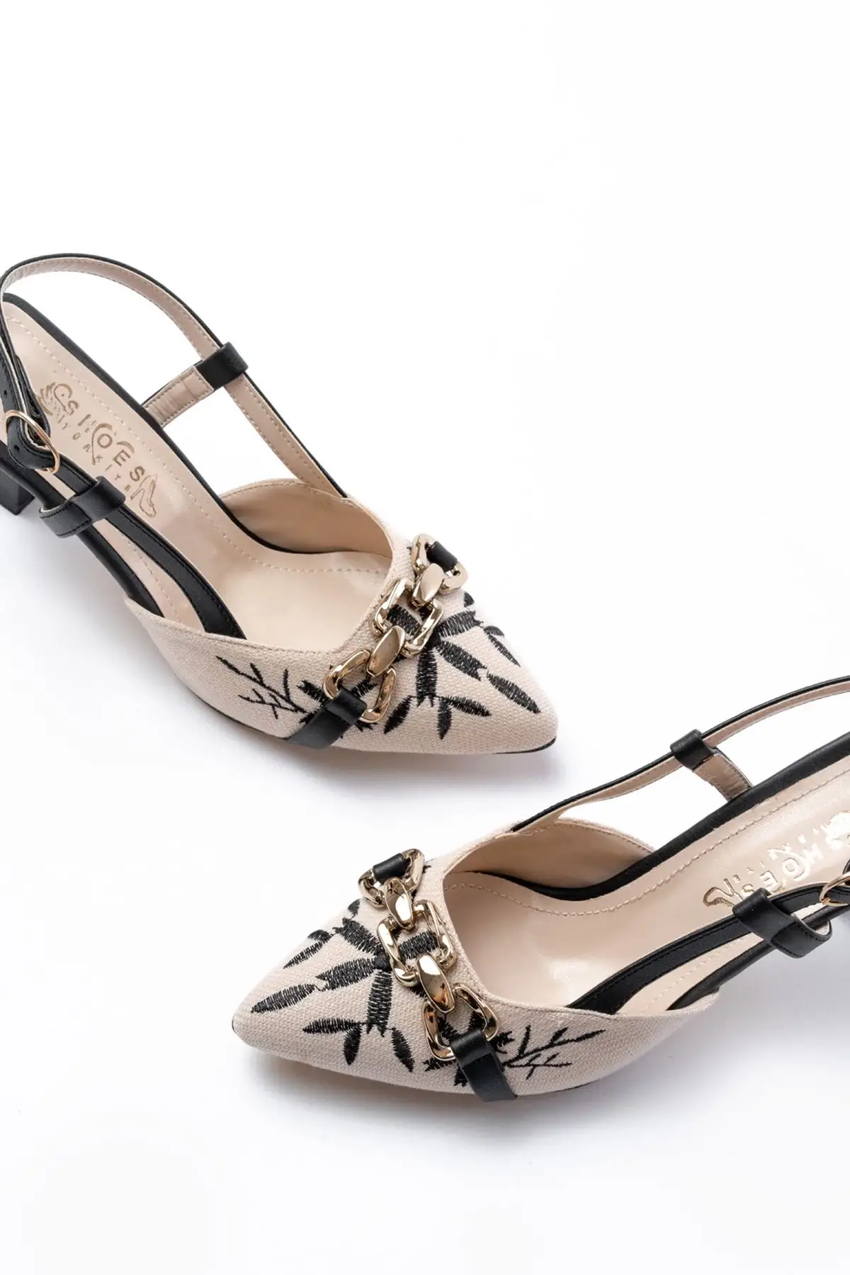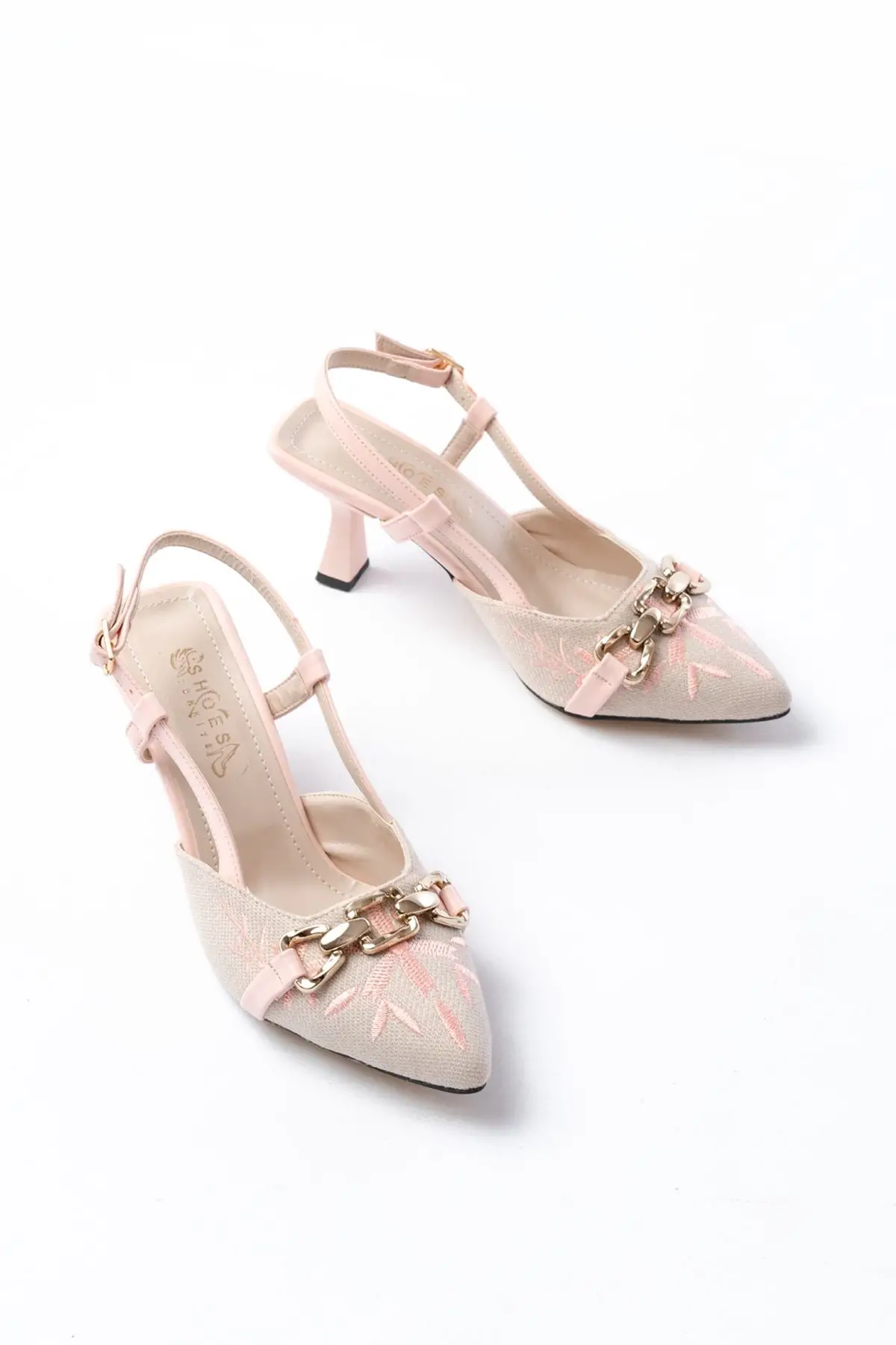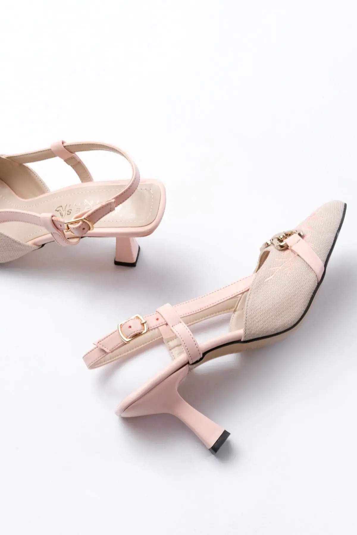 K-250 Pudra Keten Günlük Arkası Açık Tokalı Topuklu Kadın Ayakkabı