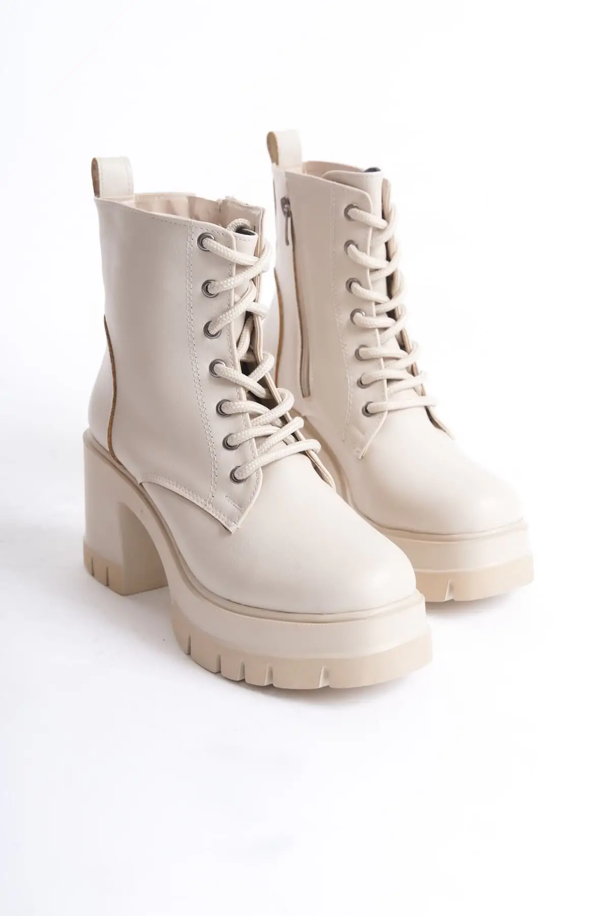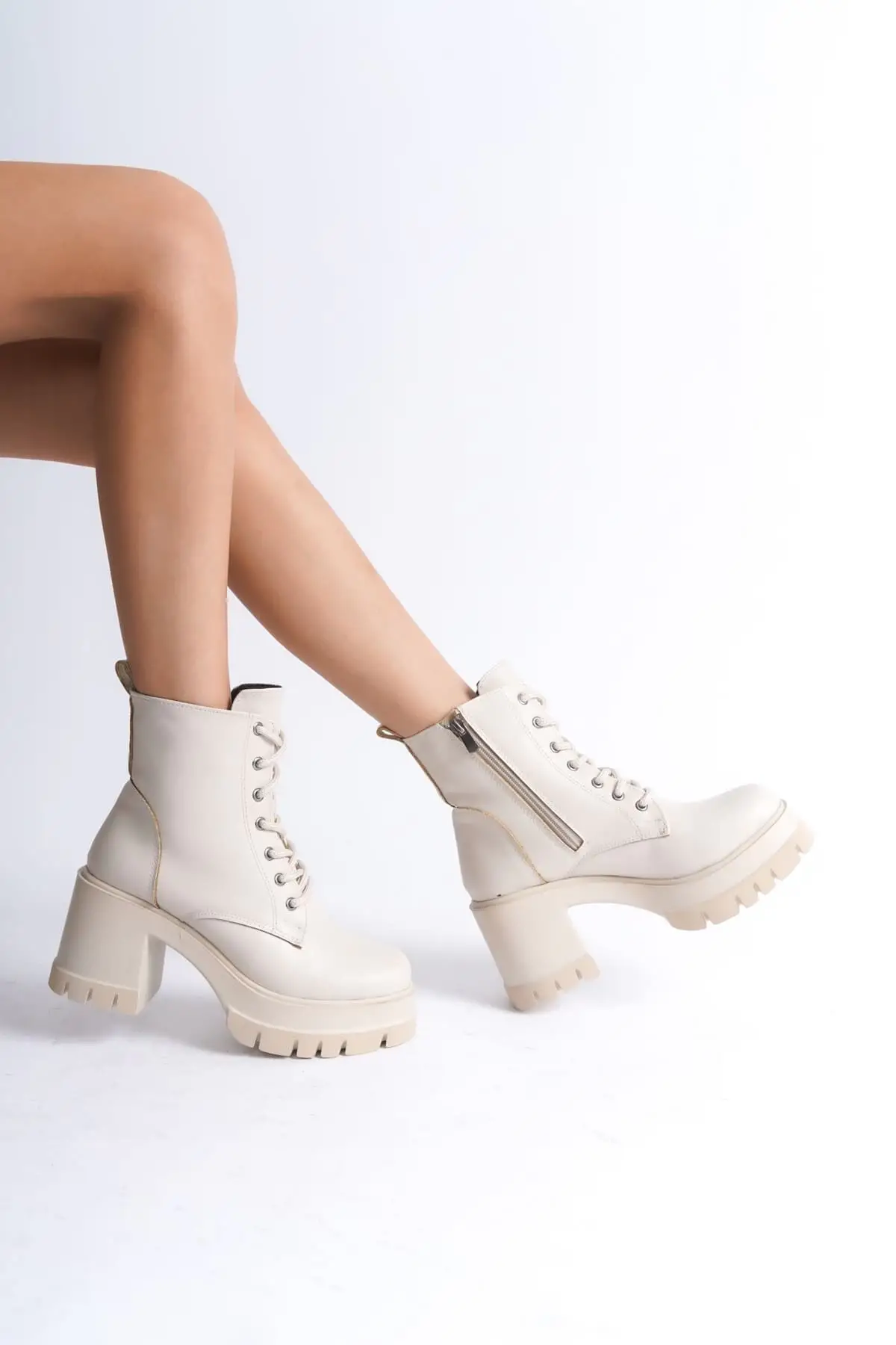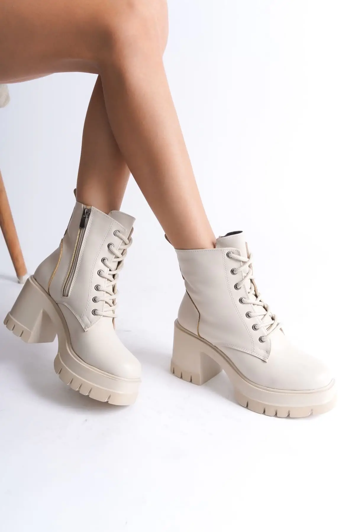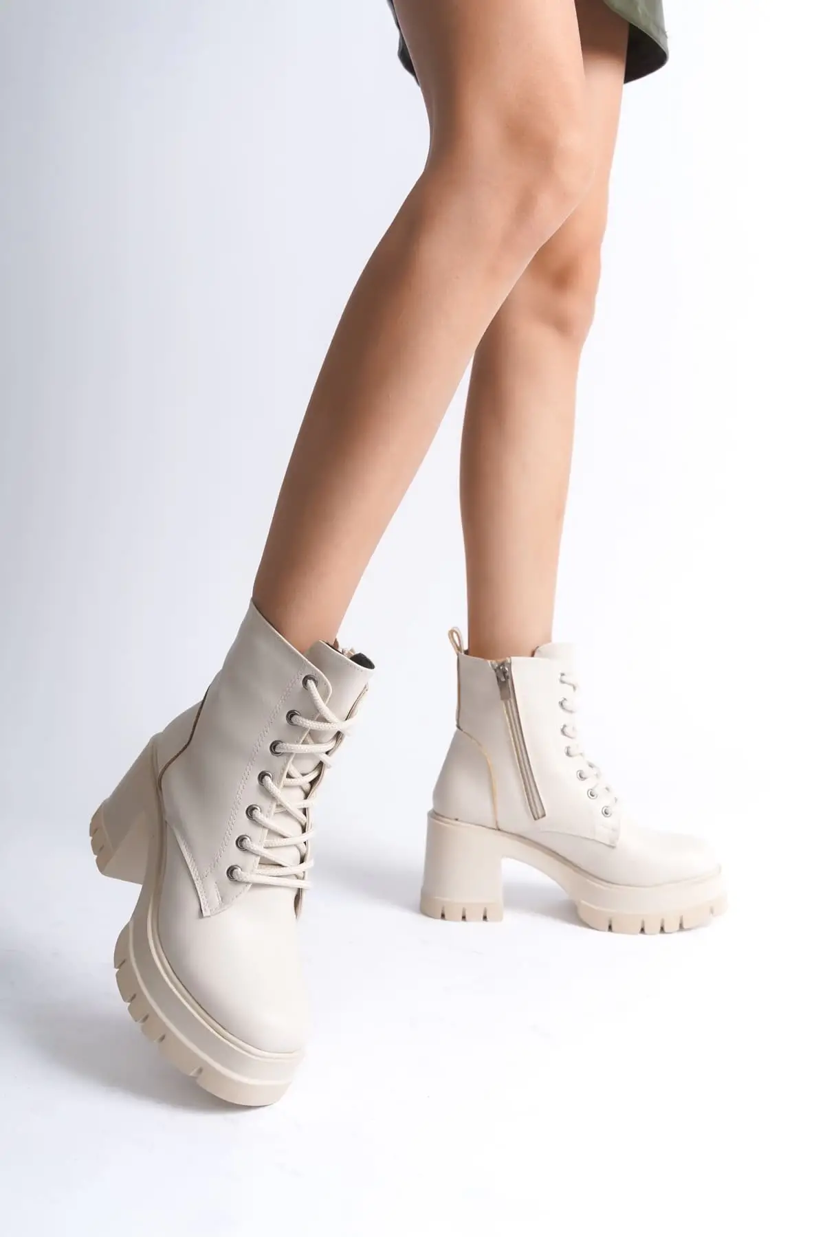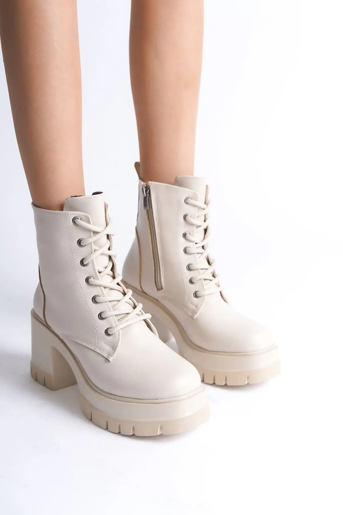 Lauren Bağcıklı Fermuarlı Ortopedik Taban Topuklukadın Bot Kt - Krem