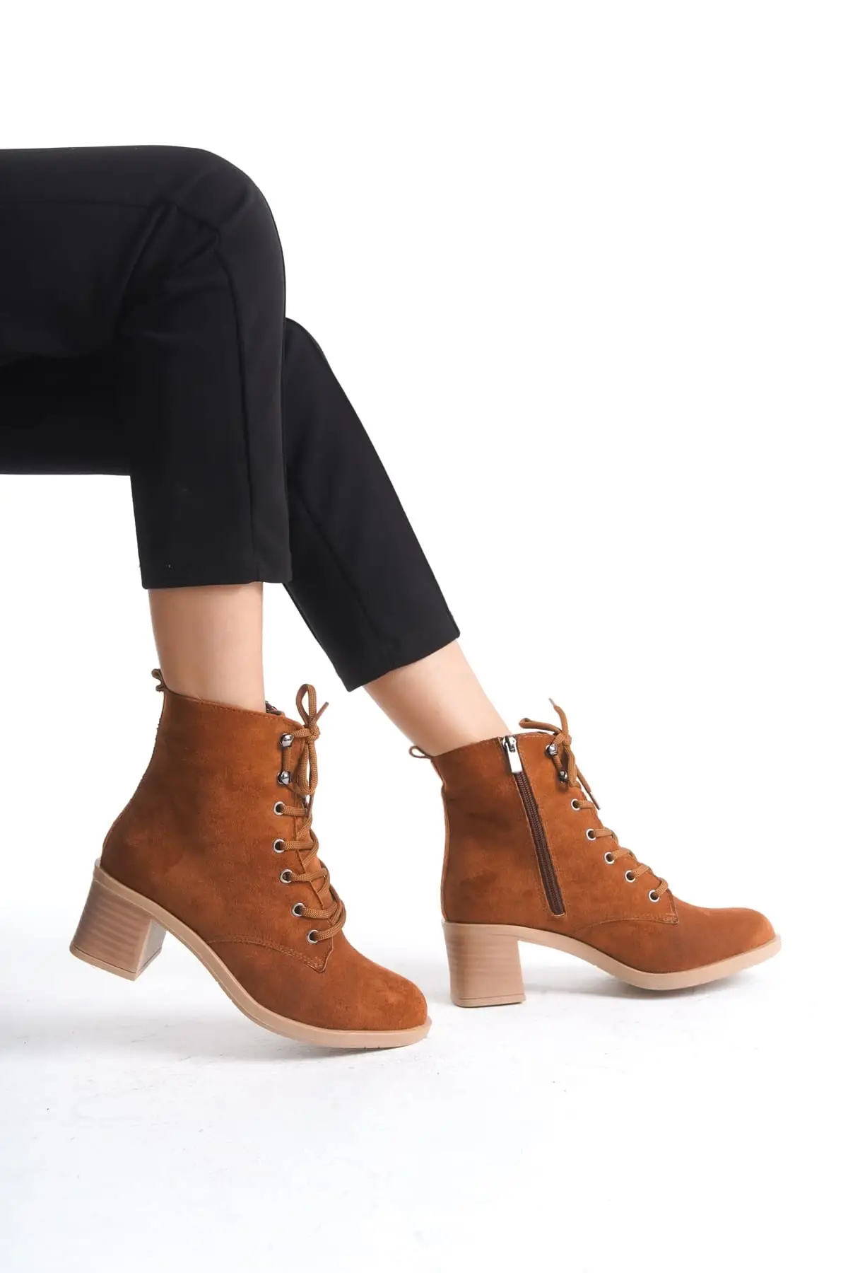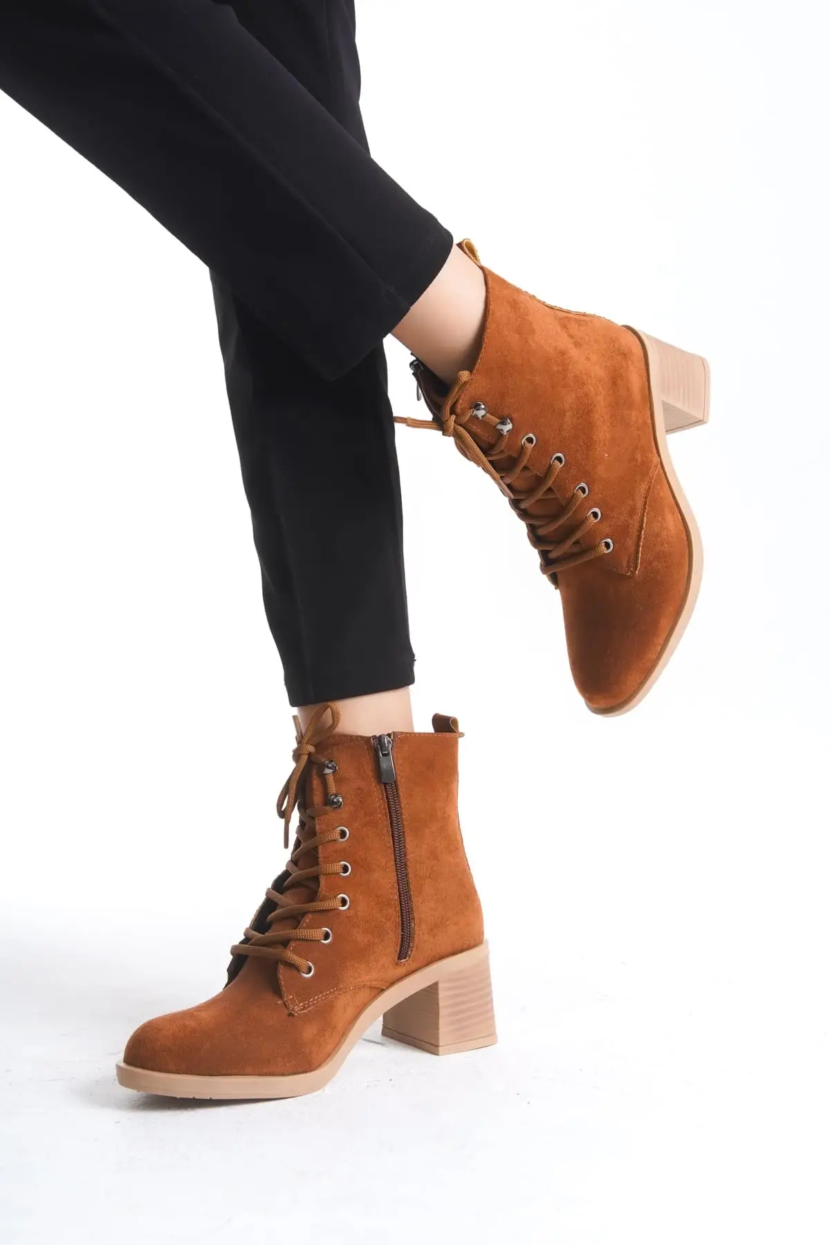 Lena Bağcıklı Fermuarlı Ortopedik Taban Topuklu Süet Kadın Bot Tt - Taba