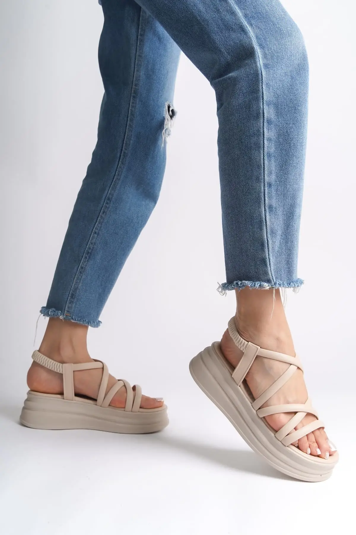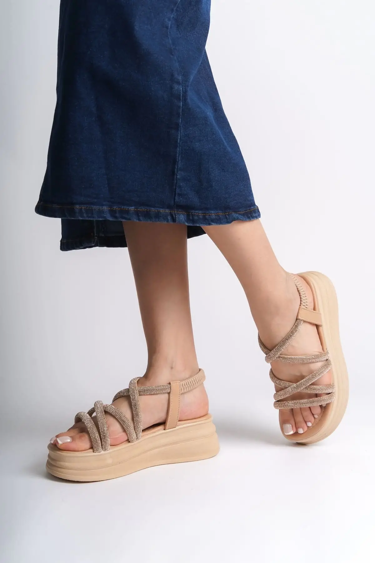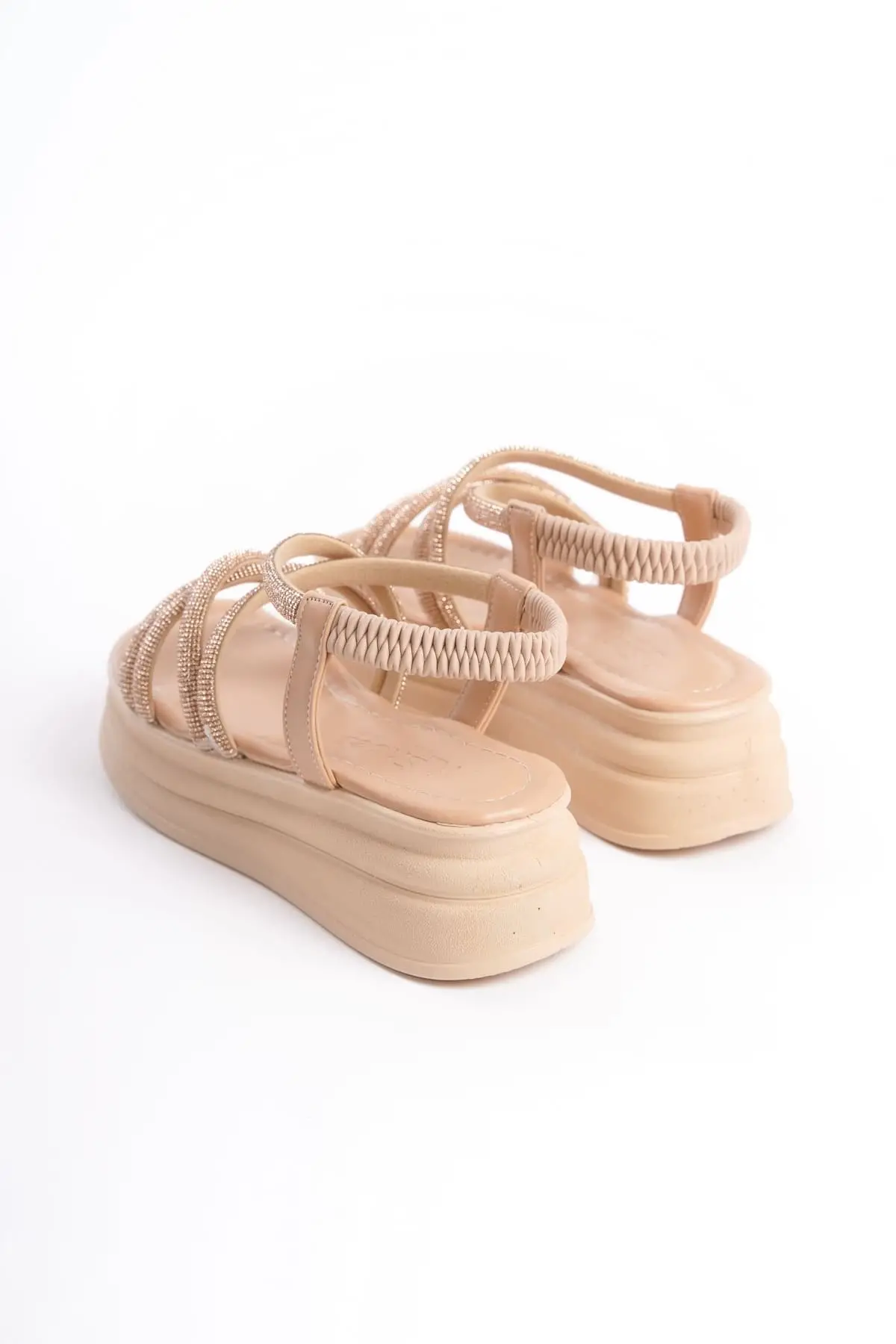 Elena Lastikli Taşlı Şeritli Ortopedik Taban Kadın Sandalet Tt - Ten