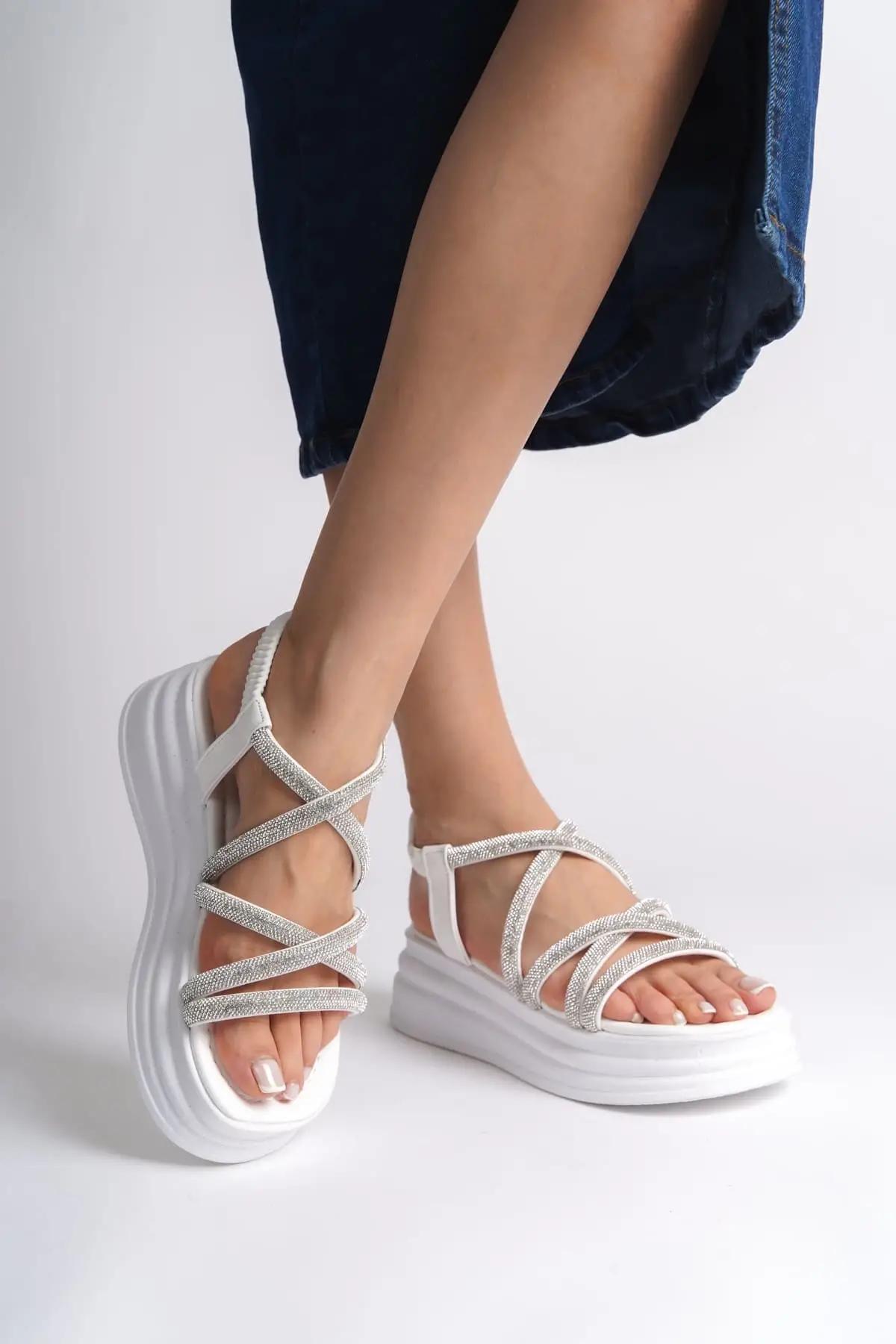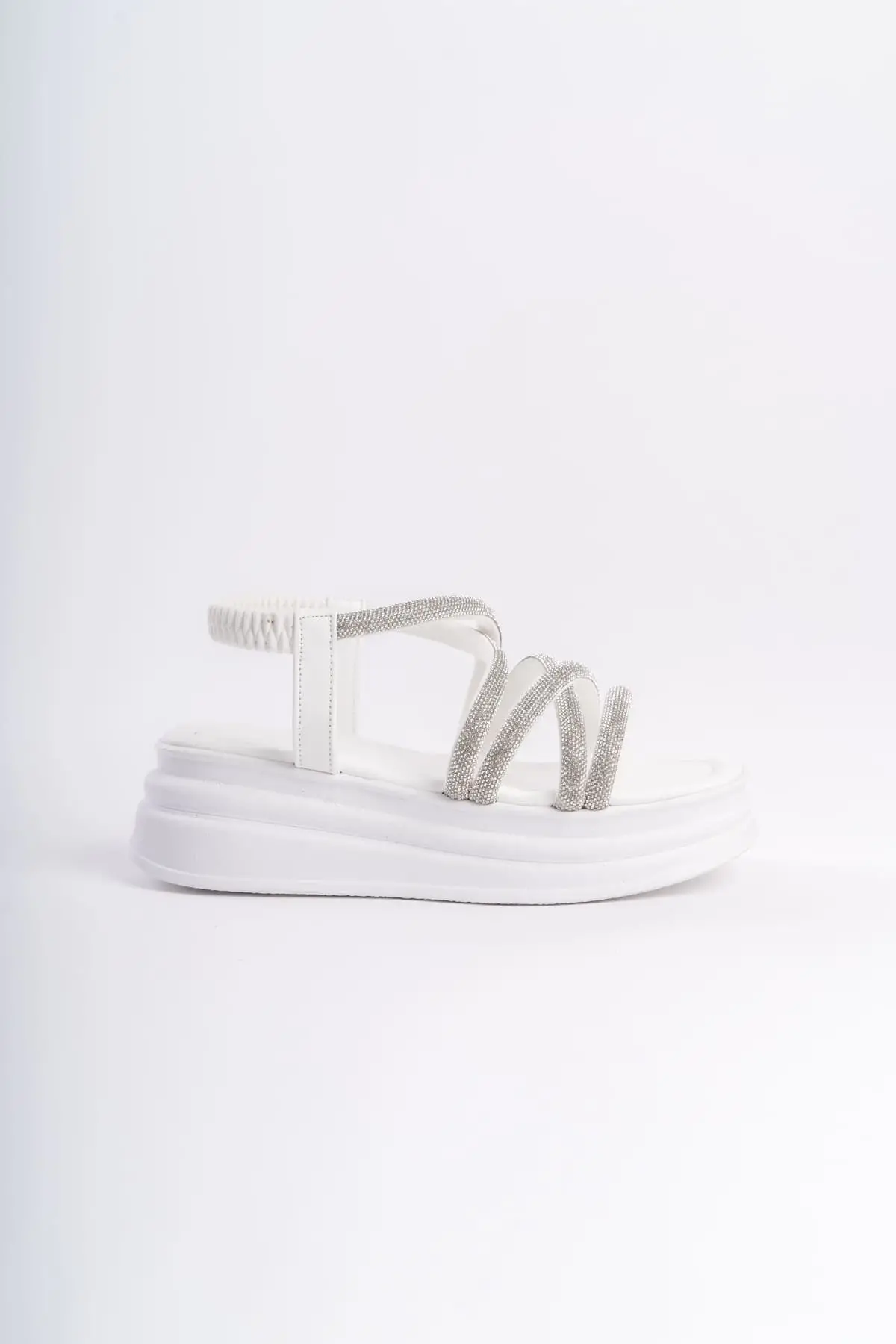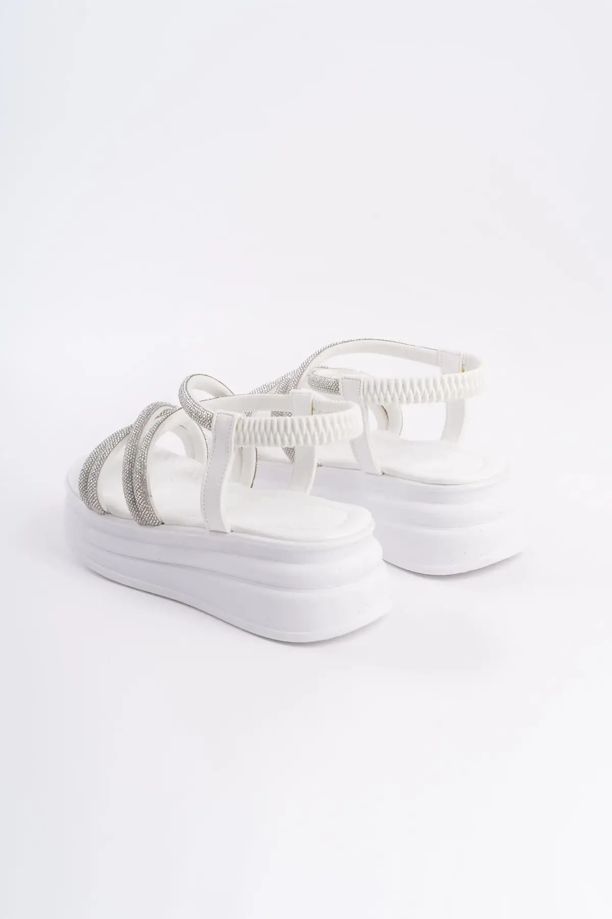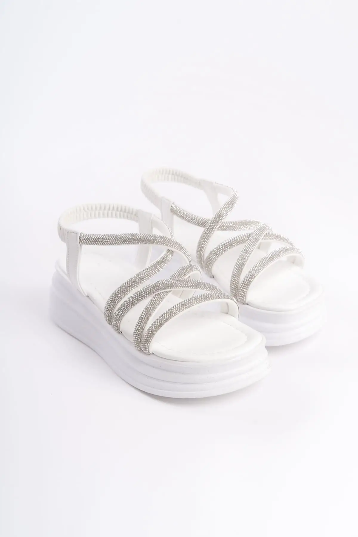 Elena Lastikli Taşlı Şeritli Ortopedik Taban Kadın Sandalet Bt - Beyaz