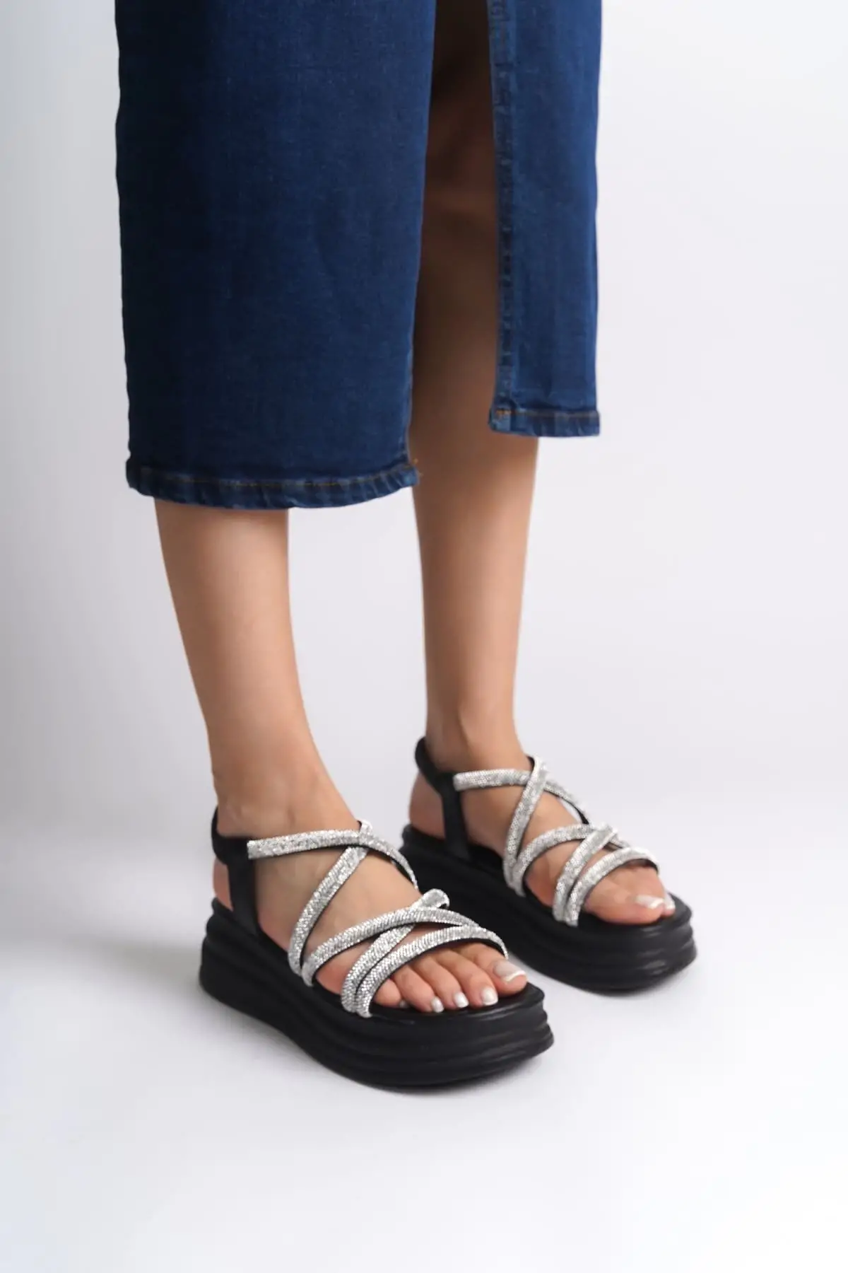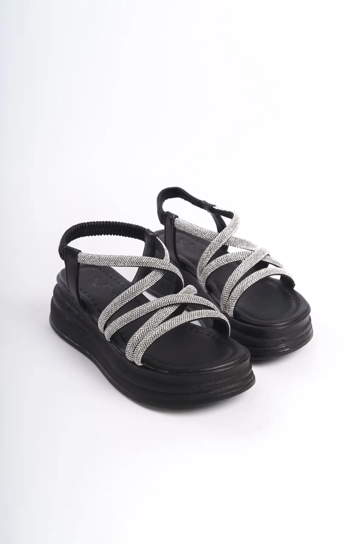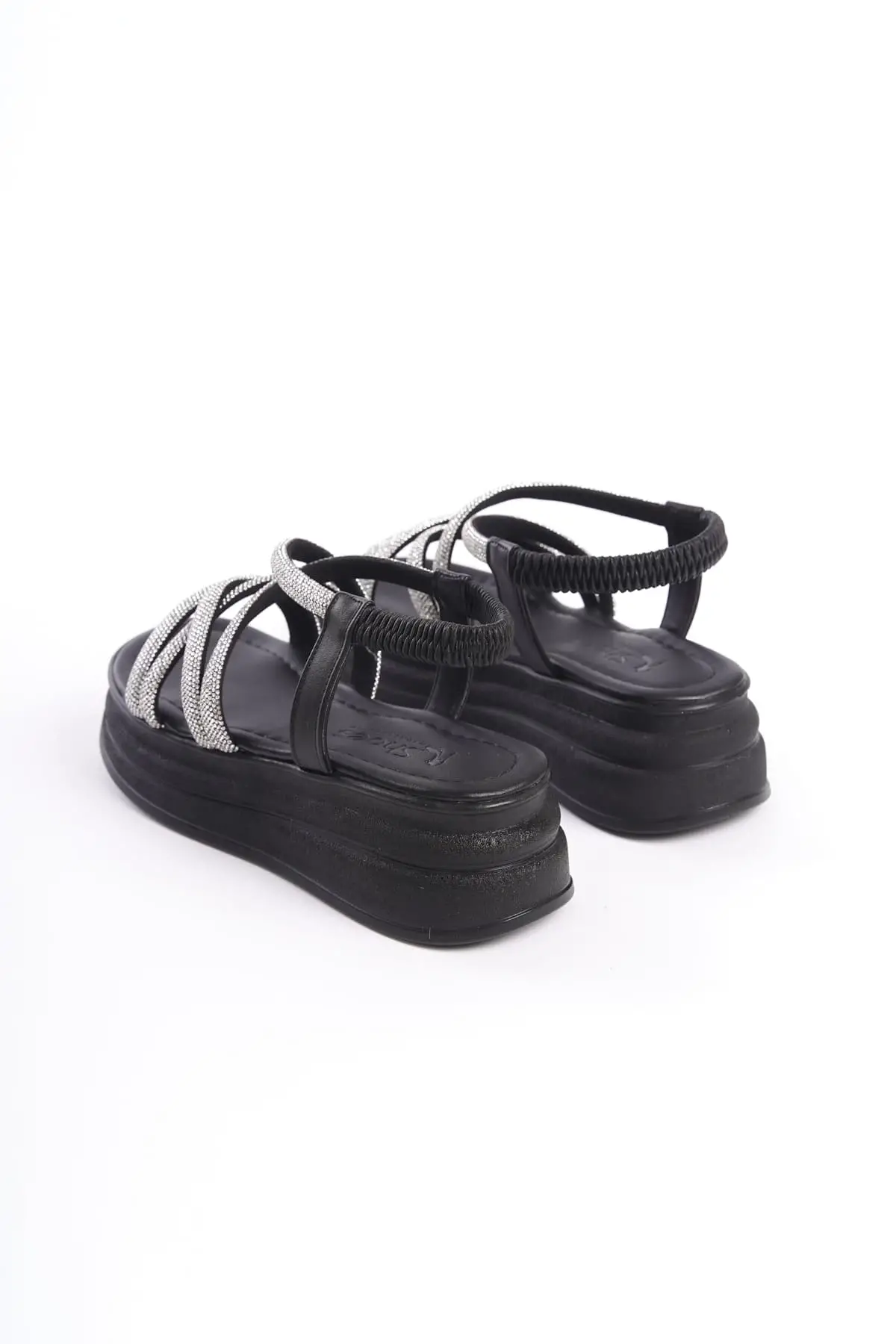 Elena Lastikli Taşlı Şeritli Ortopedik Taban Kadın Sandalet St - Siyah