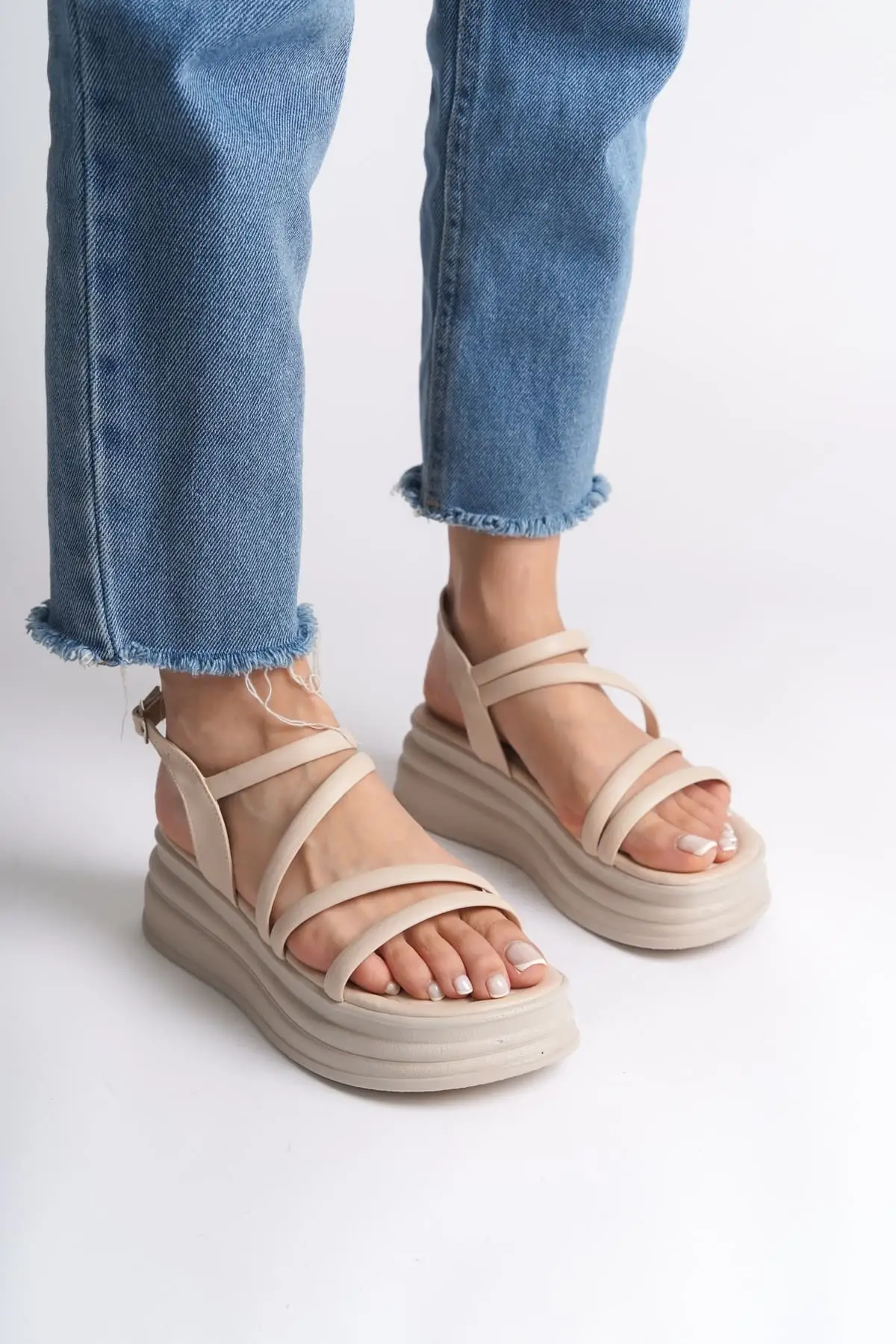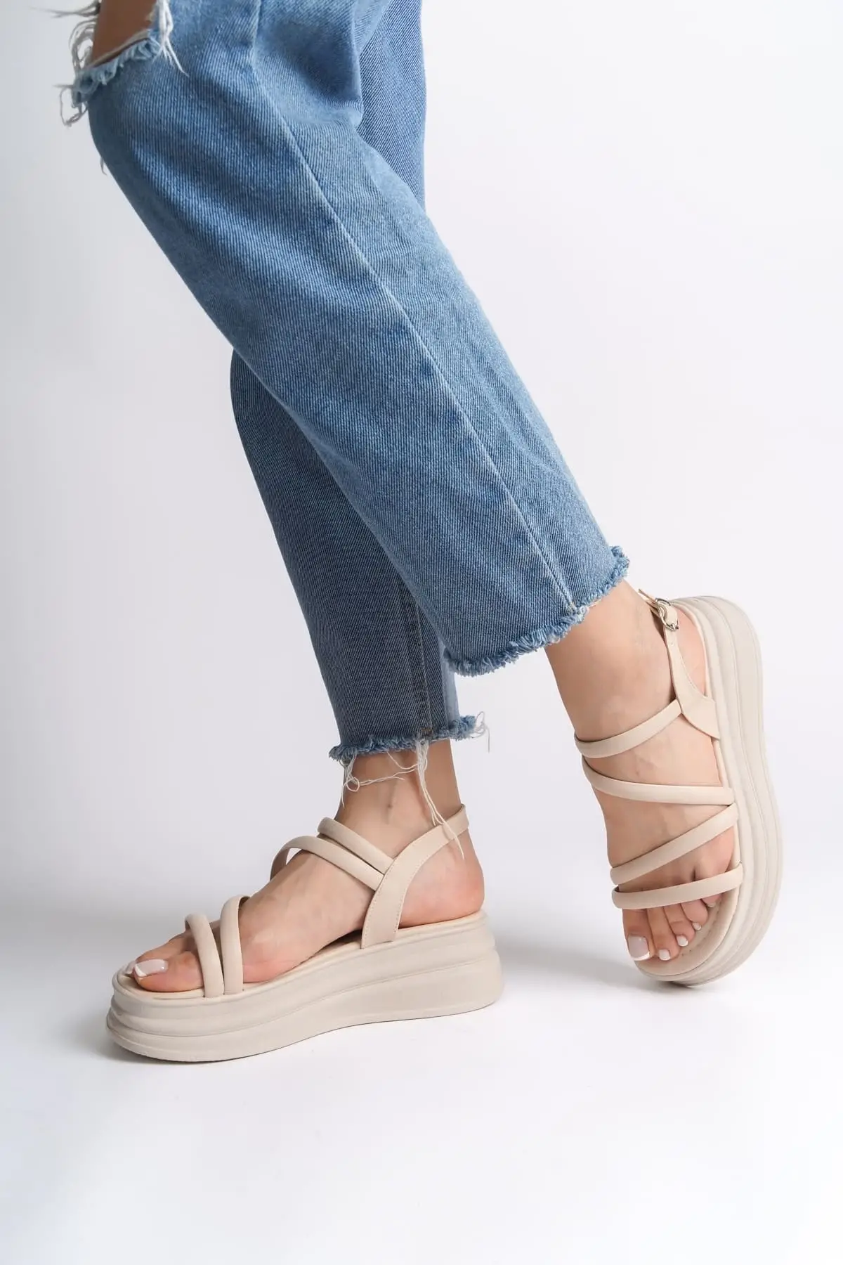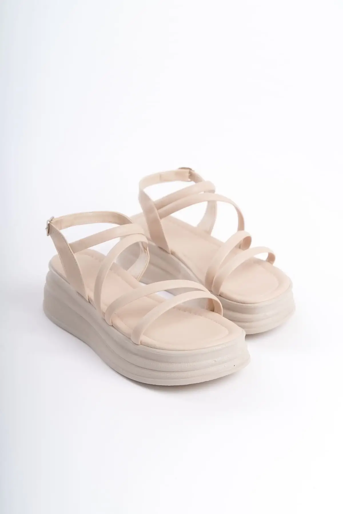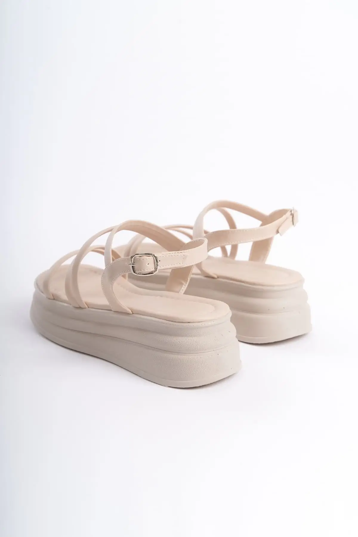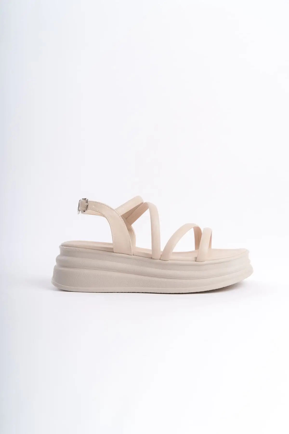 Natalıe İnce Tokalı Şerit Detaylı Ortopedik Taban Kadın Sandalet Kt - Krem