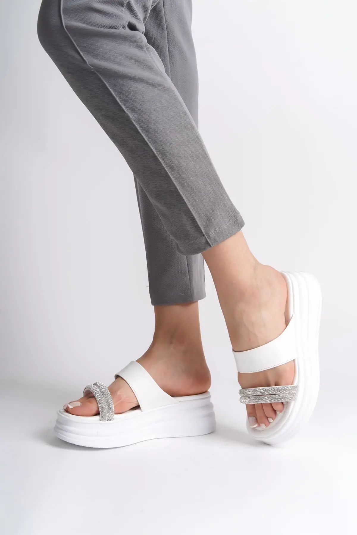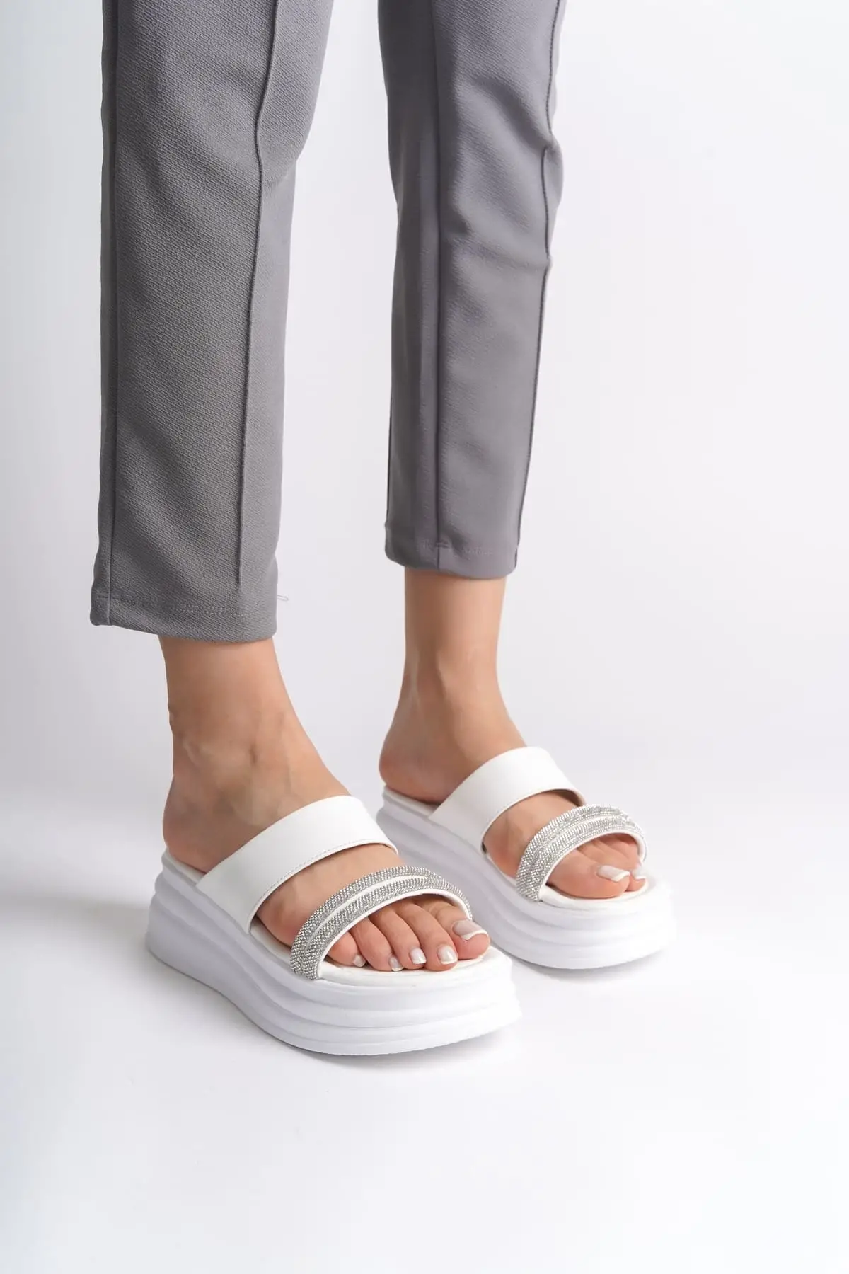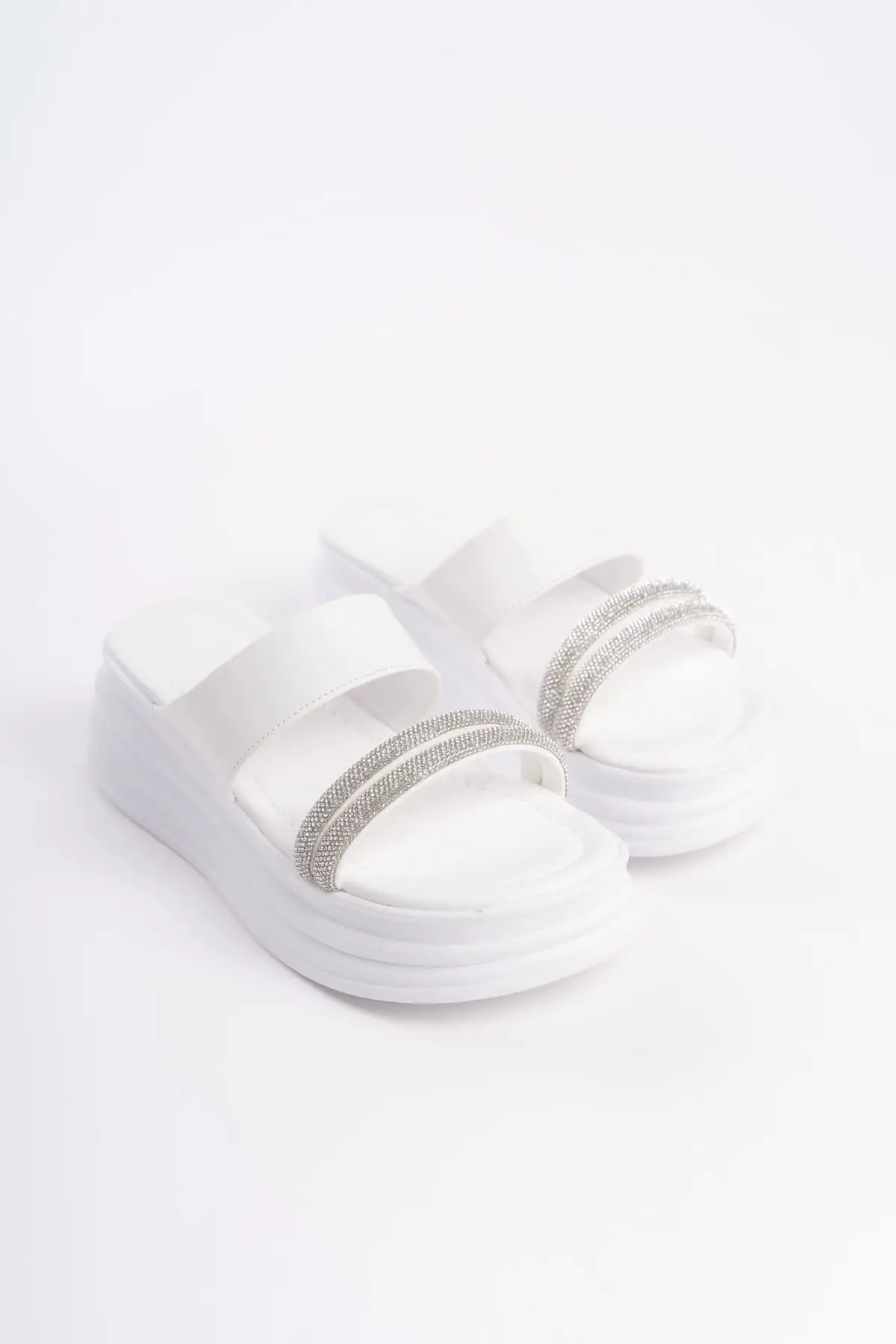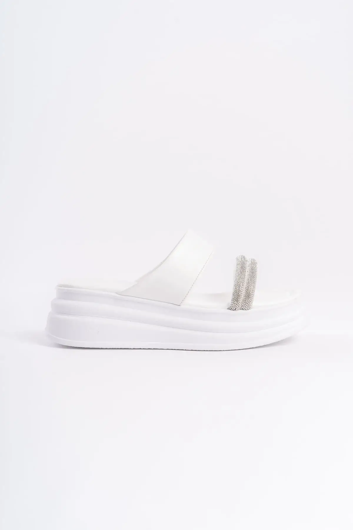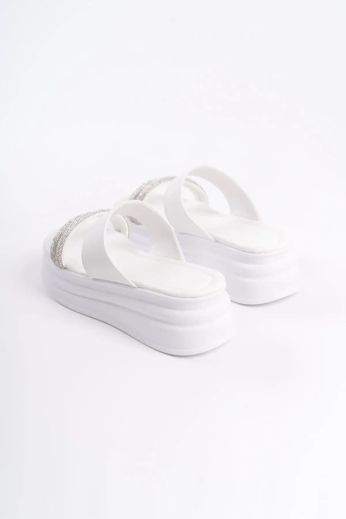 Sarah Düz Topuklu Taşlı Şeritli Kalın Ve Ortopedik Taban Kadın Terlik Bt - Beyaz