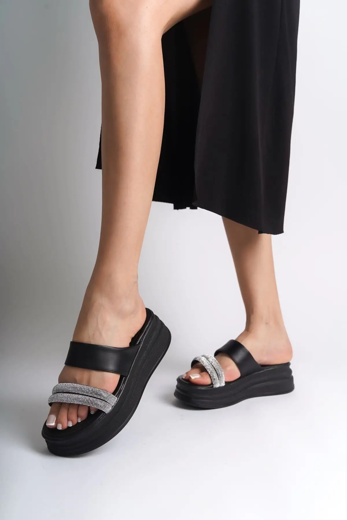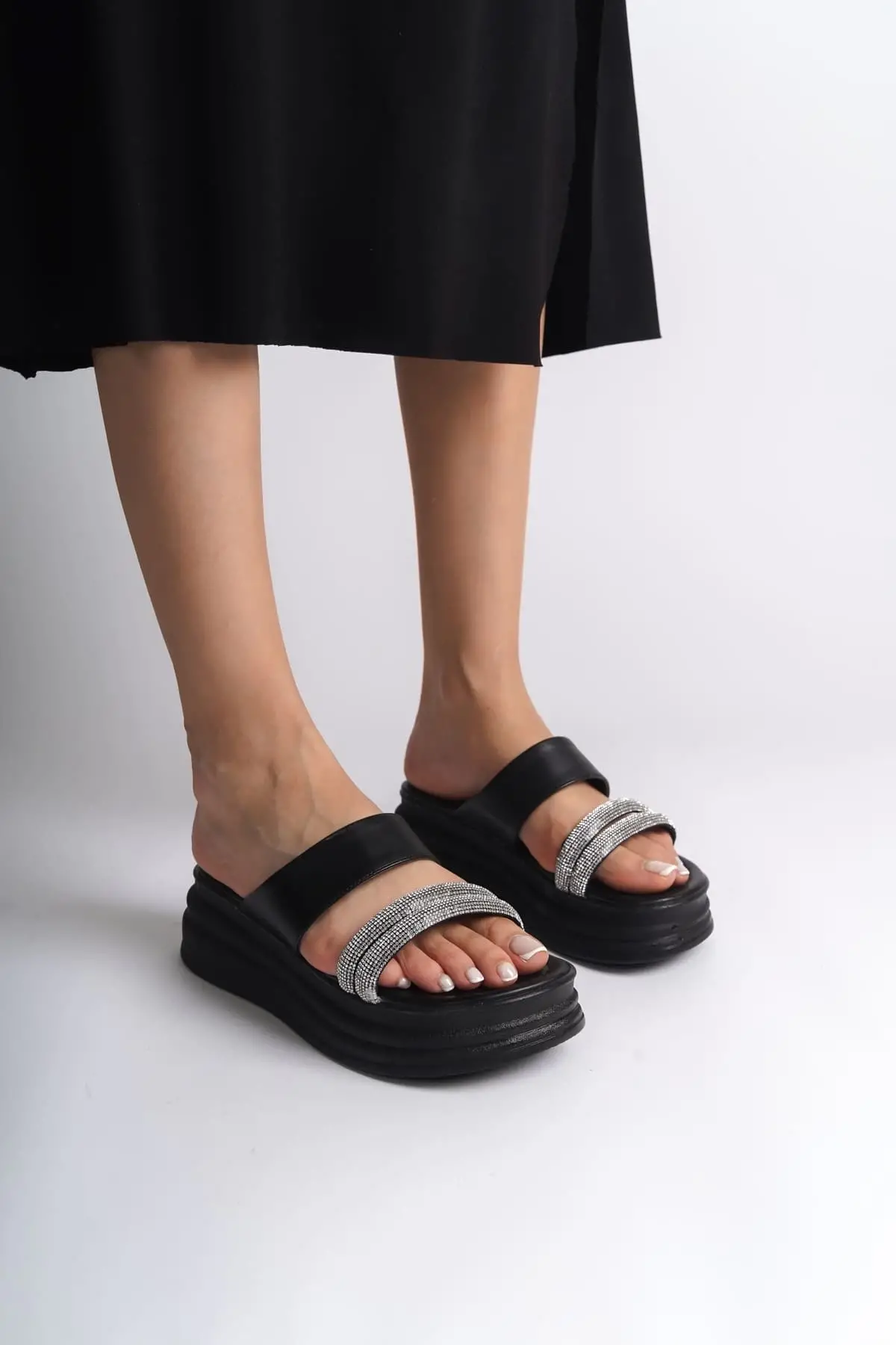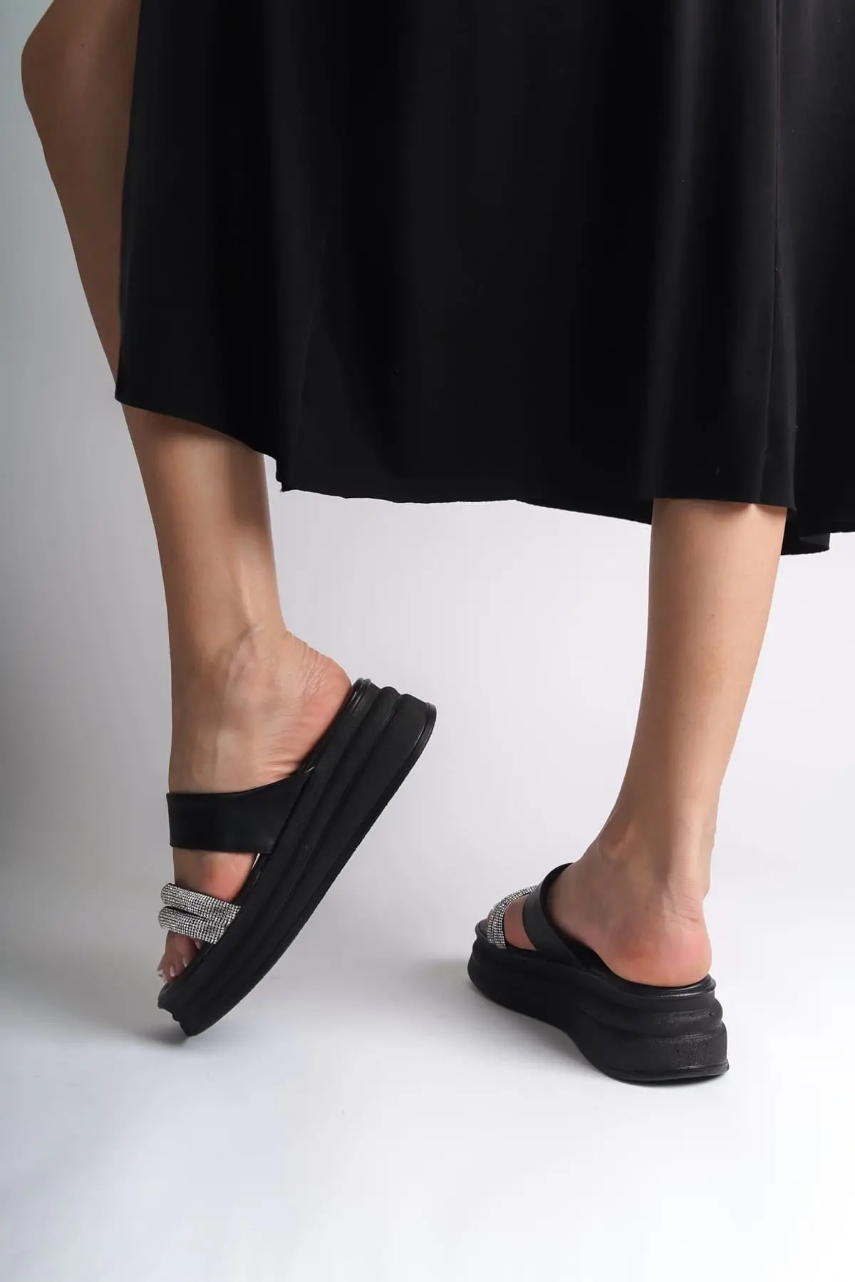Sarah Düz Topuklu Taşlı Şeritli Kalın Ve Ortopedik Taban Kadın Terlik St - Siyah