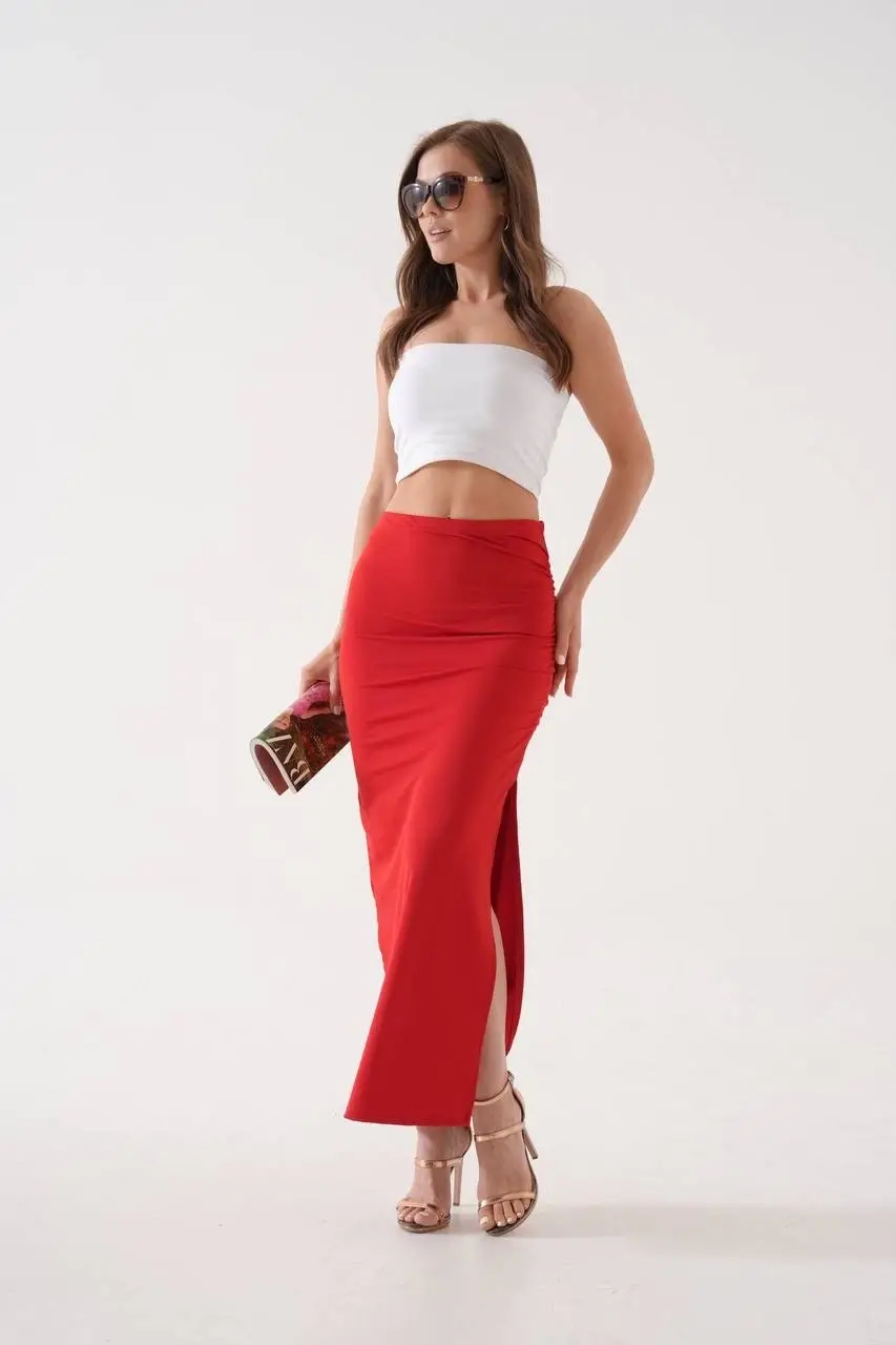 Uzun Yırtmaçlı İnce Kumaş Etek - Kırmızı Rahat ve şık tasarımı ile her mevsim tercih edebileceğiniz uzun etek modeli. Kırmızı rengi ile dikkat çeken etek, kombinlerinize canlılık katacak. Polyester ve elastan karışımı ince kumaşı sayesinde gün boyu konfor sunar. Bel kısmında bulunan lastik detayı sayesinde rahatça giyip çıkarabilirsiniz. İnce yırtmaçlarıyla hareket kazanan etek, feminen bir görünüm sağlar. Ofis, günlük ya da özel davetlerde şık kombinler oluşturabileceğiniz ideal bir parça.