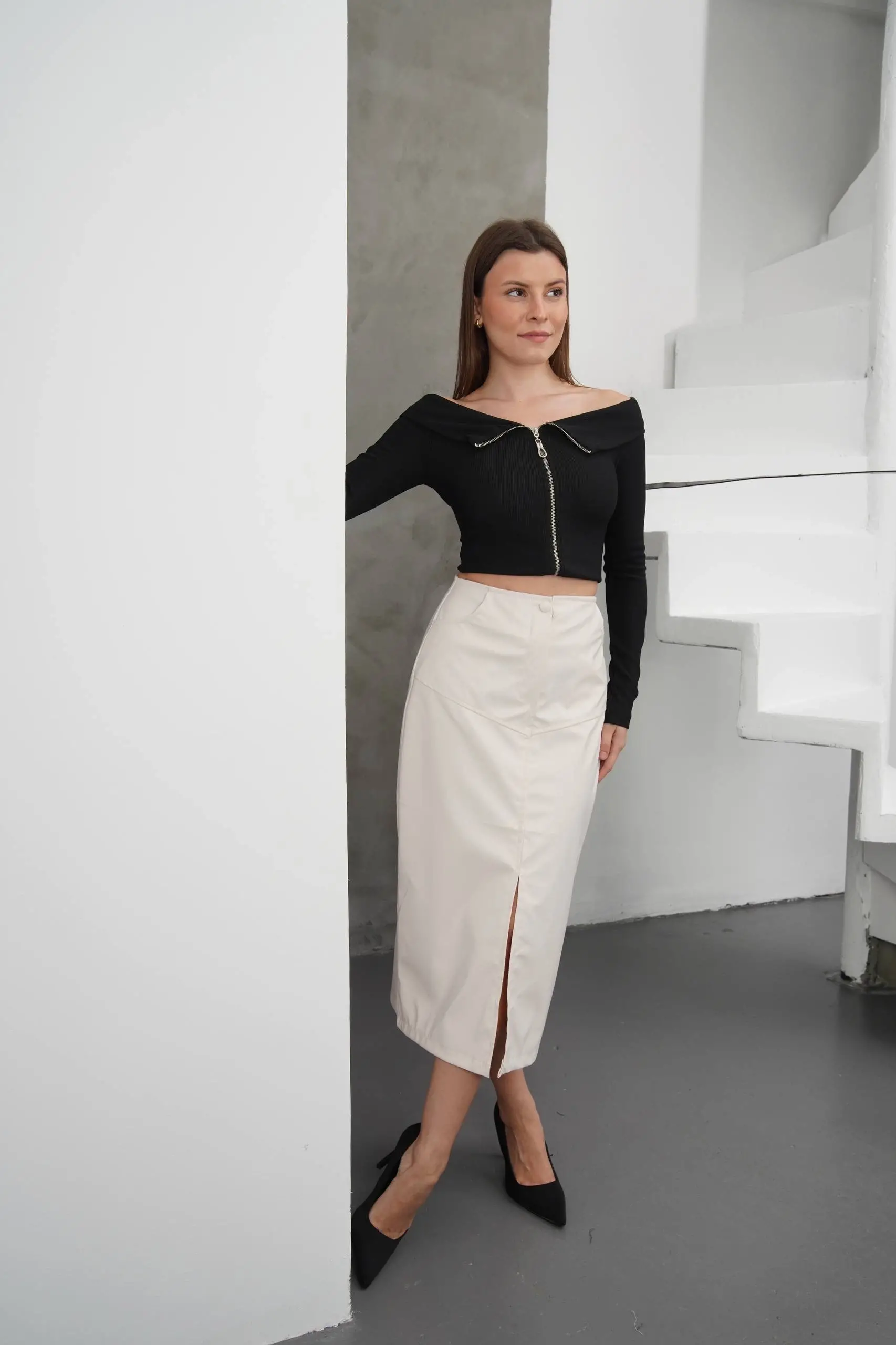 Yırtmaçlı uzun deri etek krem rengiyle gardırobunuza şıklık katacak bir parçadır.
